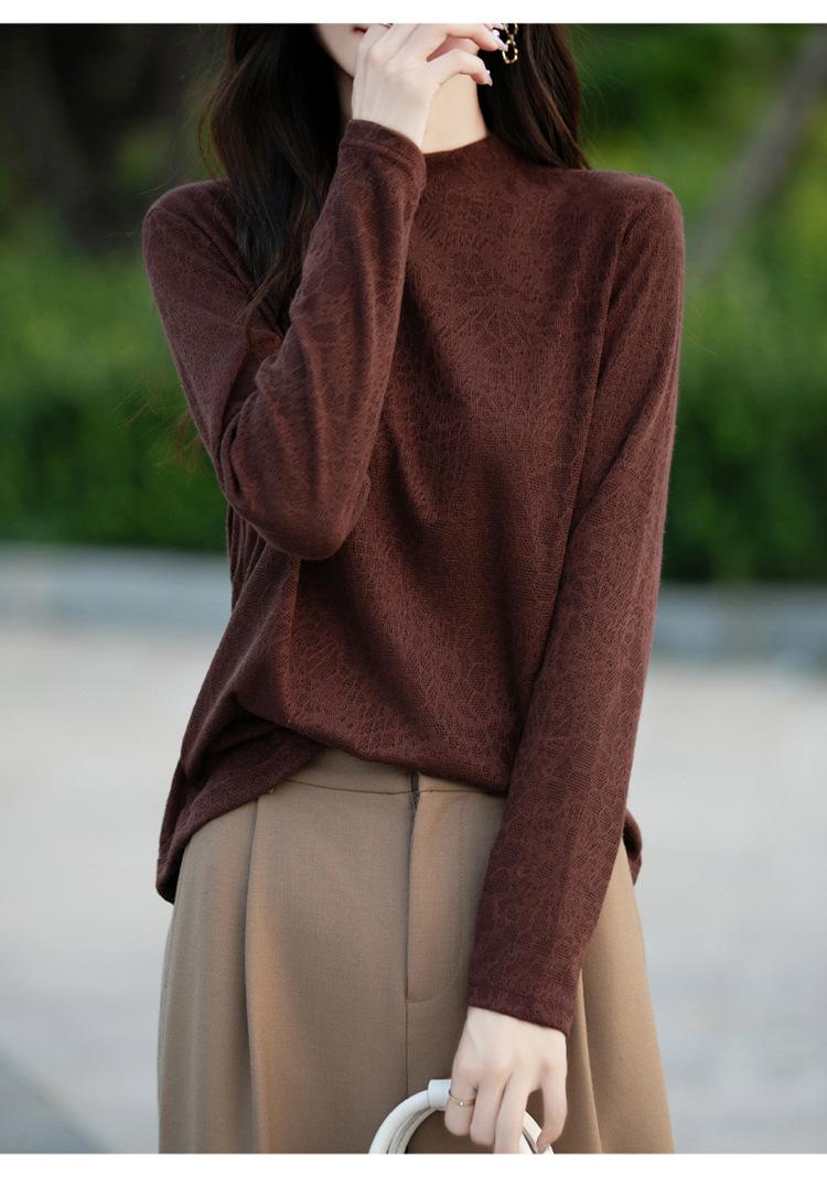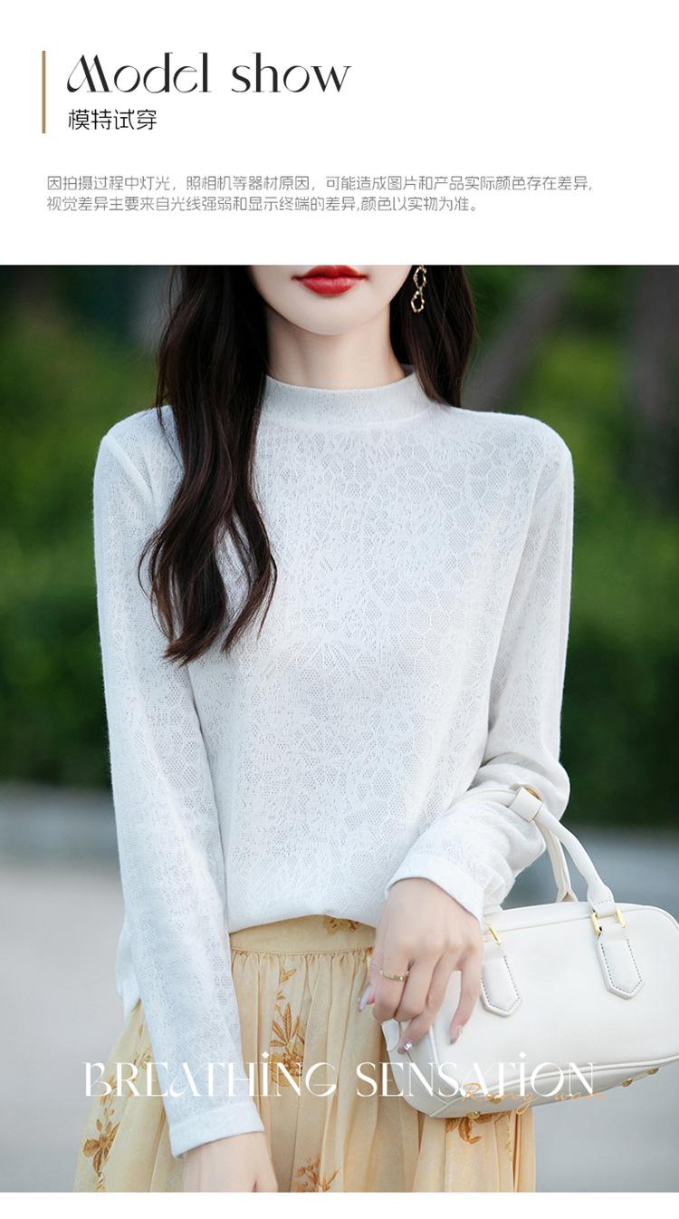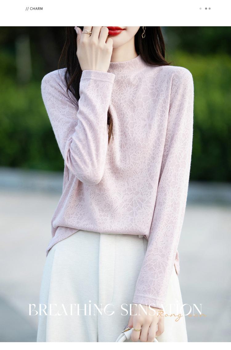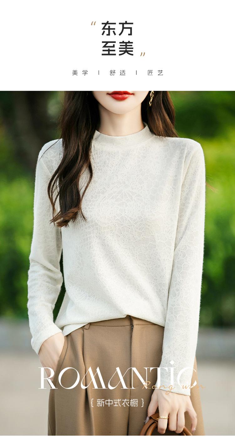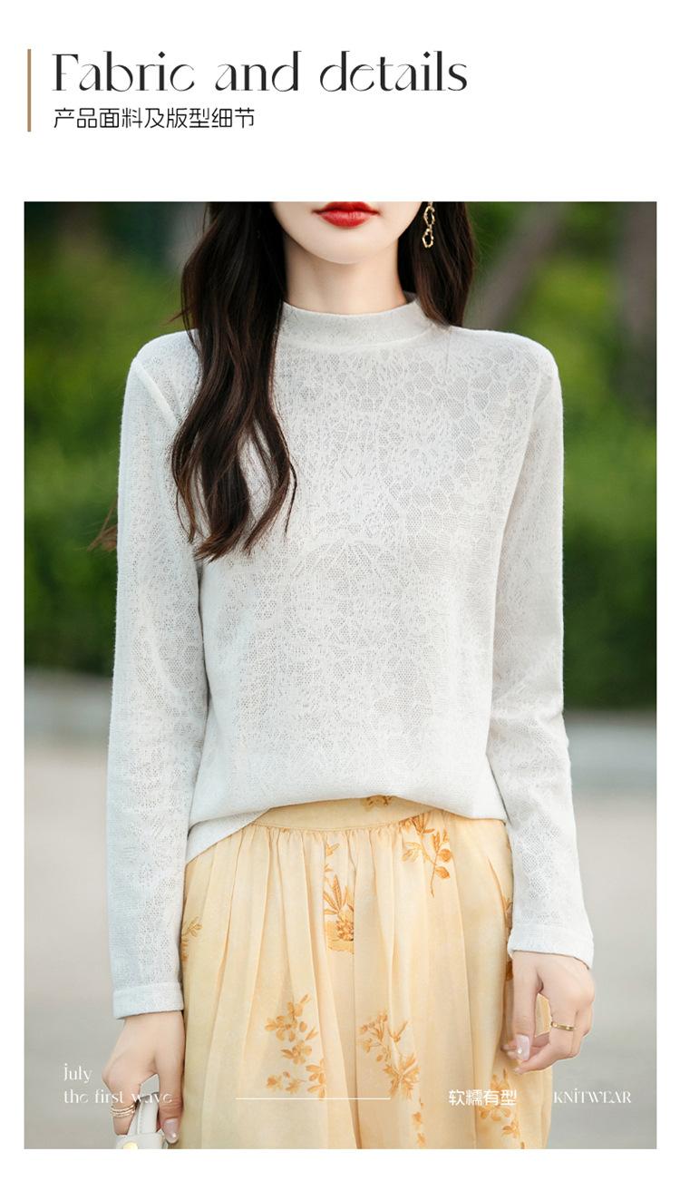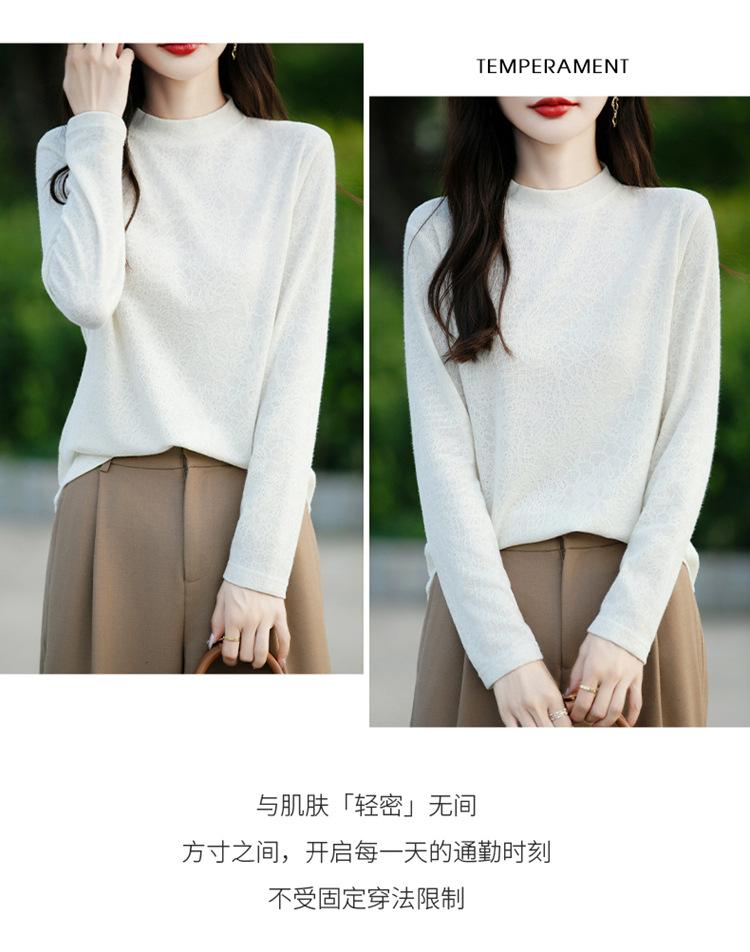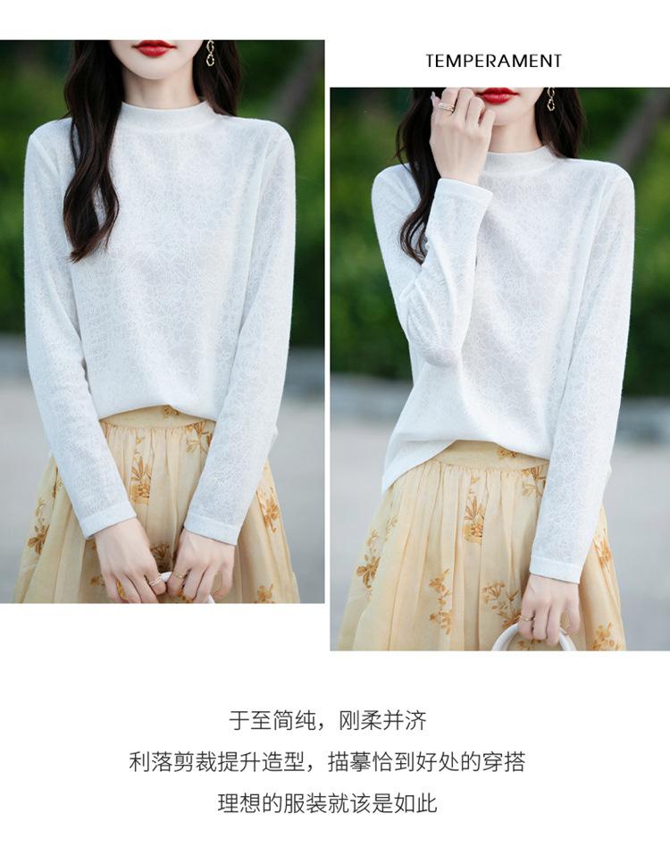 Tejido de Punto de Cuello Alto Medio de Primavera y Otoño Transfronterizo para Mujer, Jacquard de Seda Brillante, Manga Larga, Tejido de Punto, Elegante Encaje de Ganchillo, Camiseta Básica