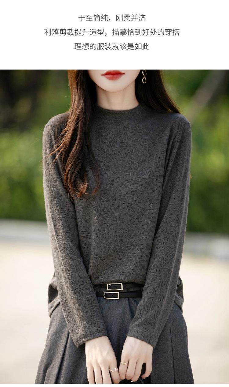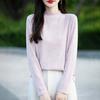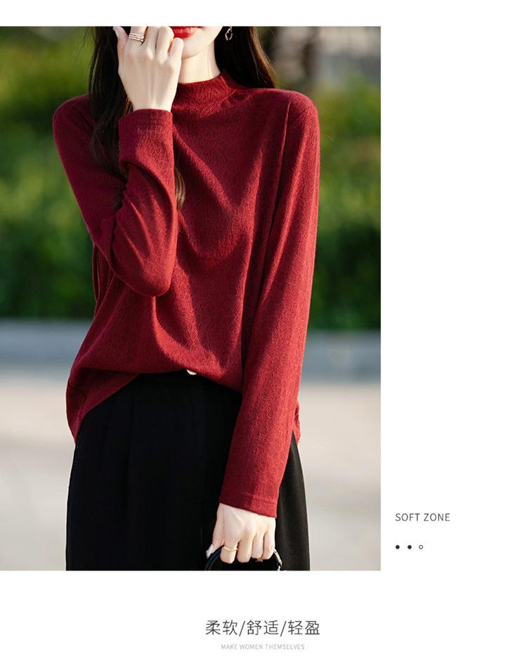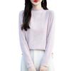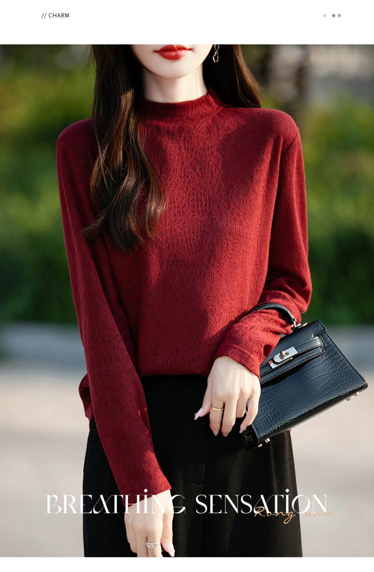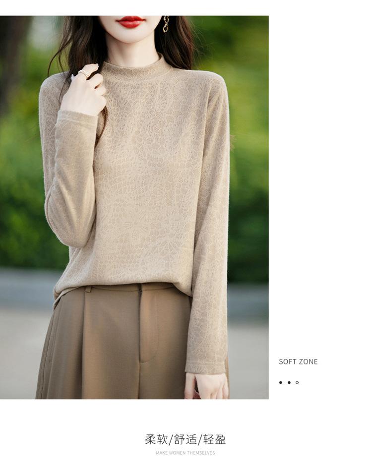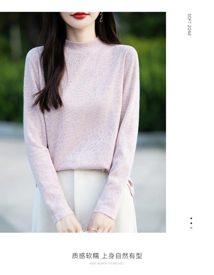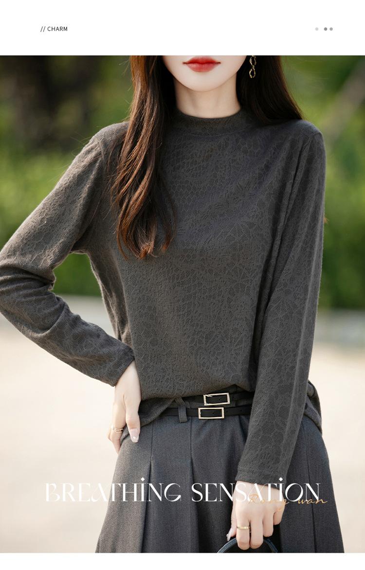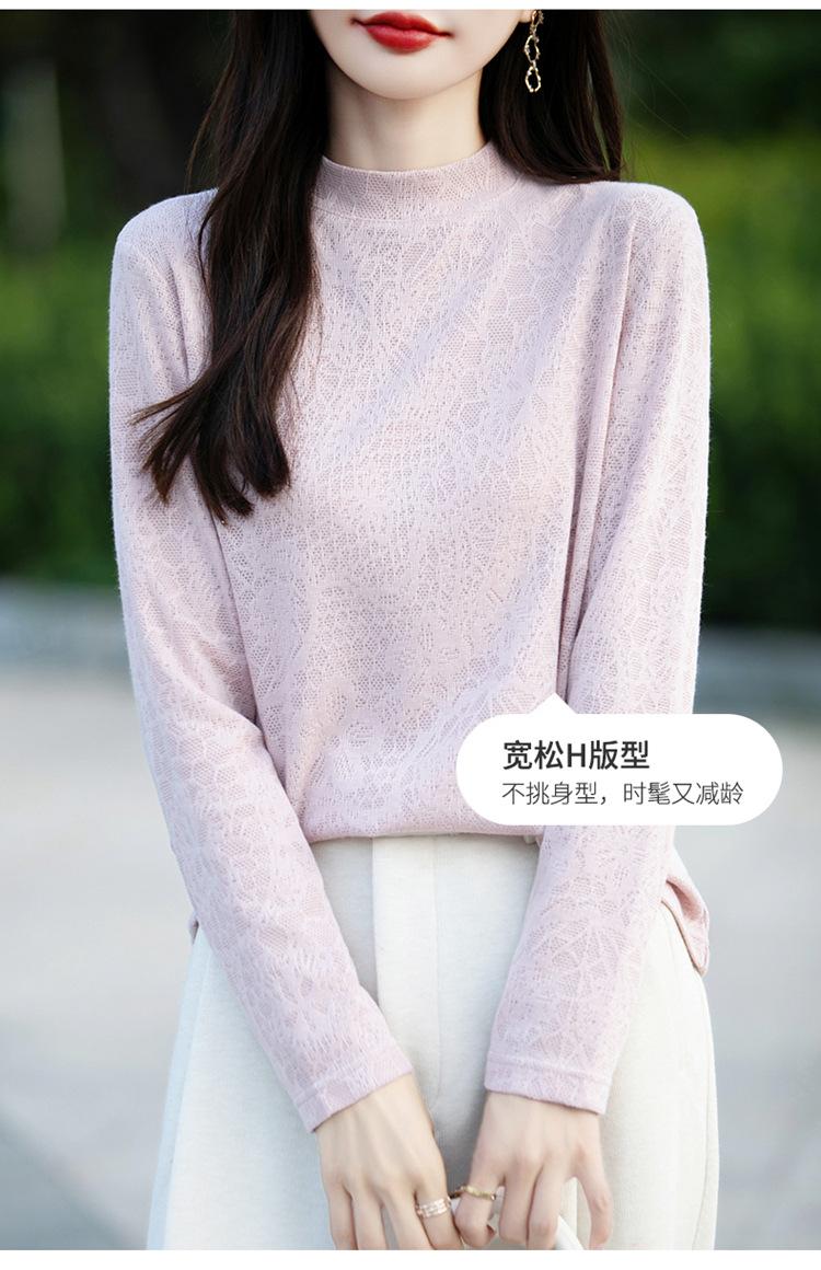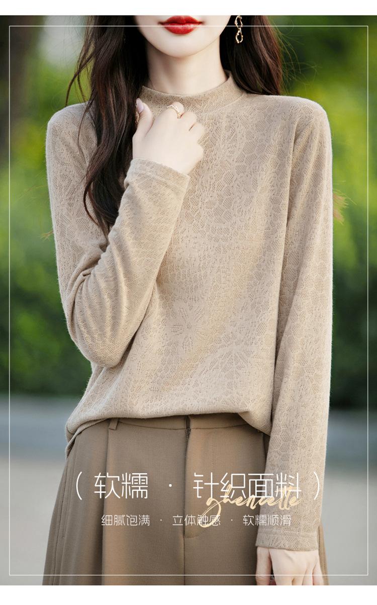 Tejido de Punto de Cuello Alto Medio de Primavera y Otoño Transfronterizo para Mujer, Jacquard de Seda Brillante, Manga Larga, Tejido de Punto, Elegante Encaje de Ganchillo, Camiseta Básica