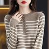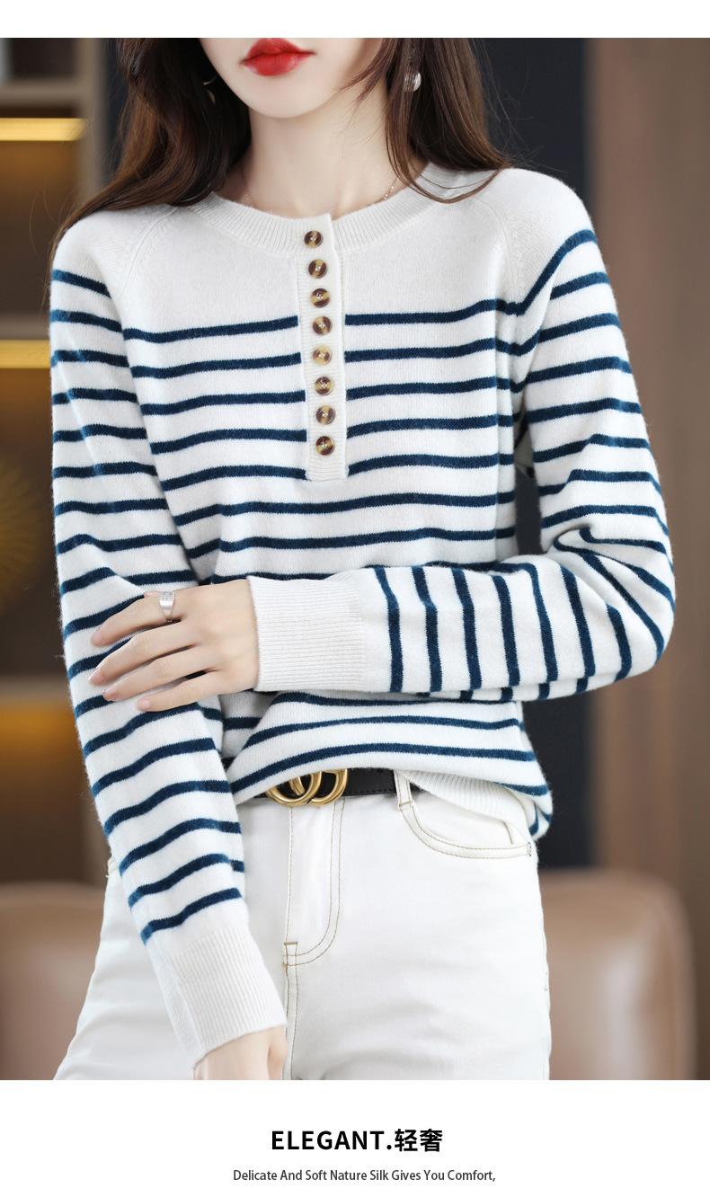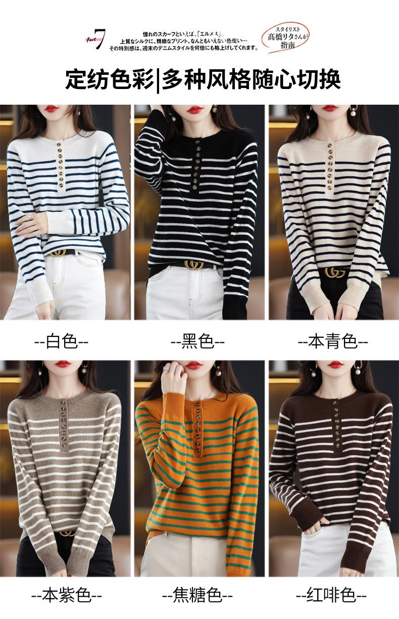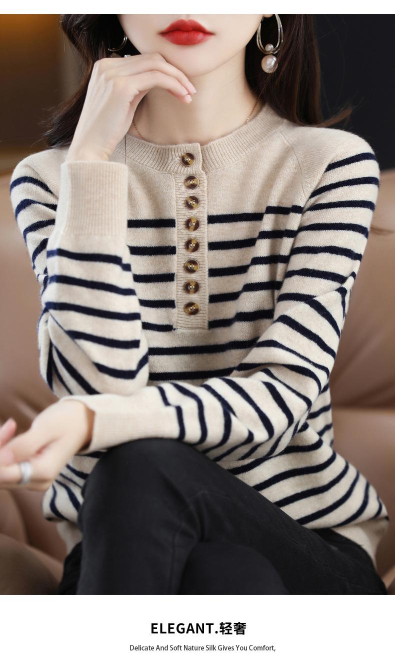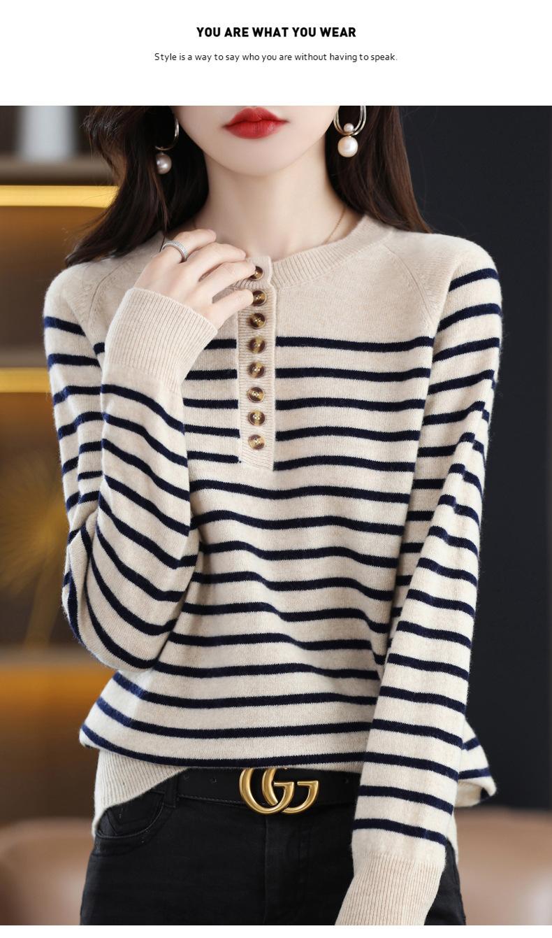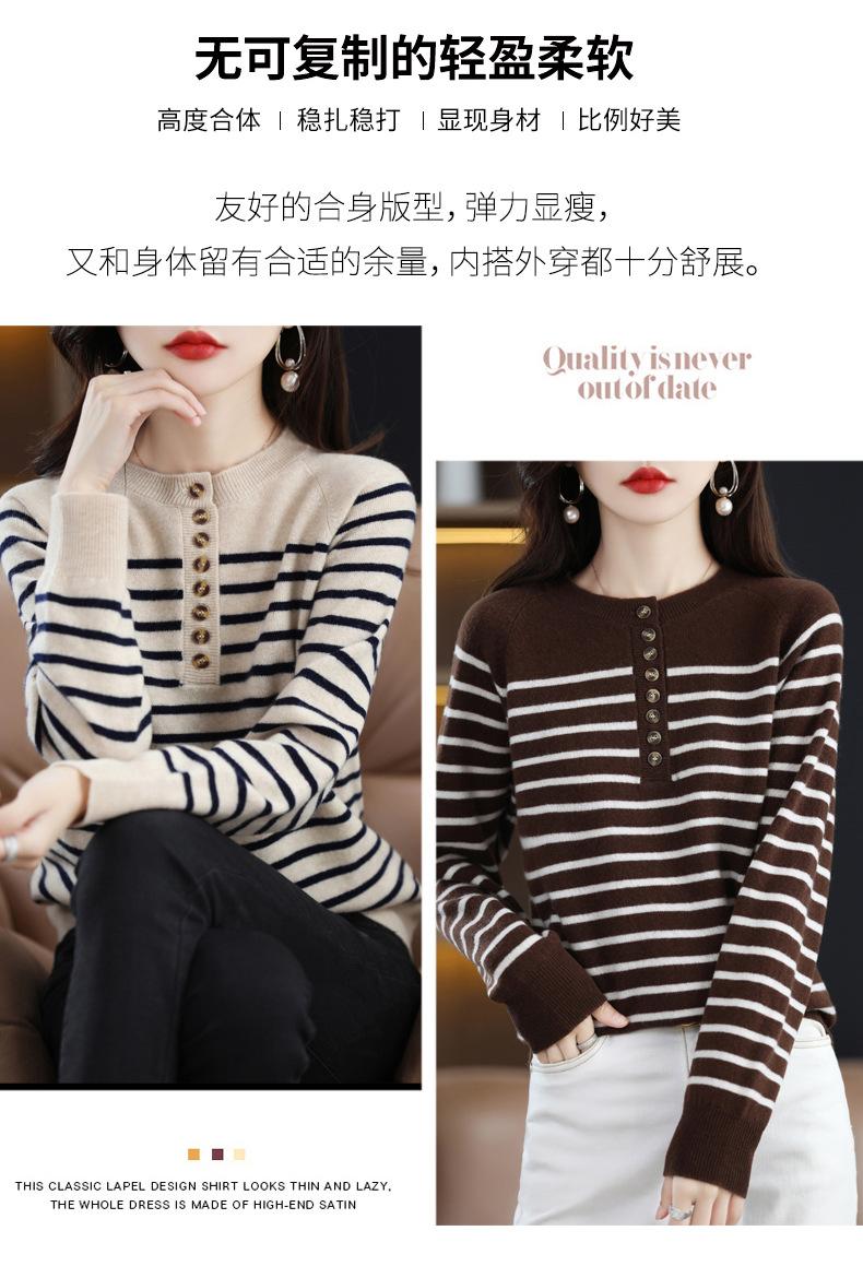 Suéter de Lana Tejida Nuevo de Otoño e Invierno 2023 para Mujer, Jersey de Cuello Redondo, Cárdigan Medio, Camiseta Básica, Suéter de Lana a Rayas para Exterior