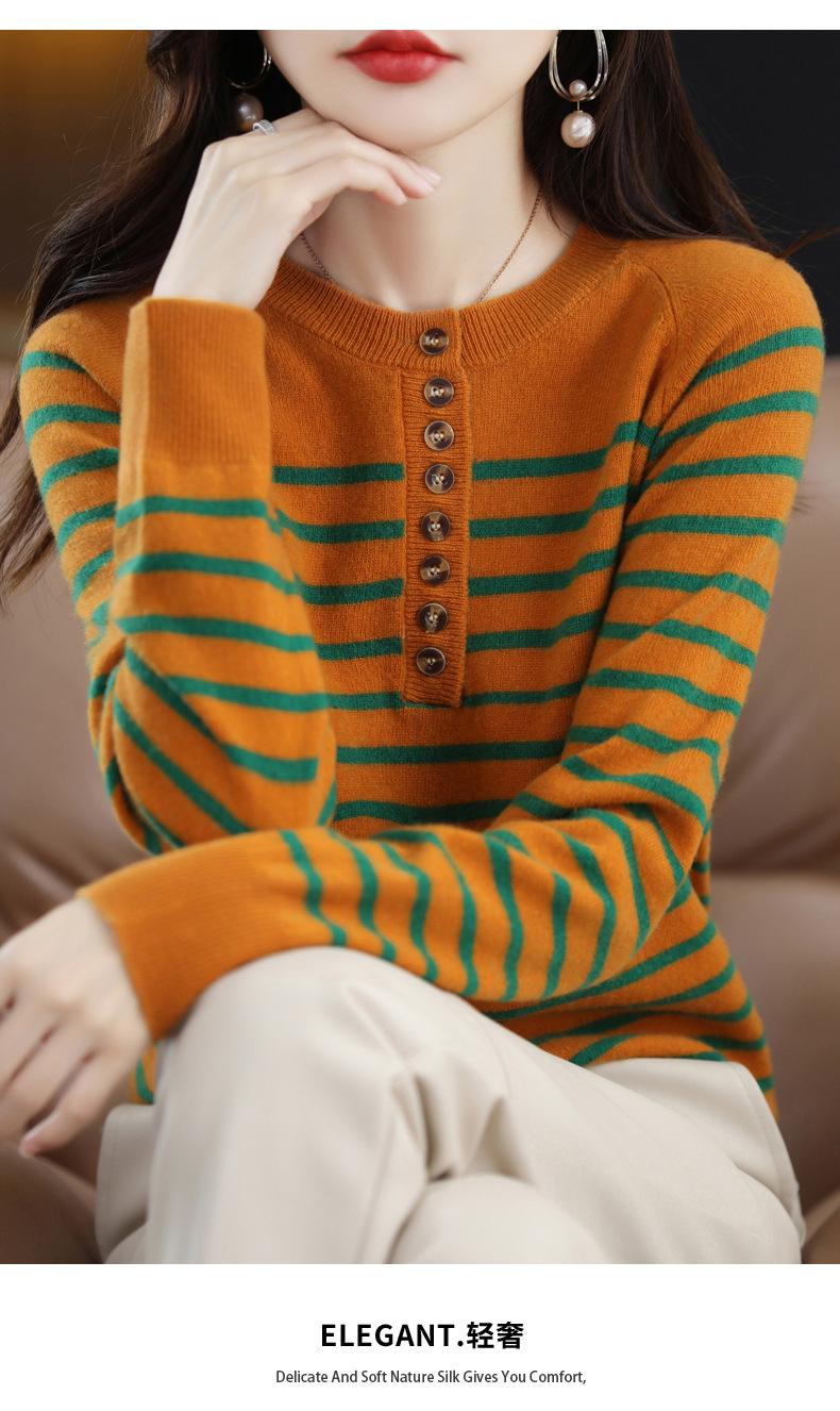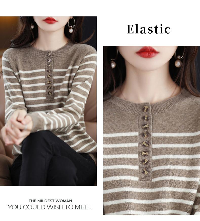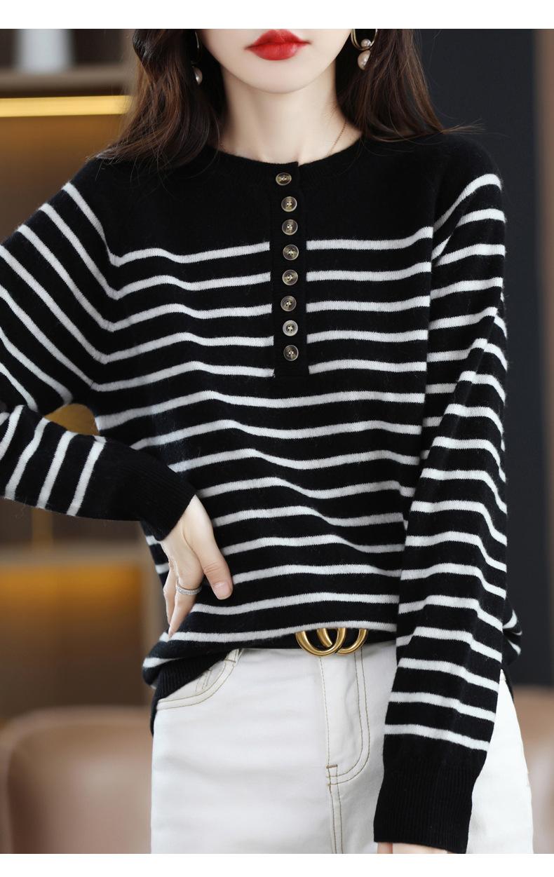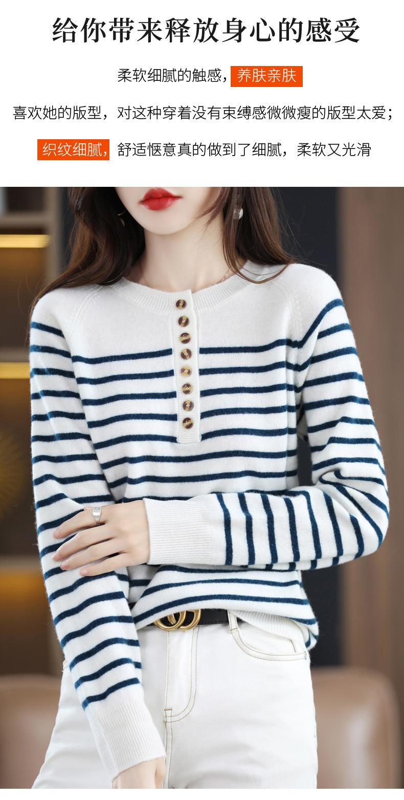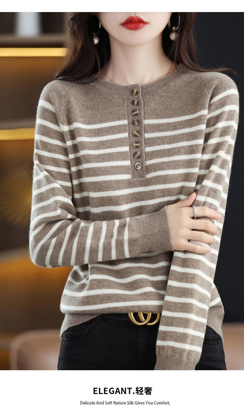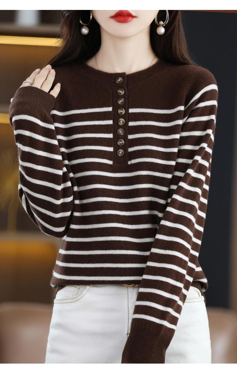 Suéter de Lana Tejida Nuevo de Otoño e Invierno 2023 para Mujer, Jersey de Cuello Redondo, Cárdigan Medio, Camiseta Básica, Suéter de Lana a Rayas para Exterior