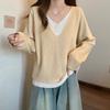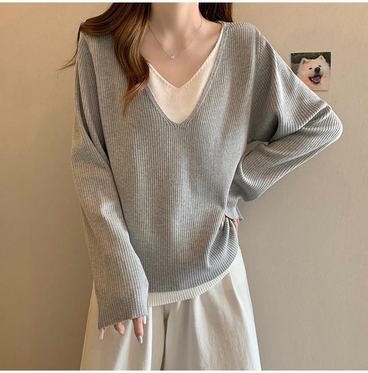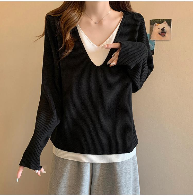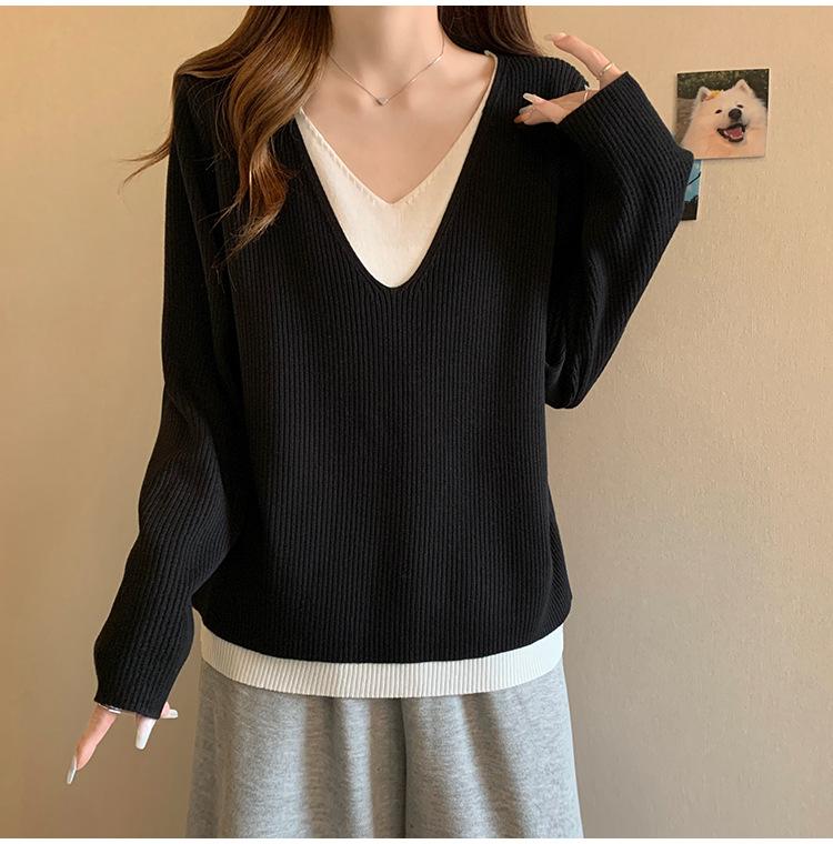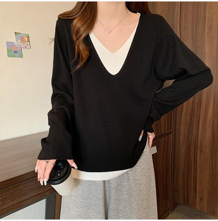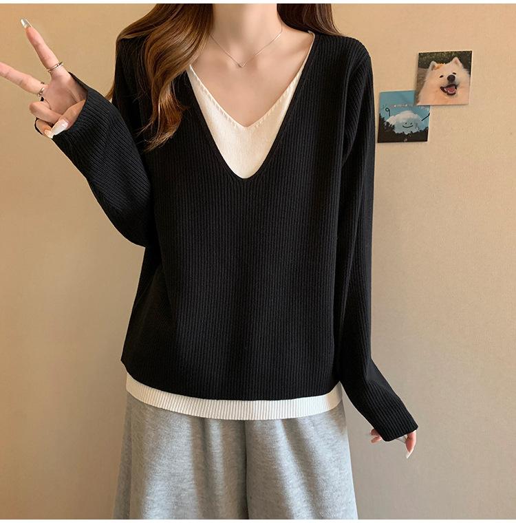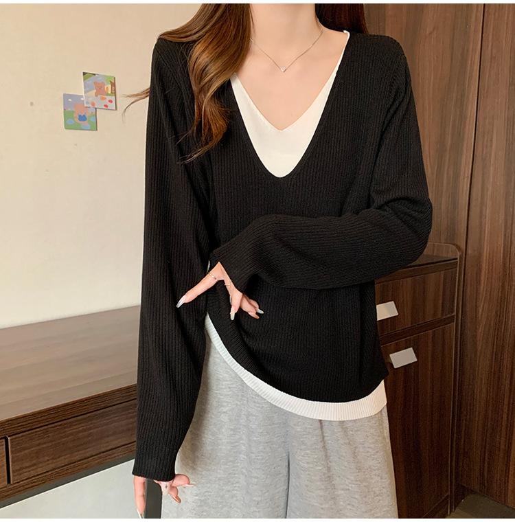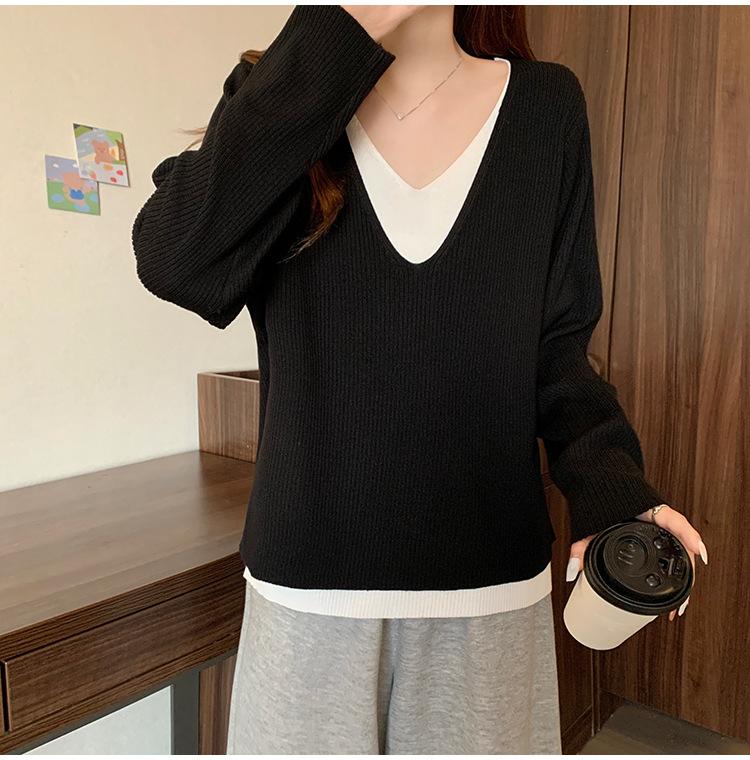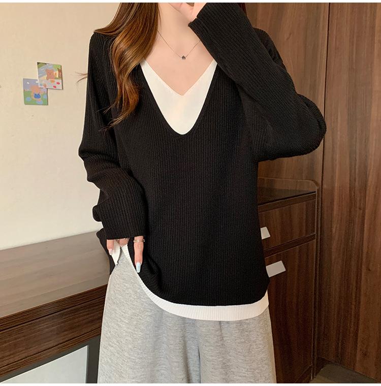 Suéter holgado ajustado de manga larga con cuello en V para mujer, otoño 2024, tejido de punto de dos piezas en contraste de color
