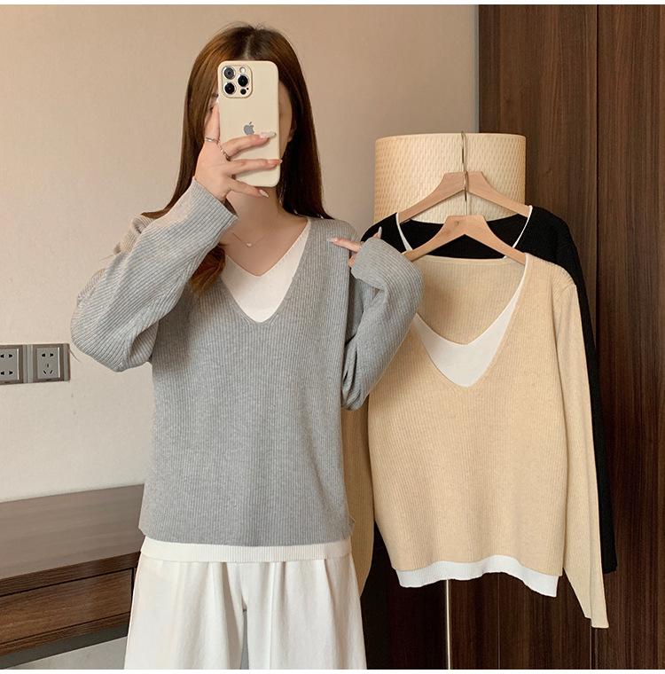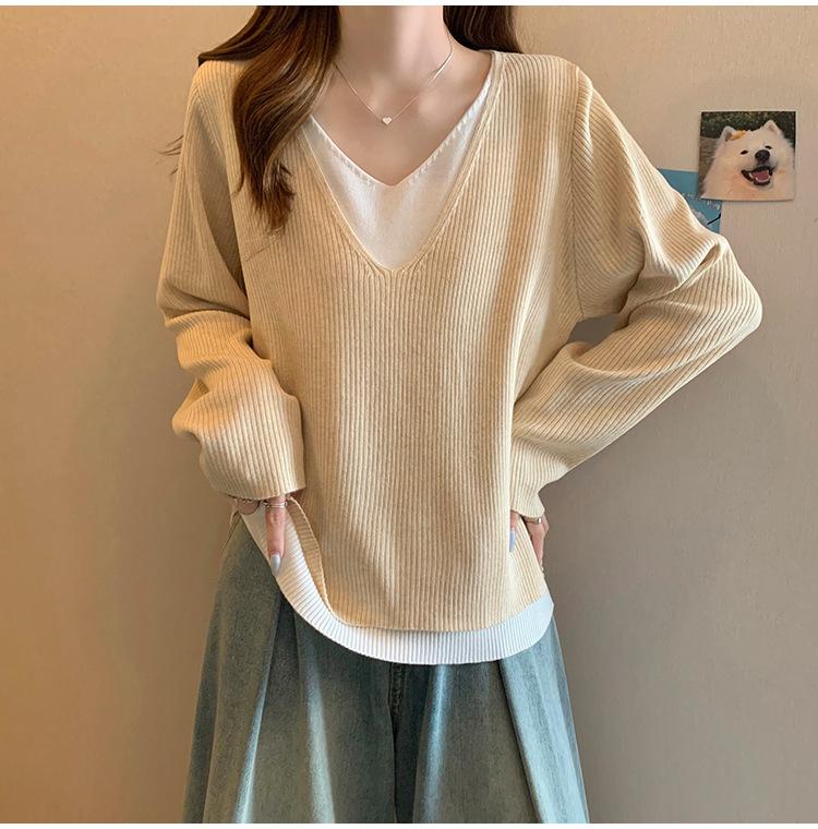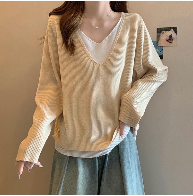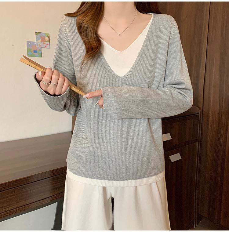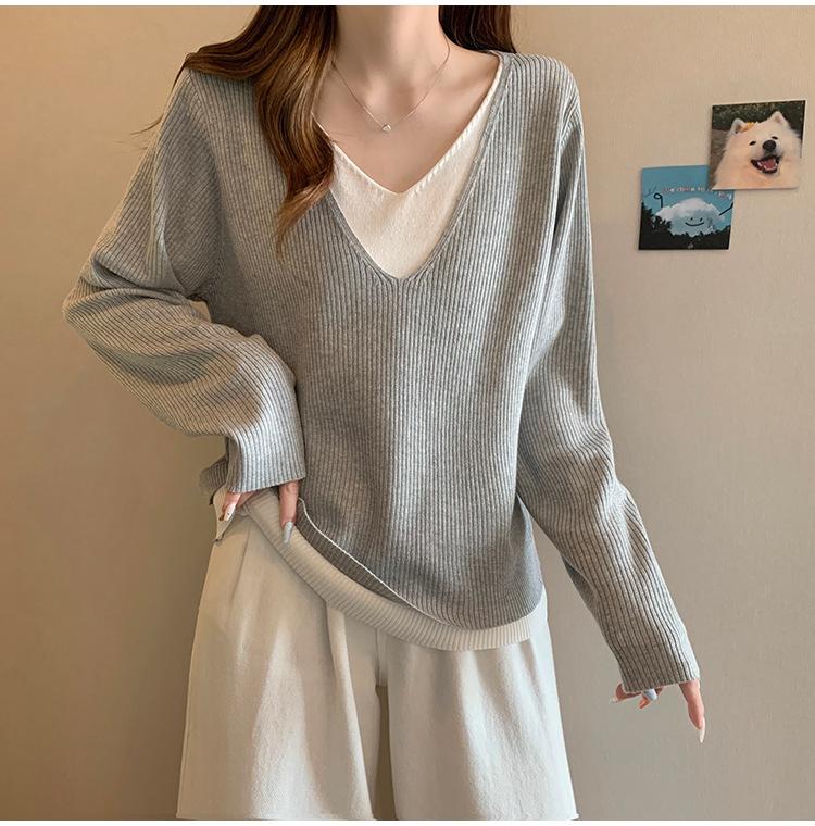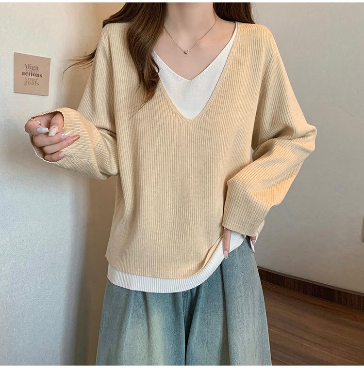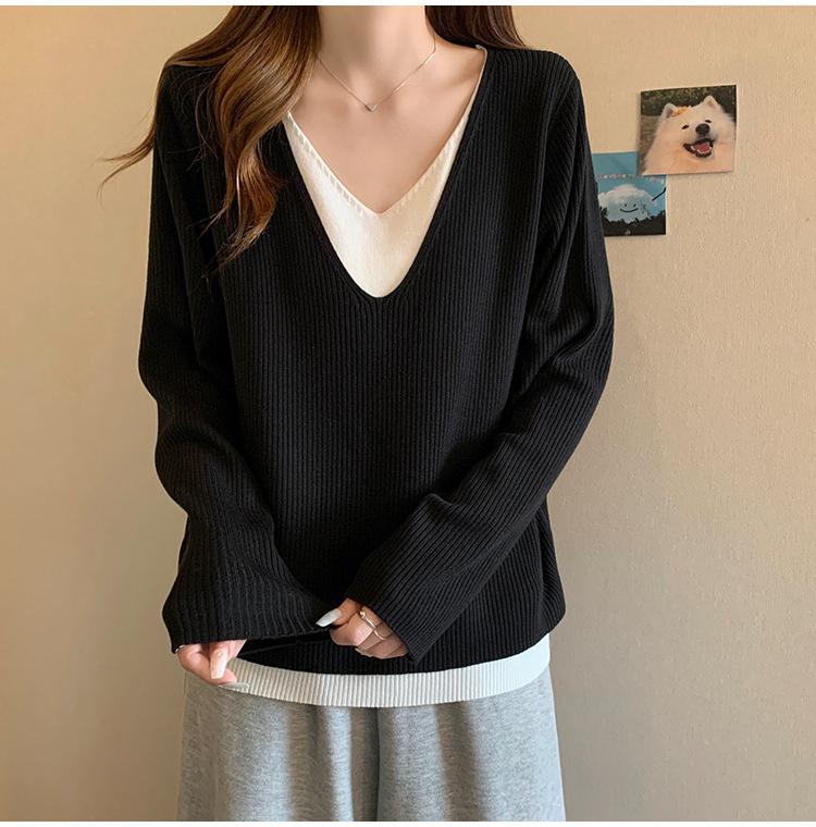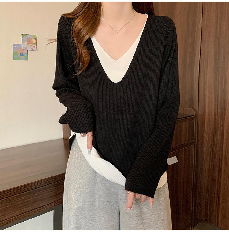 Suéter holgado ajustado de manga larga con cuello en V para mujer, otoño 2024, tejido de punto de dos piezas en contraste de color