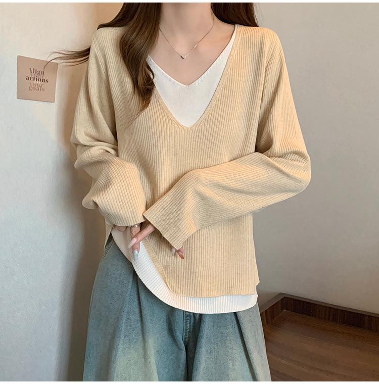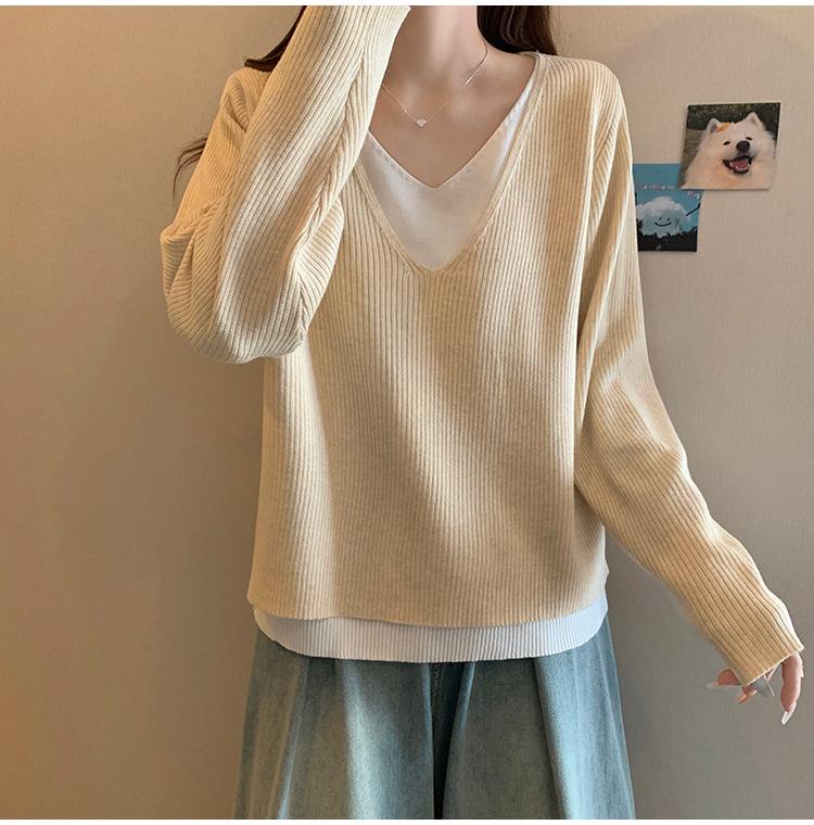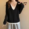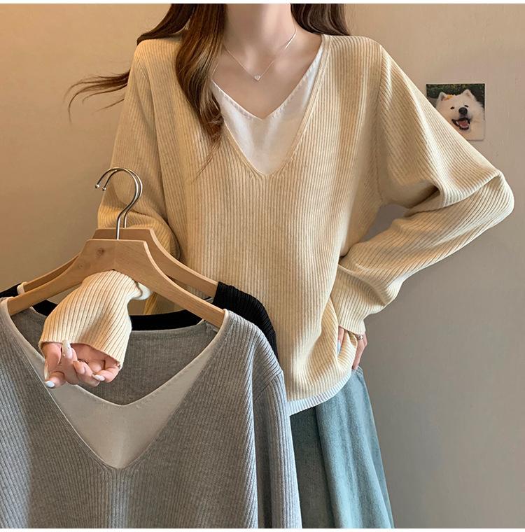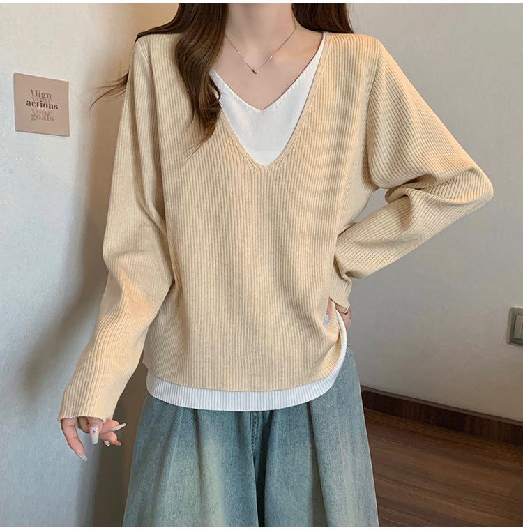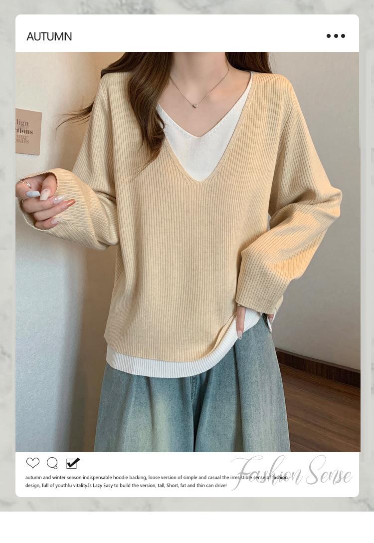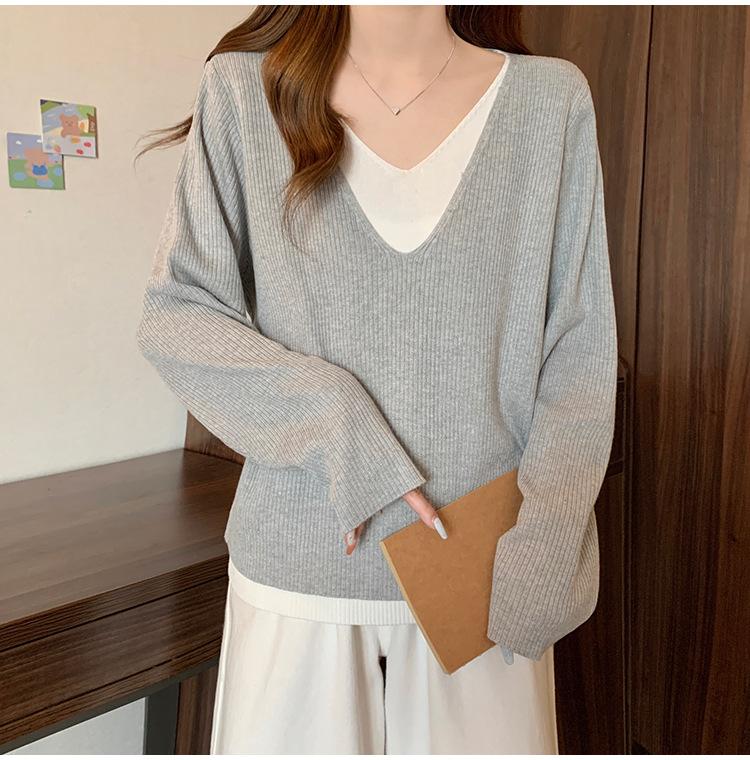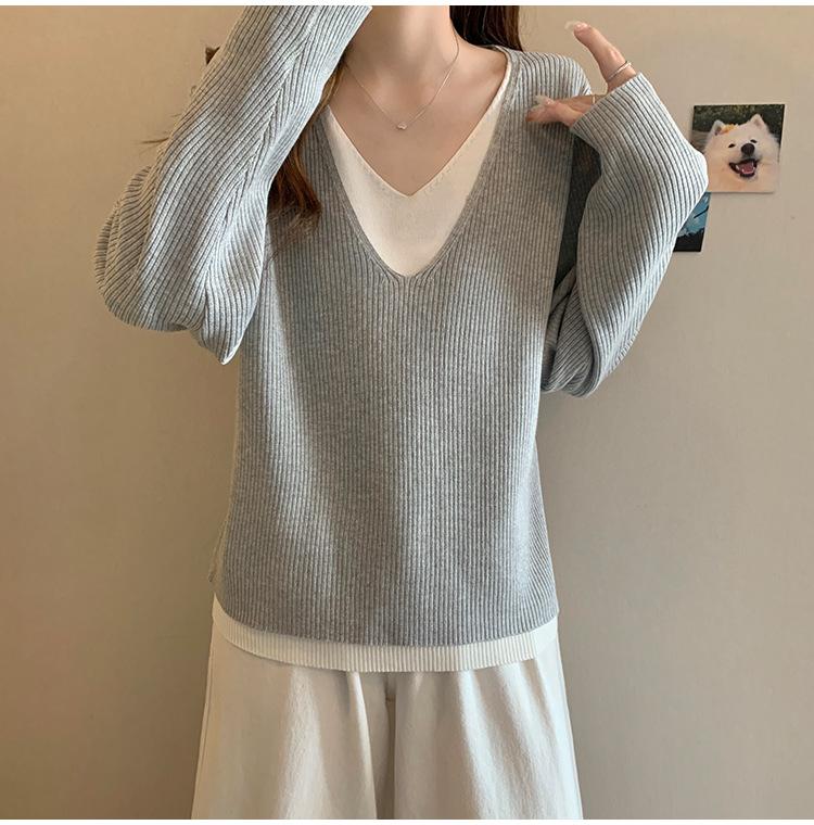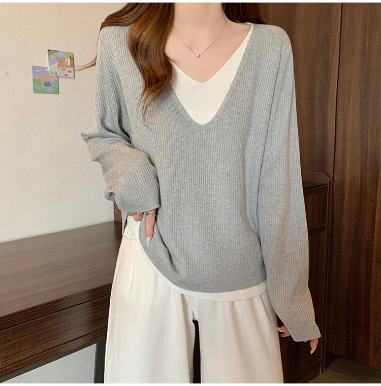 Suéter holgado ajustado de manga larga con cuello en V para mujer, otoño 2024, tejido de punto de dos piezas en contraste de color