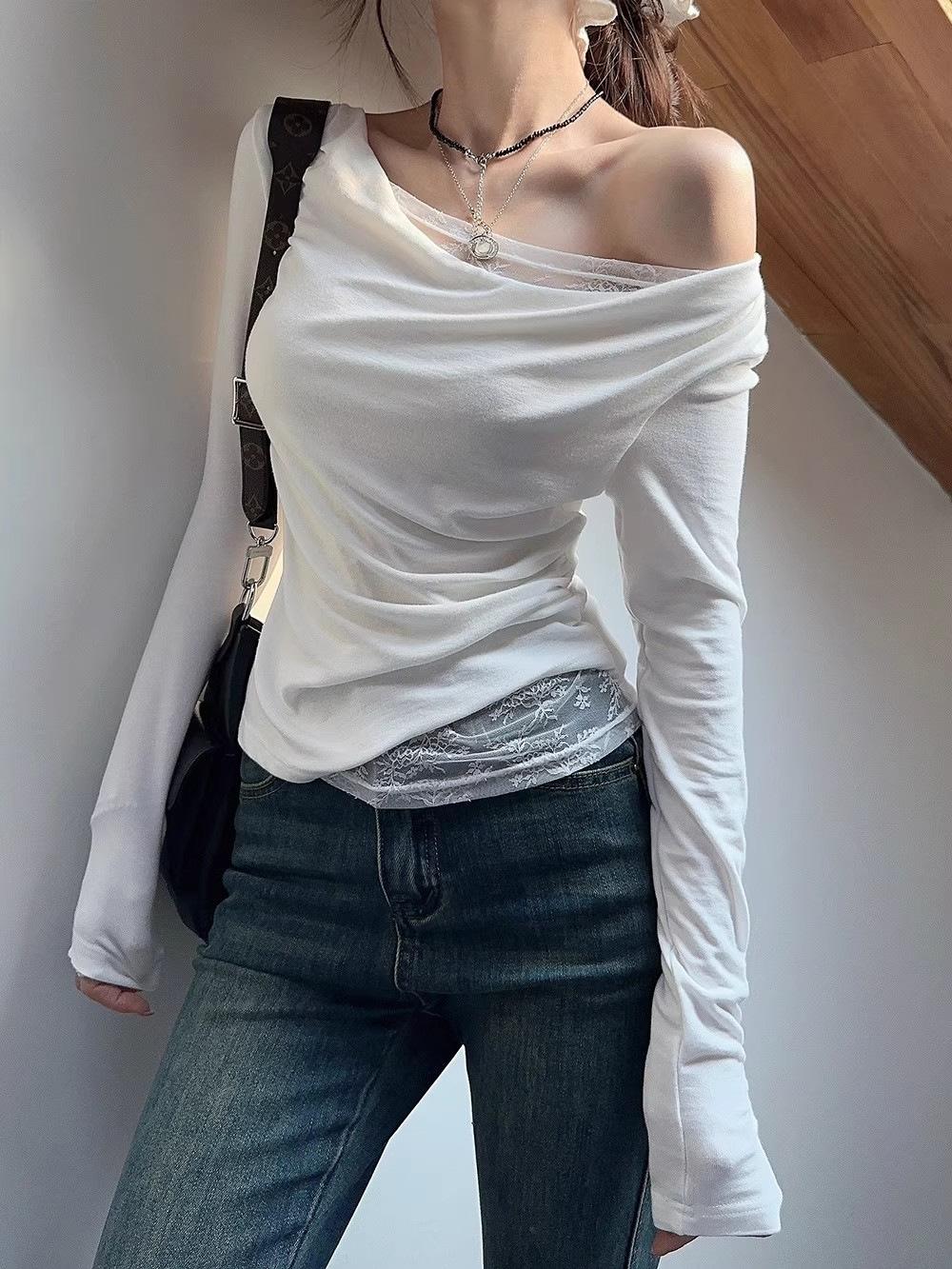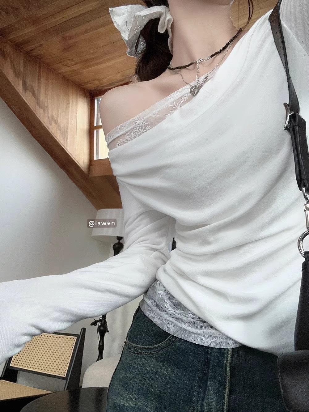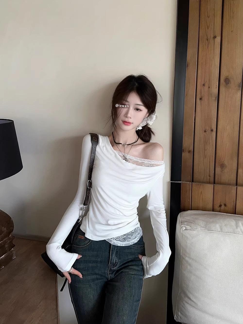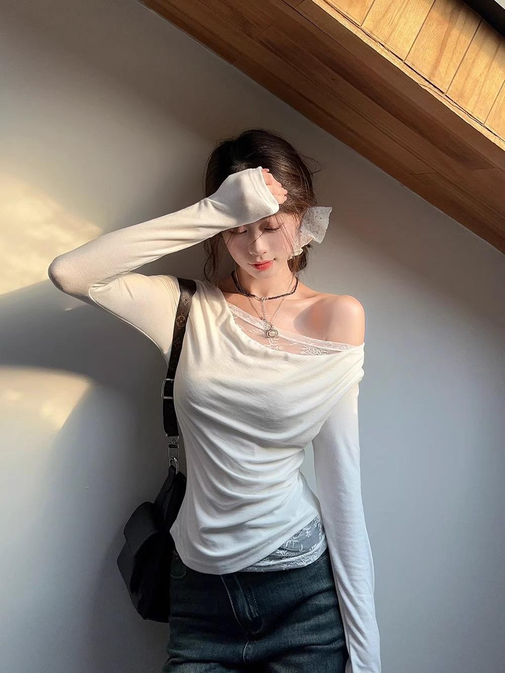 Camiseta de manga larga con hombros descubiertos y encaje para mujer, otoño 2024, nuevo diseño, corte entallado, estilo Spice Girls
