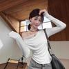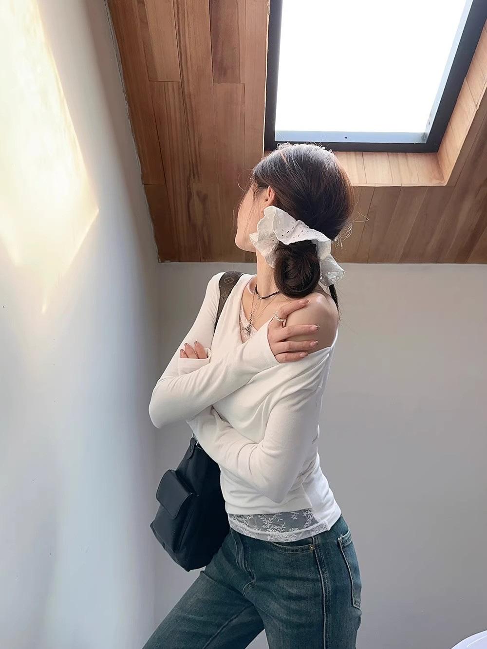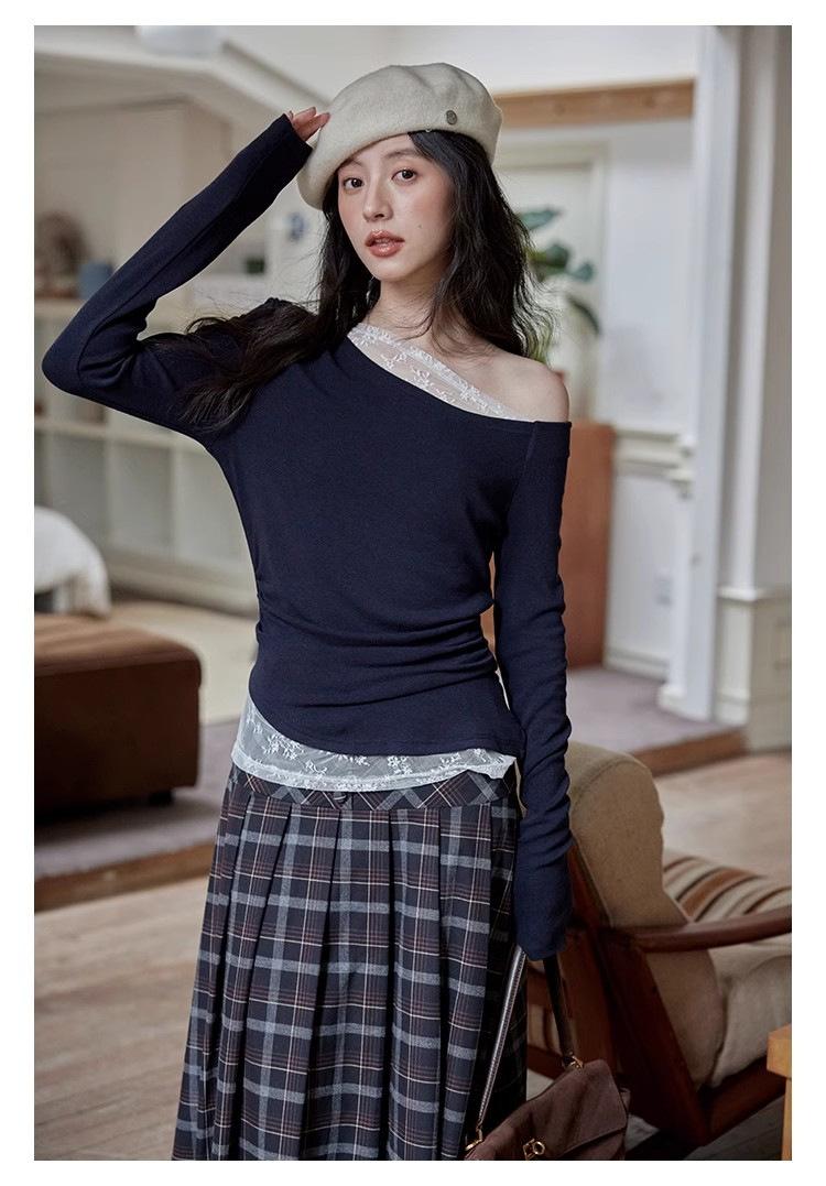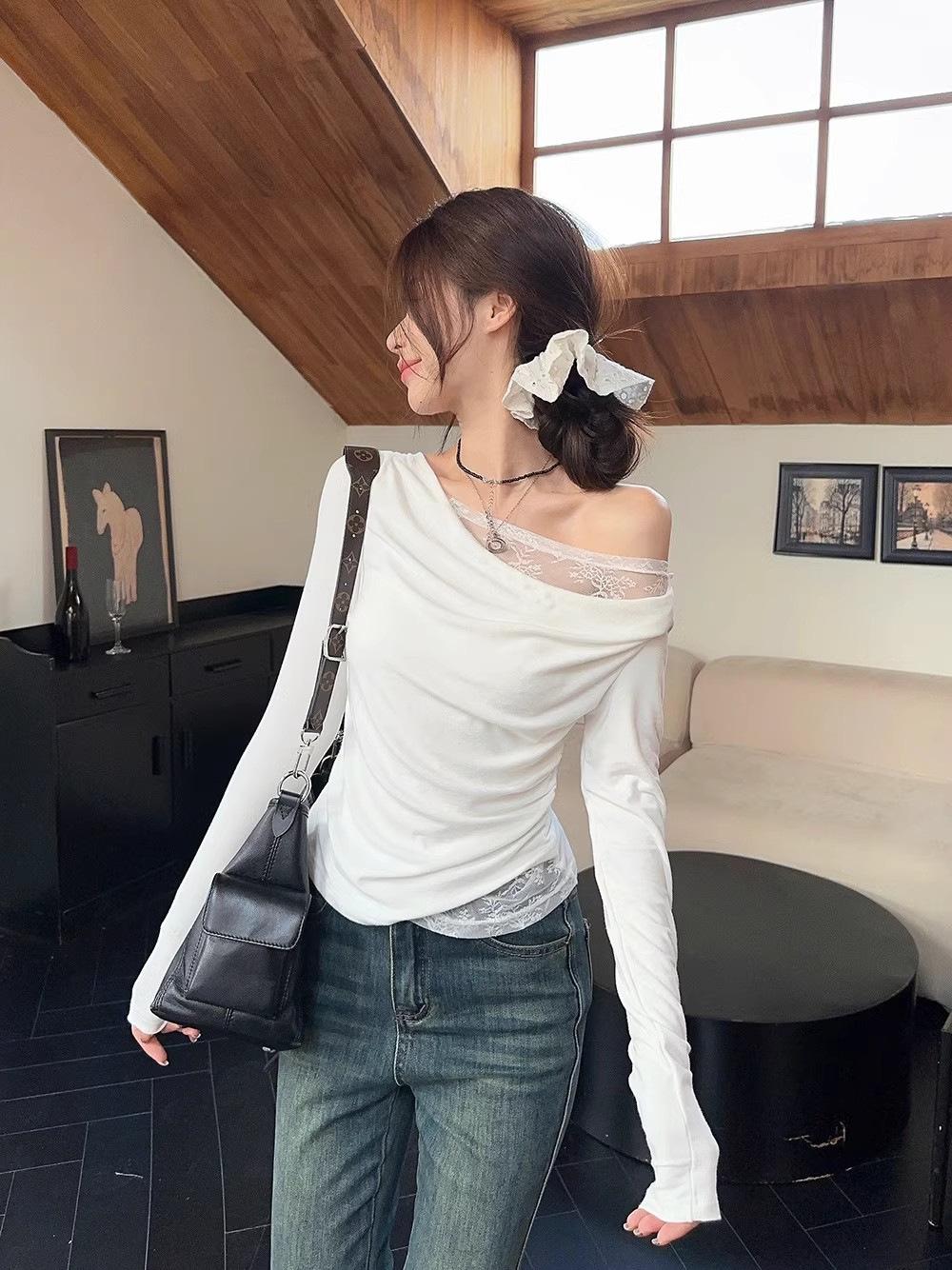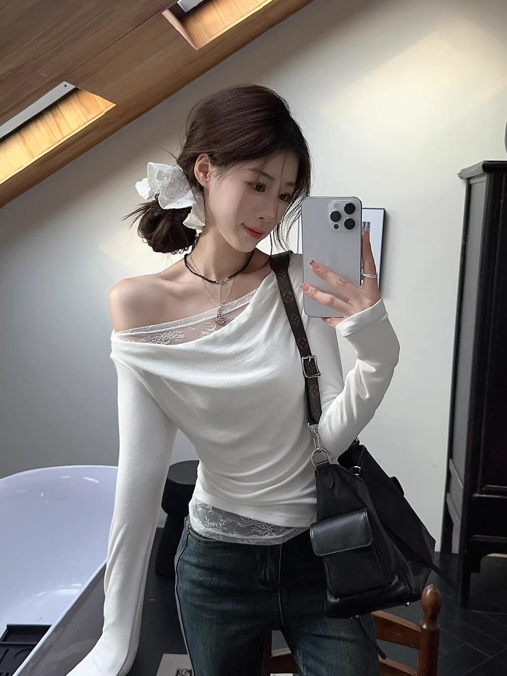Camiseta de manga larga con hombros descubiertos y encaje para mujer, otoño 2024, nuevo diseño, corte entallado, estilo Spice Girls