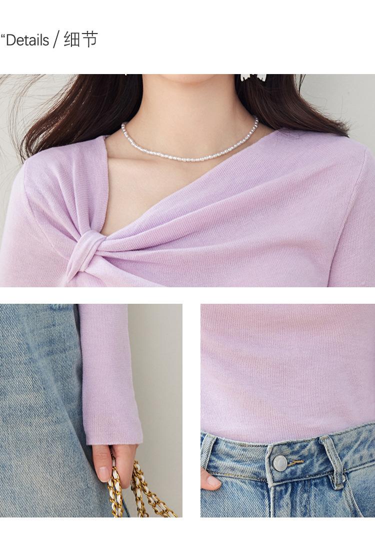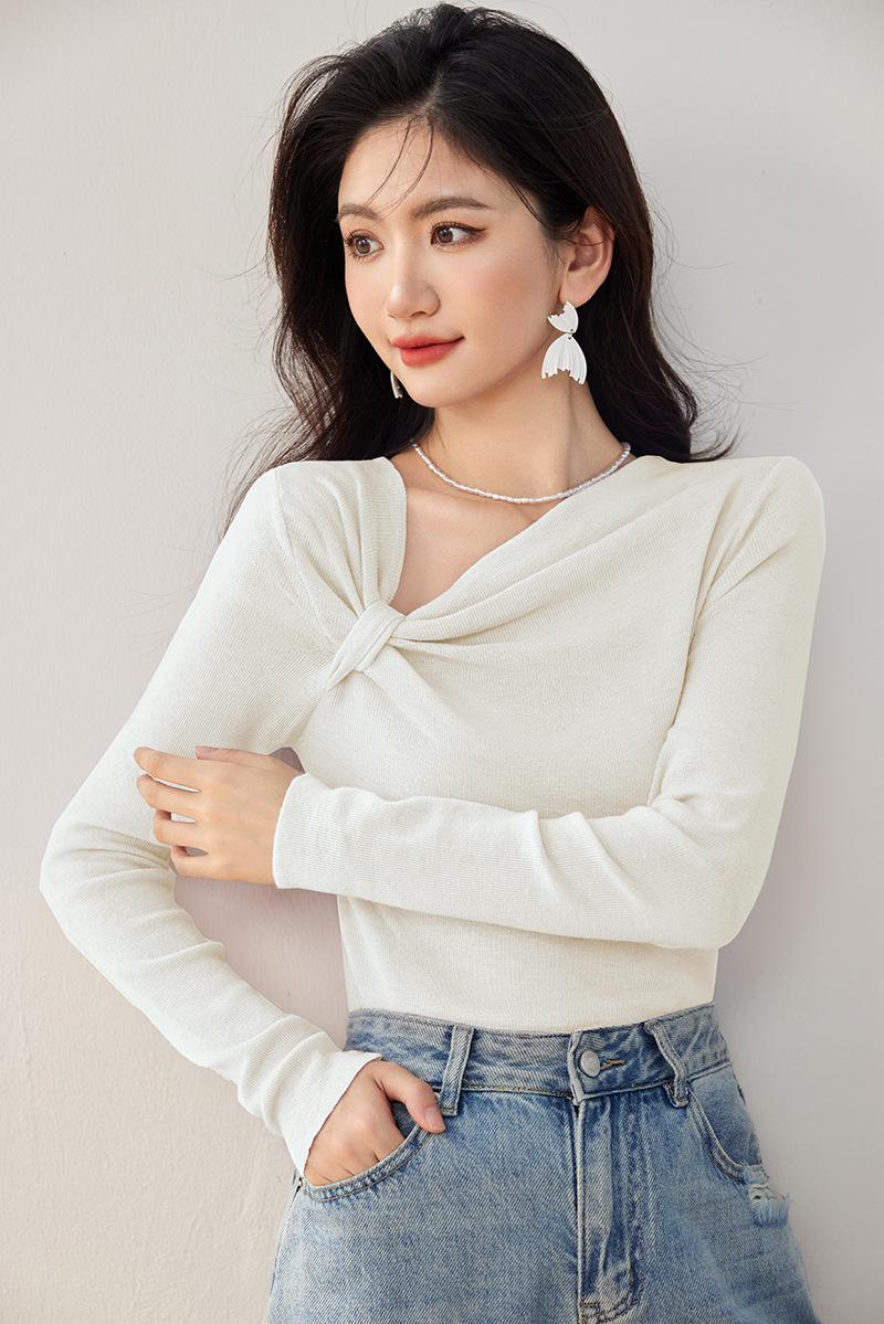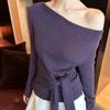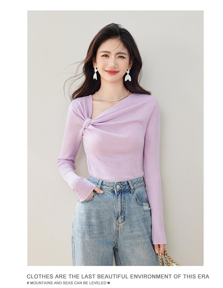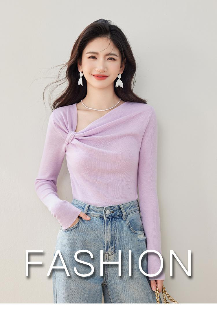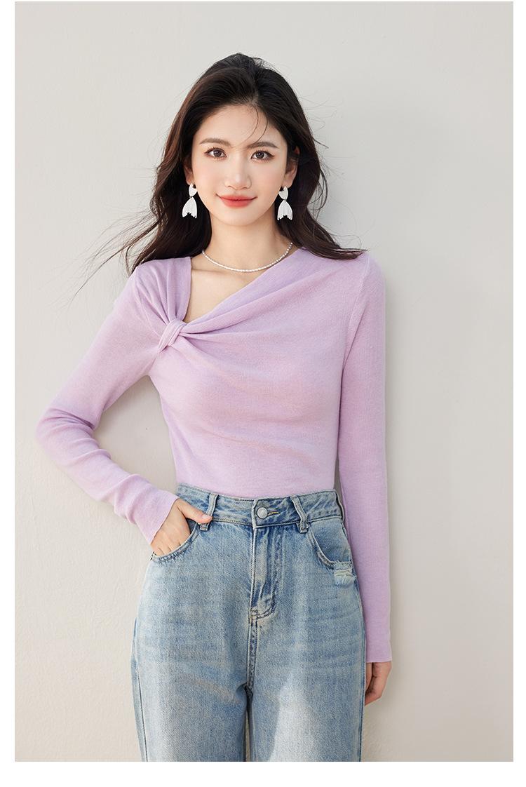 Suéter de punto con diseño irregular plisado para mujer, top básico de manga larga estilo retro francés, otoño 2024