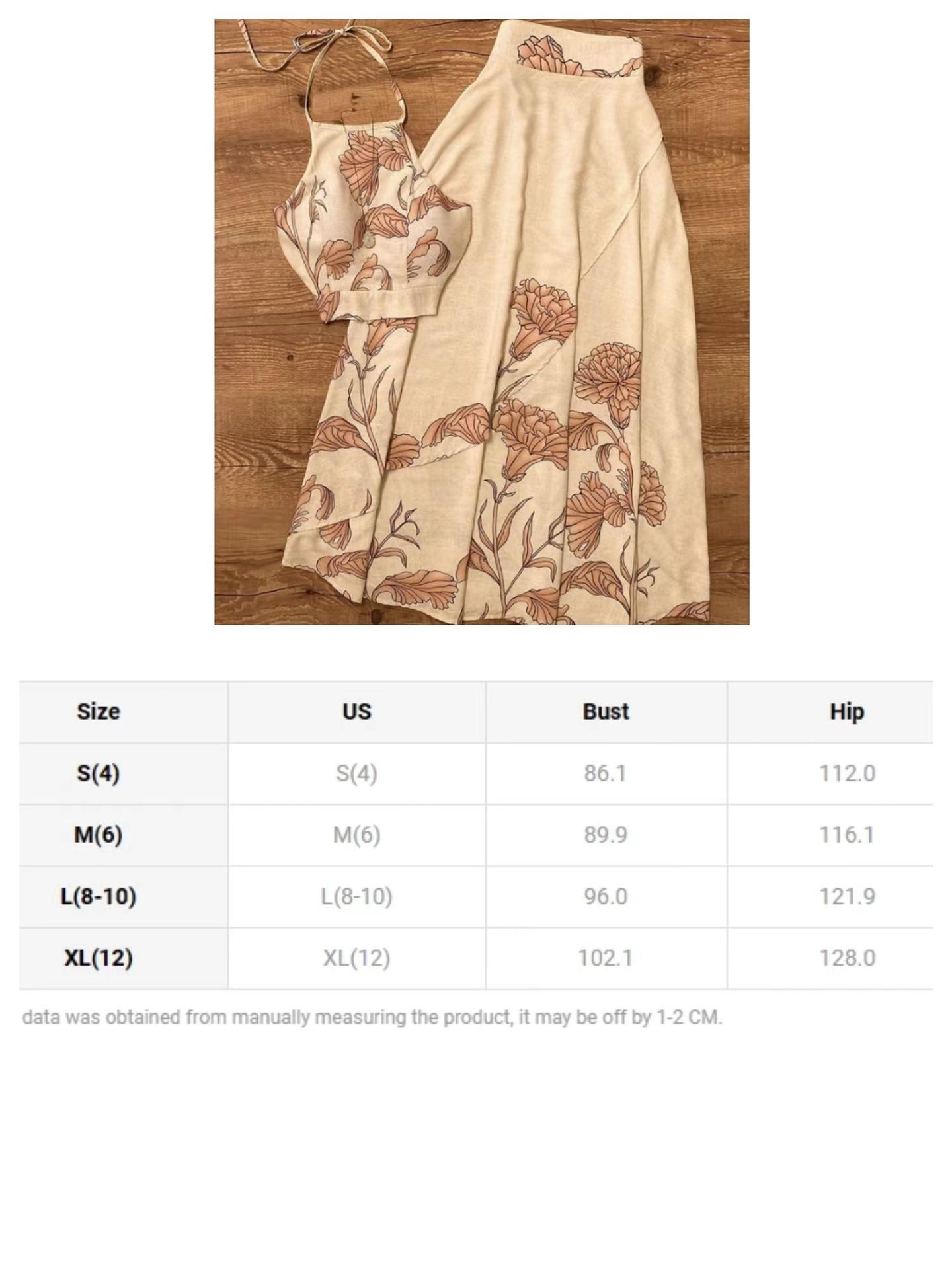 Conjunto de dos piezas para mujer de comercio exterior europeo y americano 2024, elegante top de cuello zen con cordones y estampado, falda línea A de cintura alta
