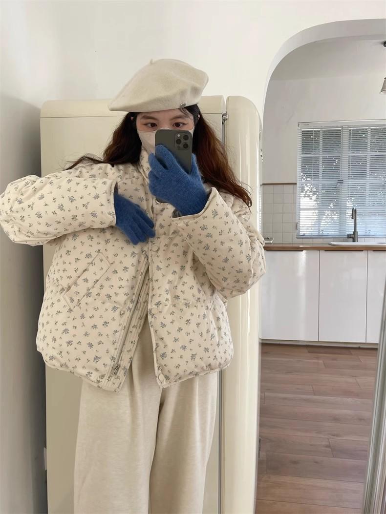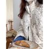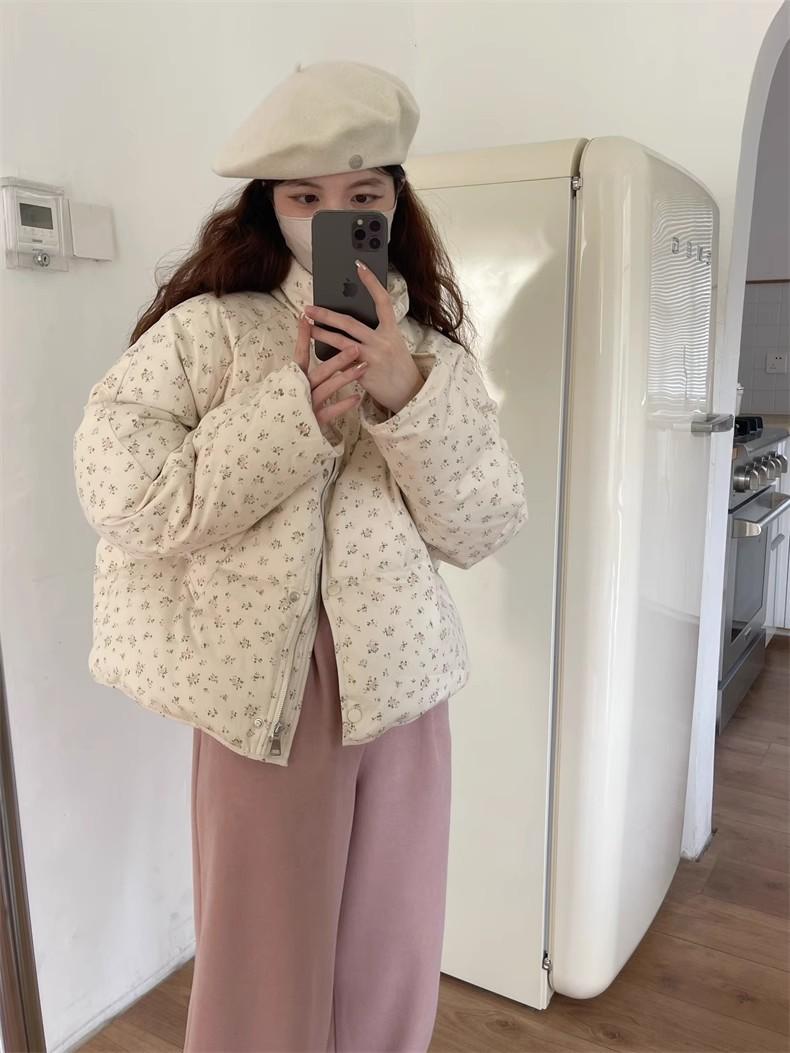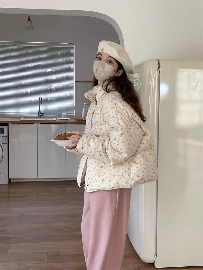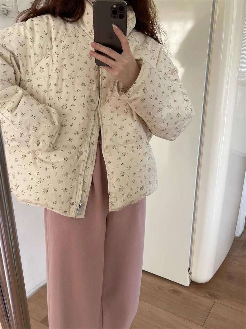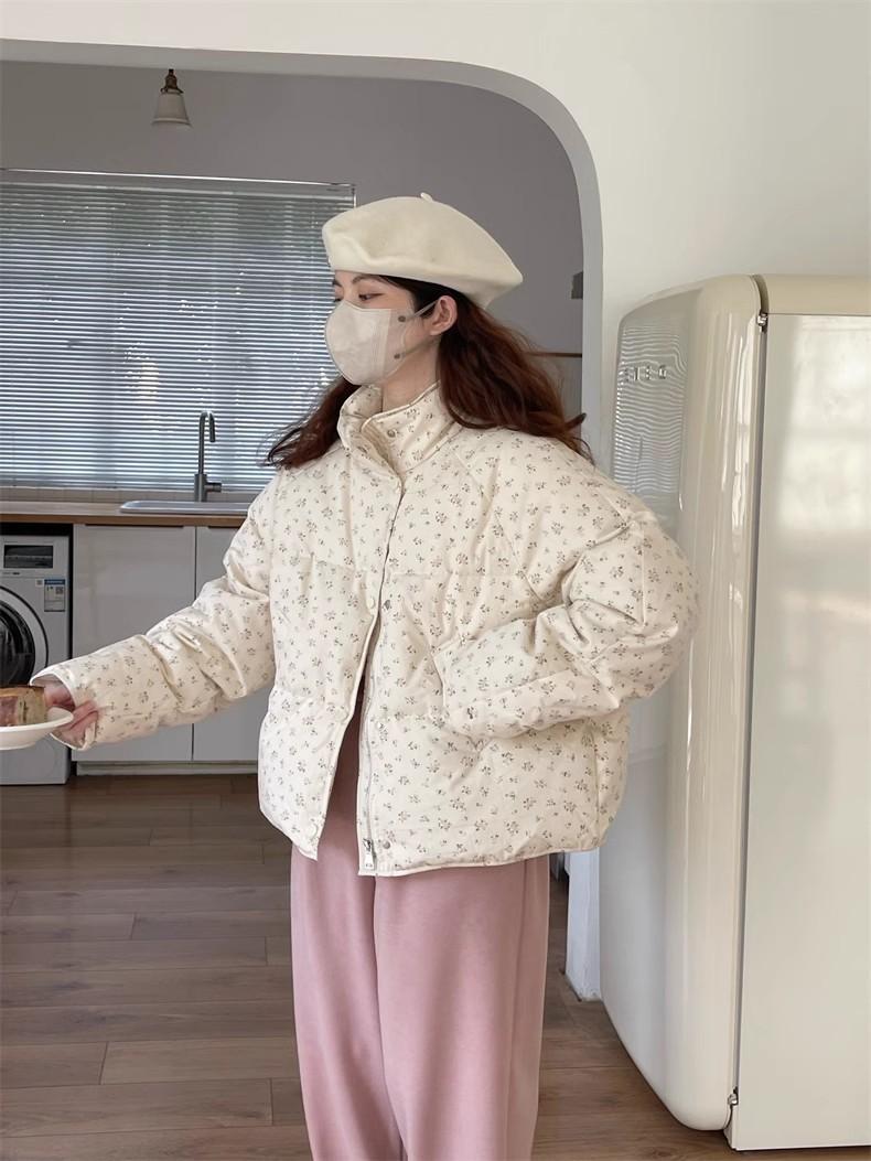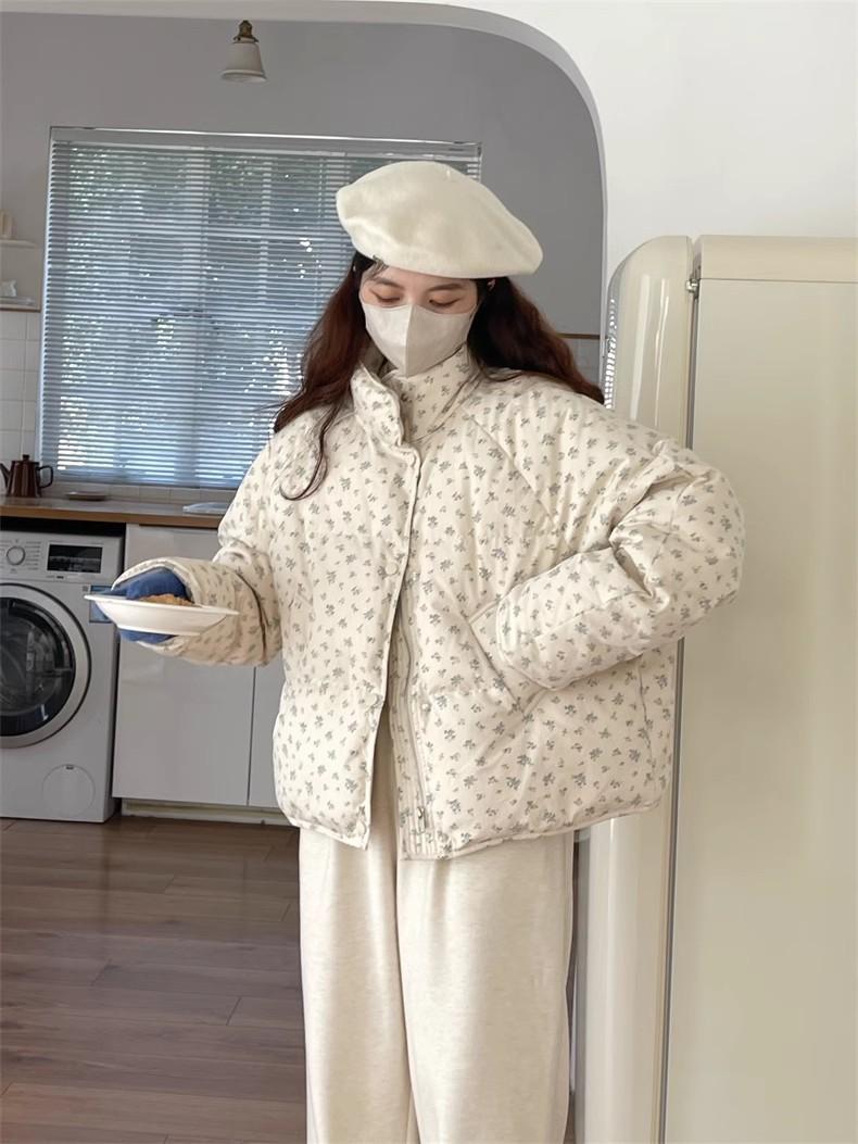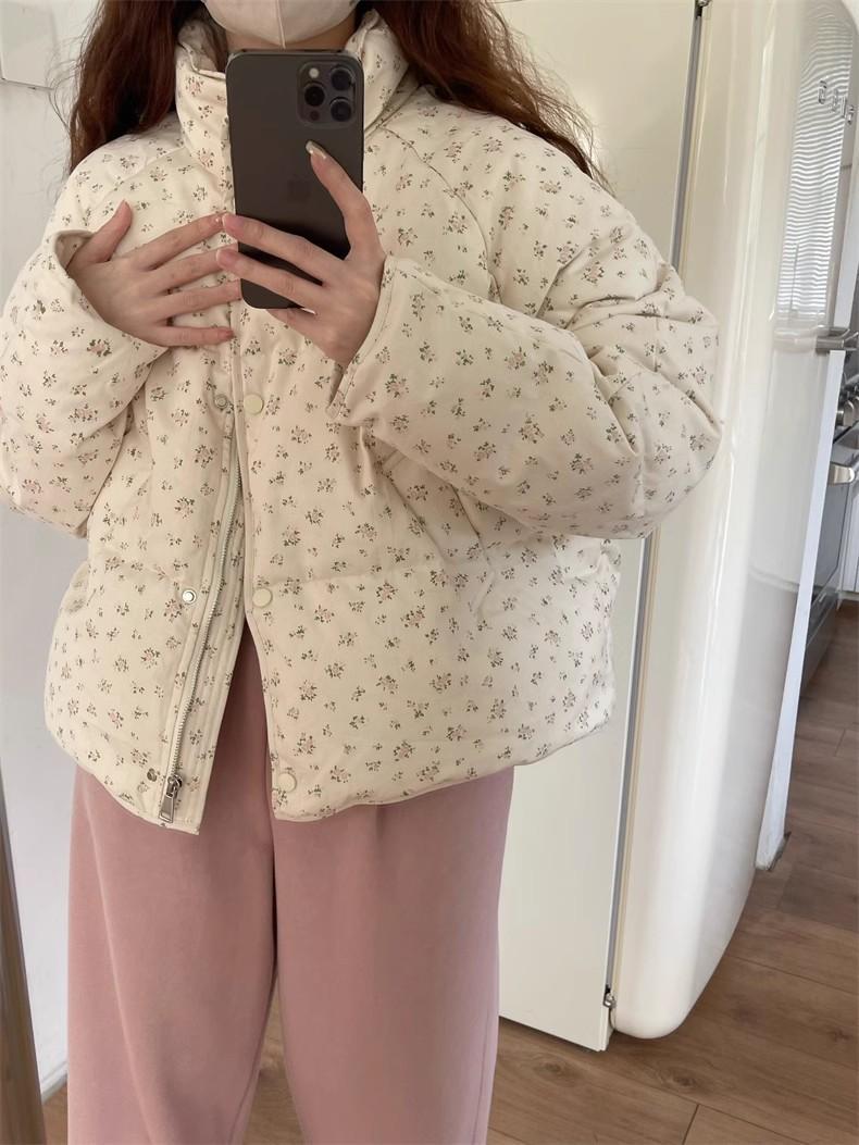 Chaqueta acolchada de algodón para mujer, invierno 2024, nueva, corta, con estampado floral, de algodón, con cuello alto, dulce y fresco.
