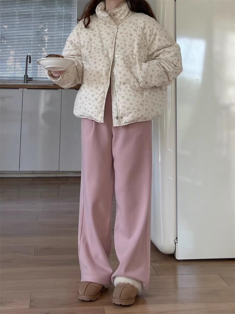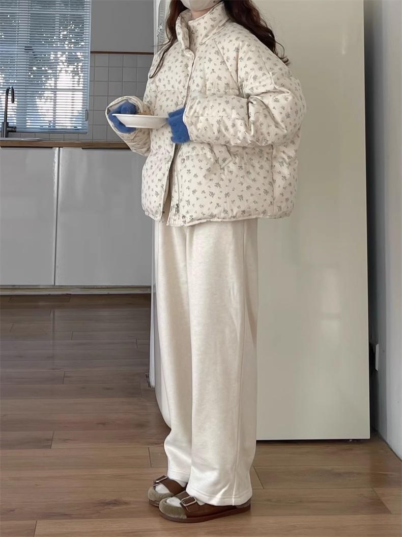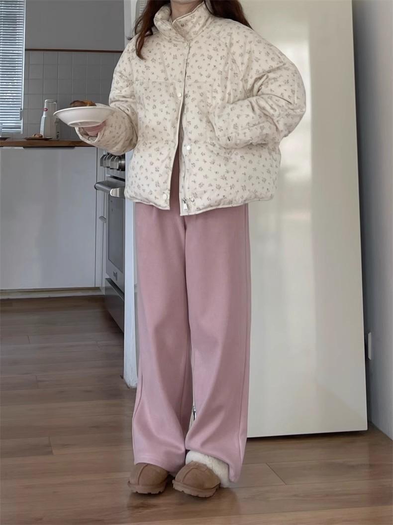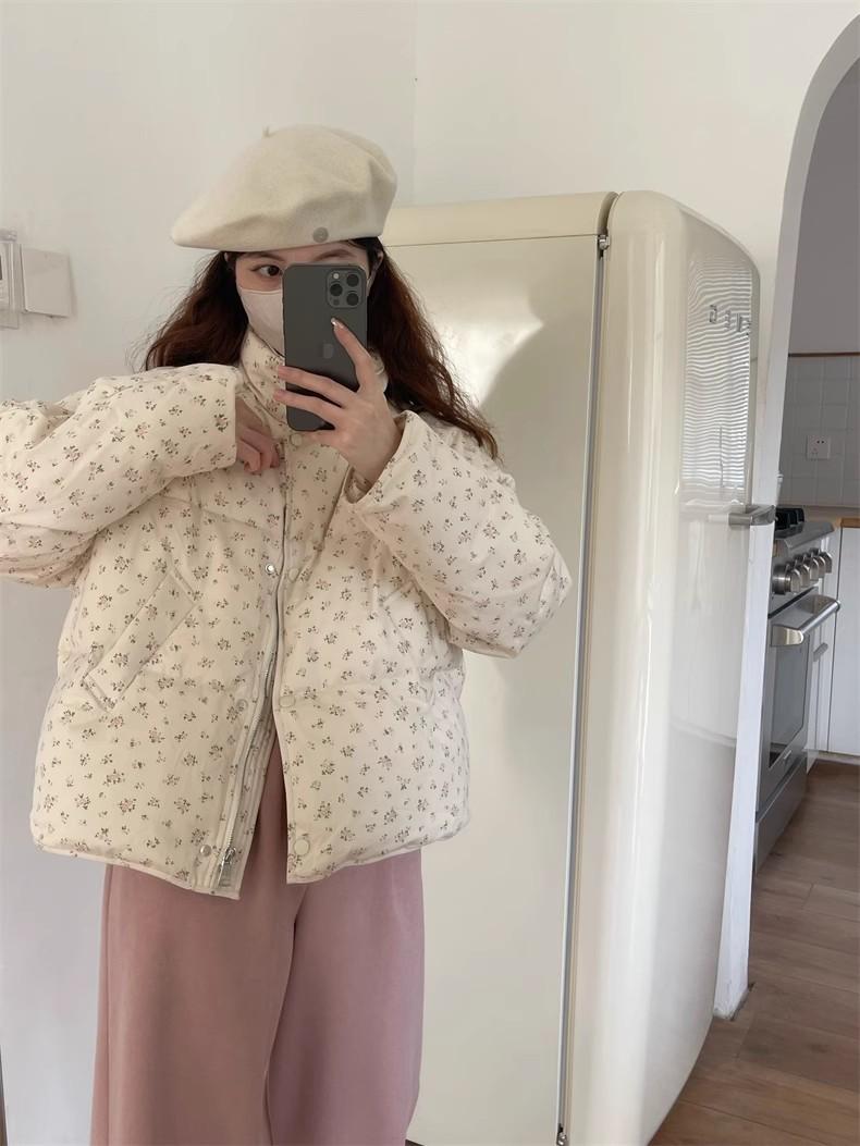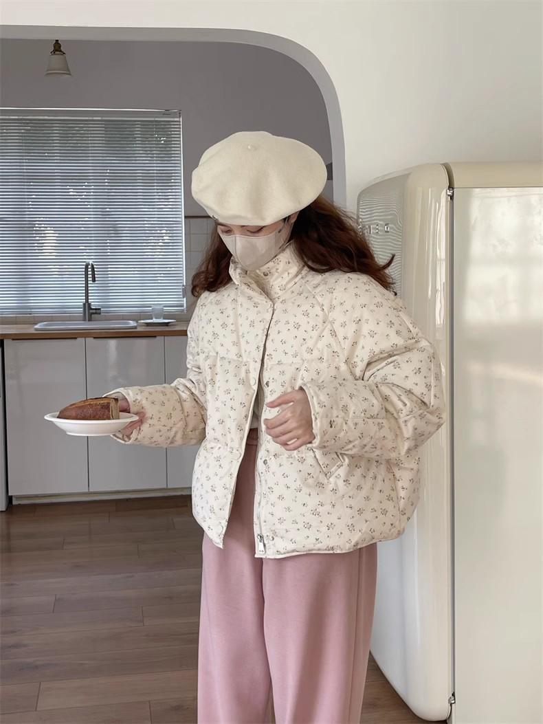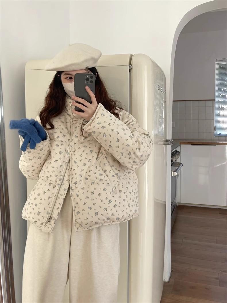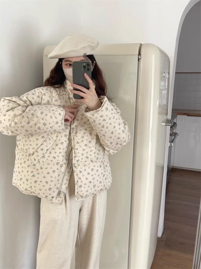 Chaqueta acolchada de algodón para mujer, invierno 2024, nueva, corta, con estampado floral, de algodón, con cuello alto, dulce y fresco.