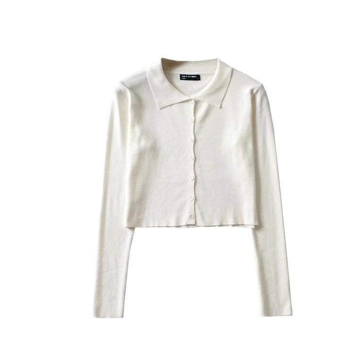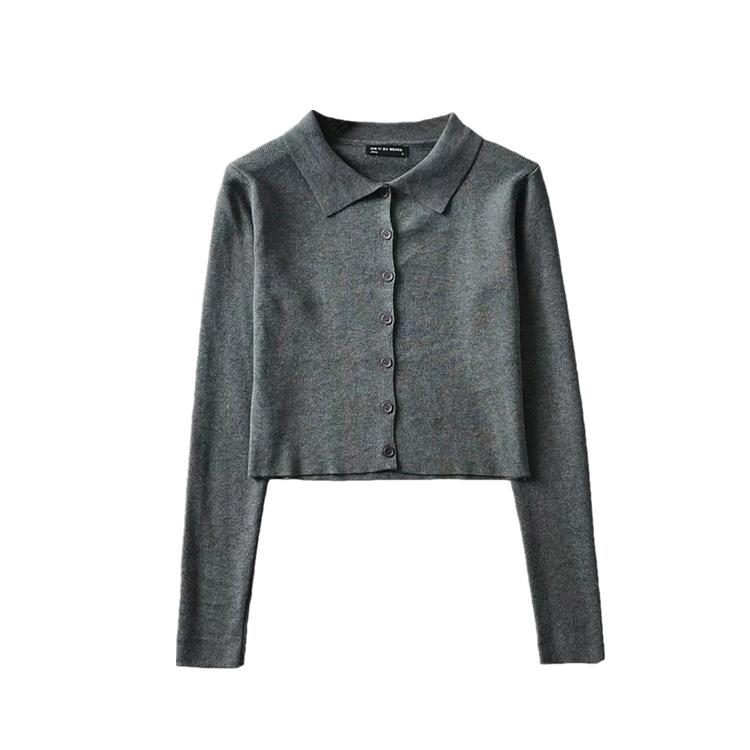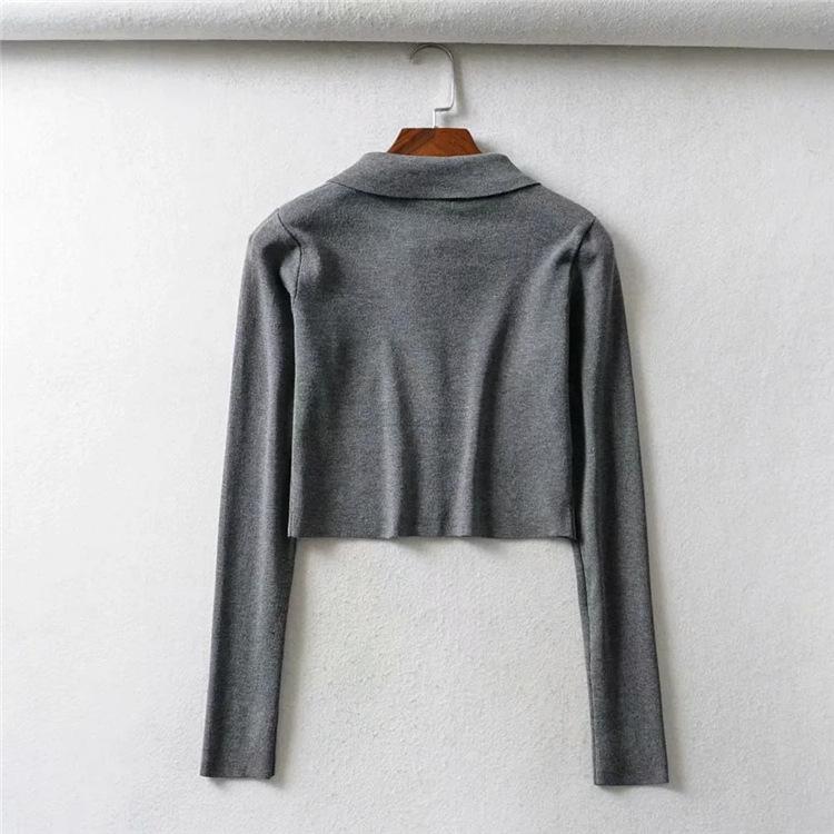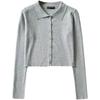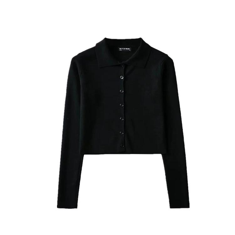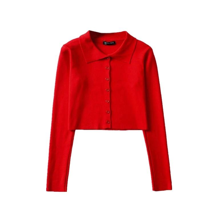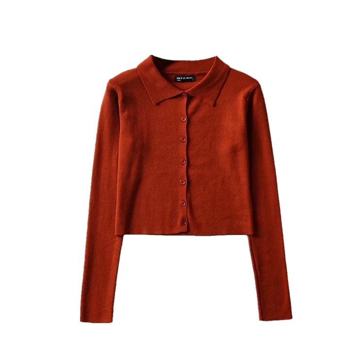 Primavera Nuevo Top de Manga Larga Ajustado para Exterior Estilo Americano Retro Solapa Color Sólido Cárdigan Corto de Cintura Alta Suéter Tejido