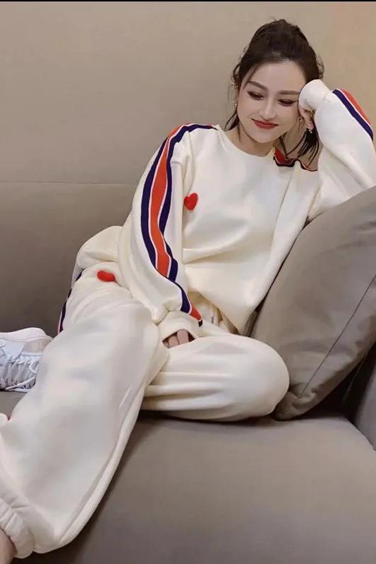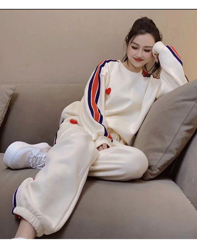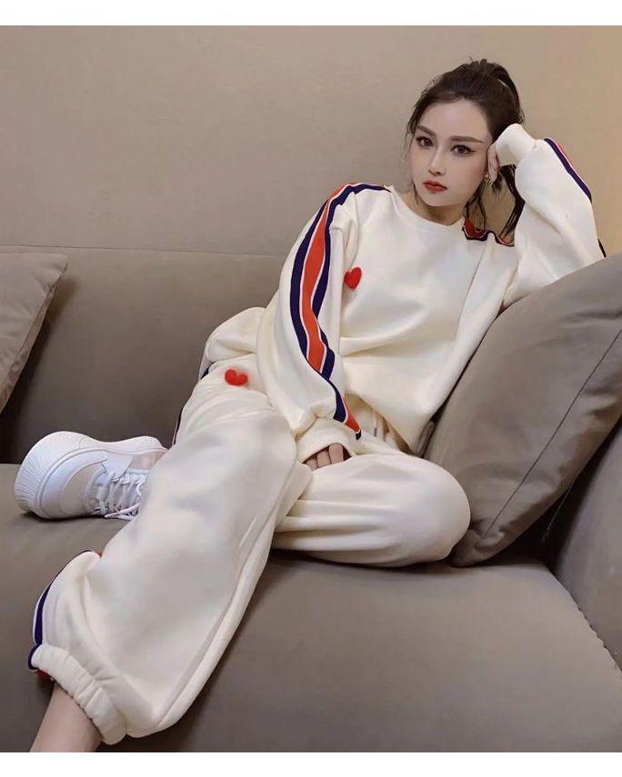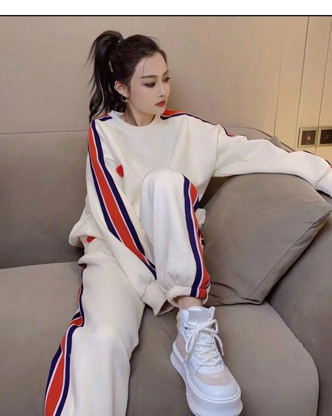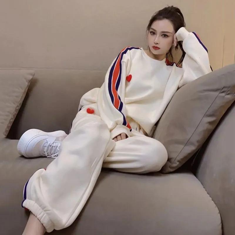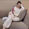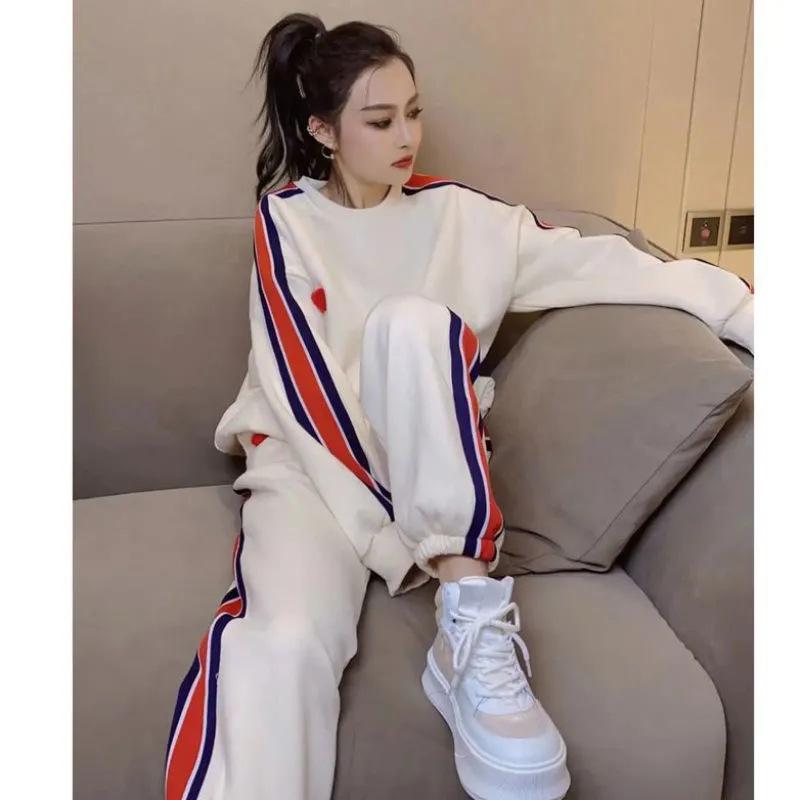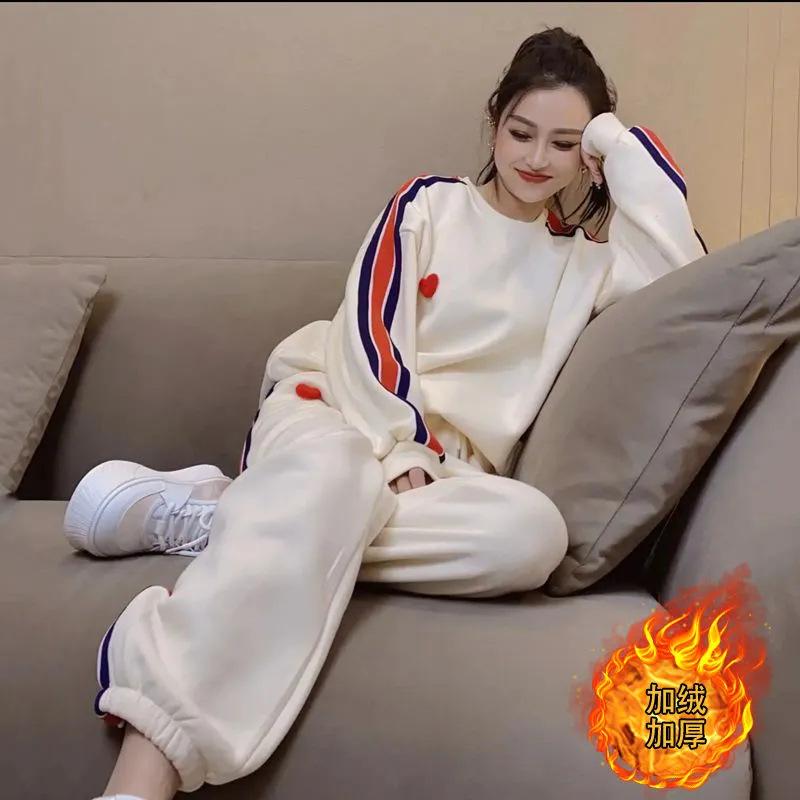 Sudadera deportiva informal de moda con rayas laterales y forro polar grueso de otoño e invierno para mujer, conjunto de dos piezas de celebridades de Internet Fried Street