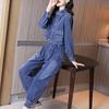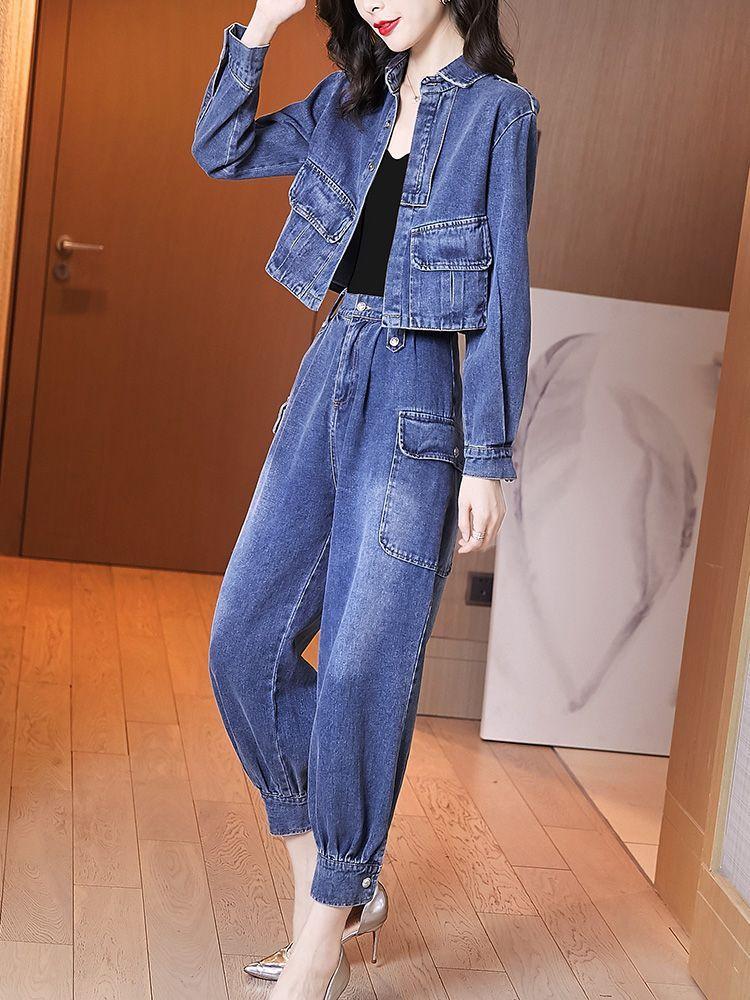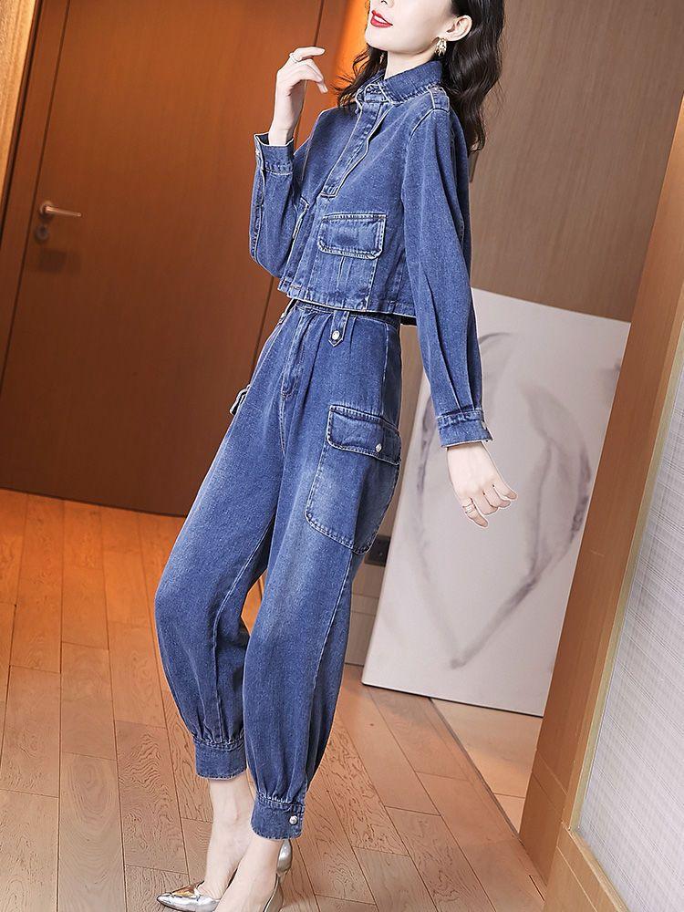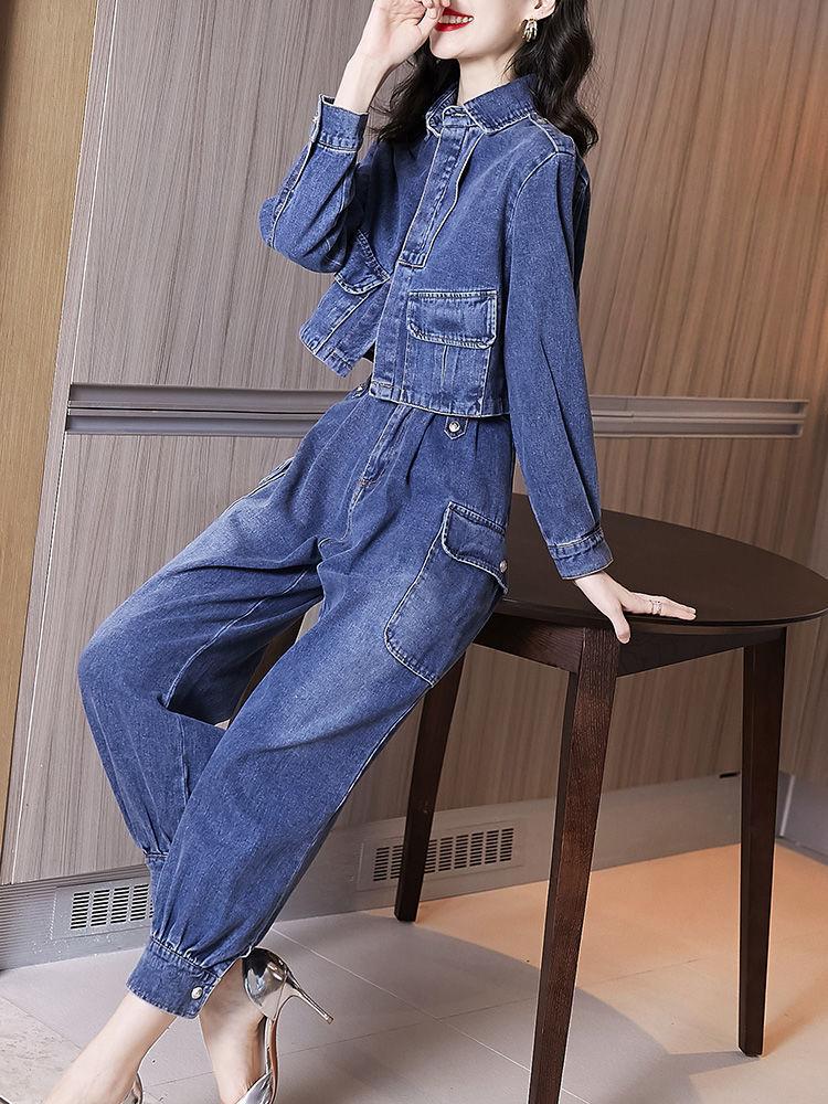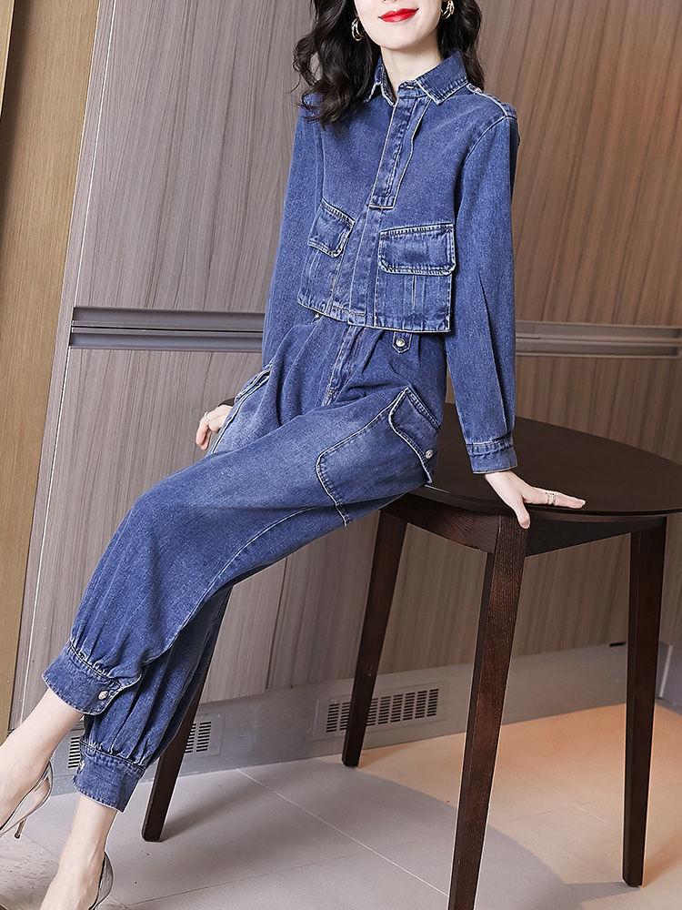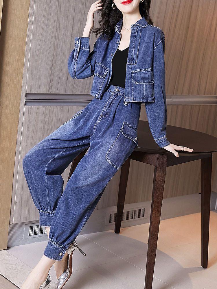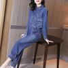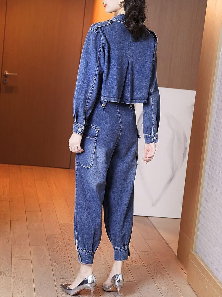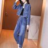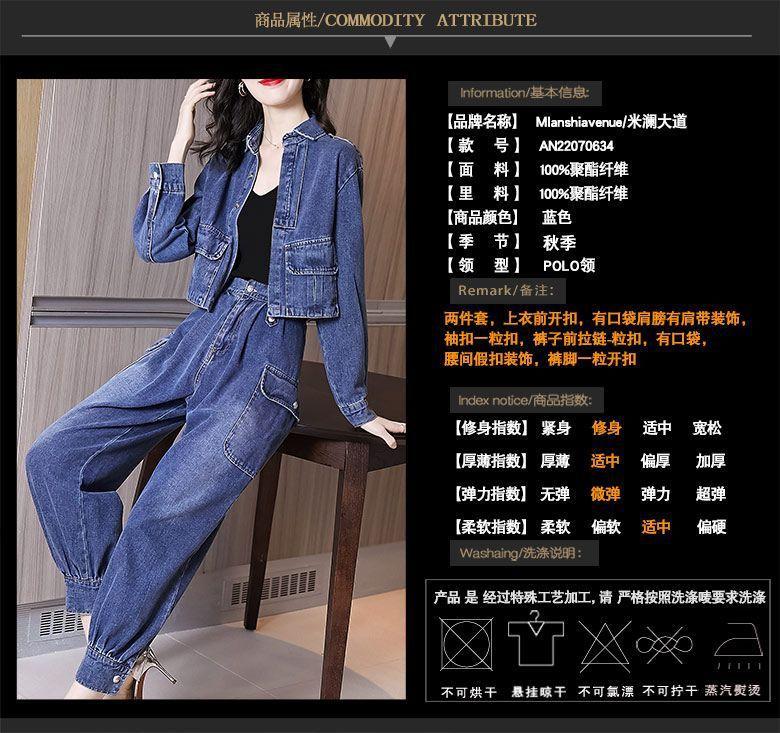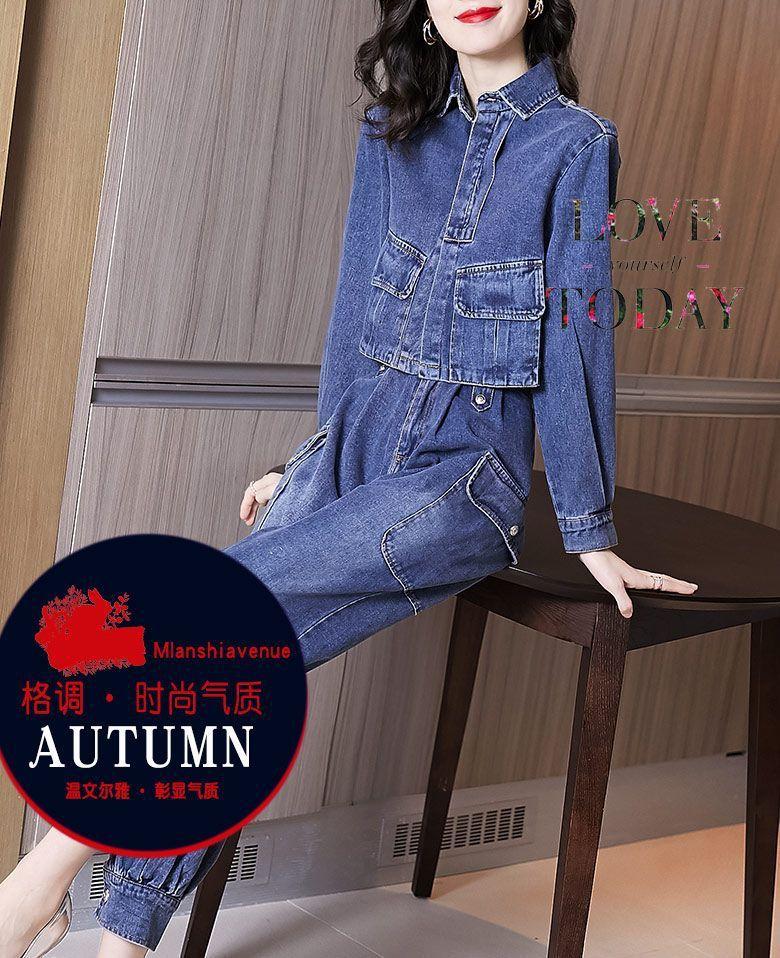 Ropa de Otoño para Mujer 2022 Nuevo Estilo Moda Callejera Estilo Hong Kong Cubre Carne Gorda Chaqueta de Mezclilla Pantalones Linterna Traje de Dos Piezas
