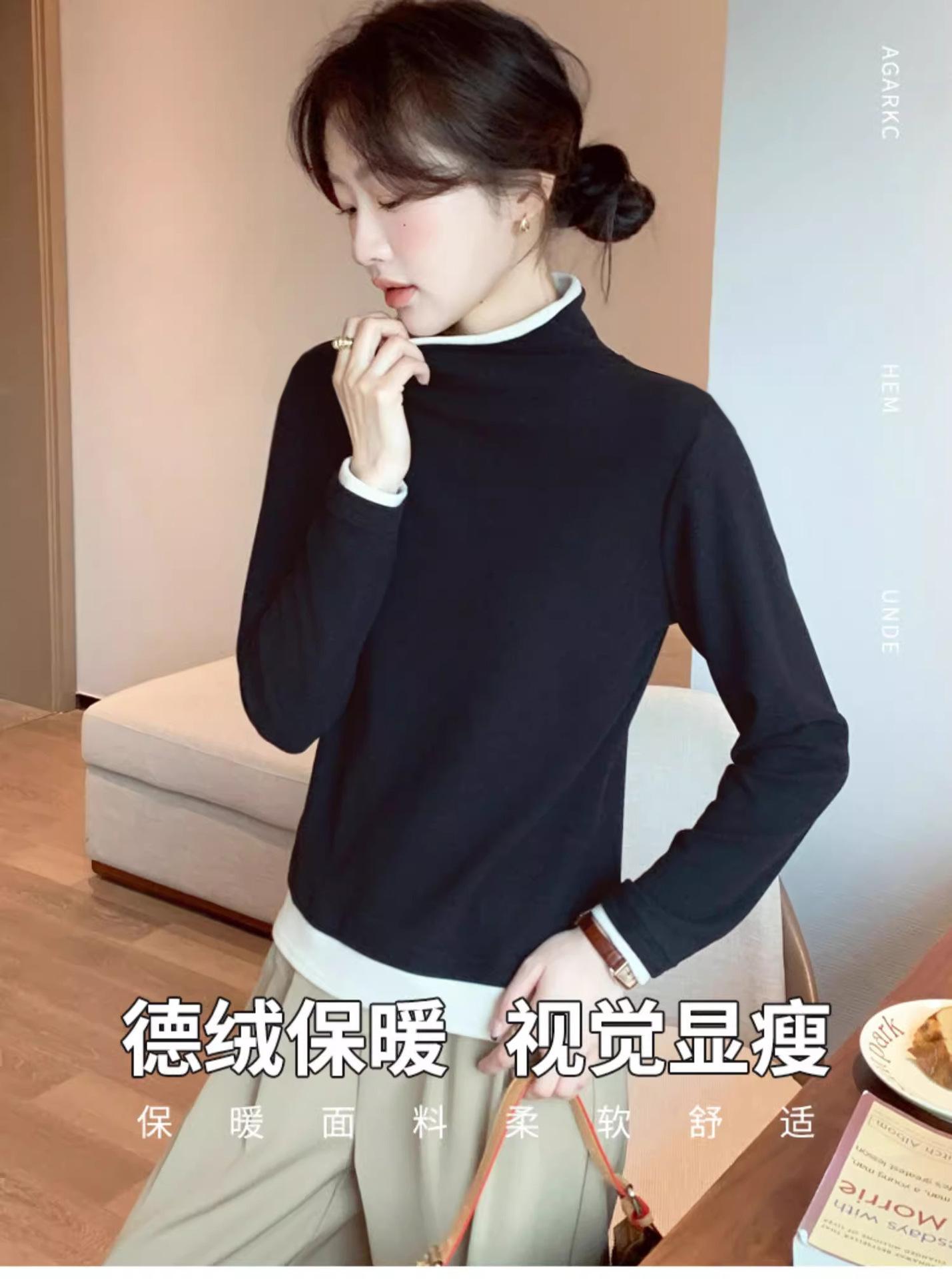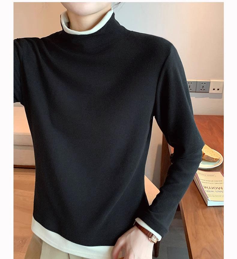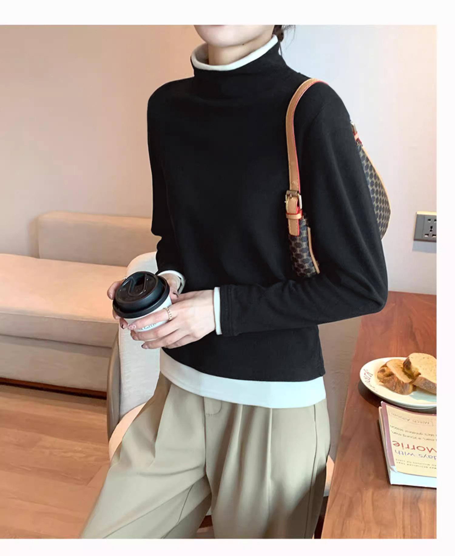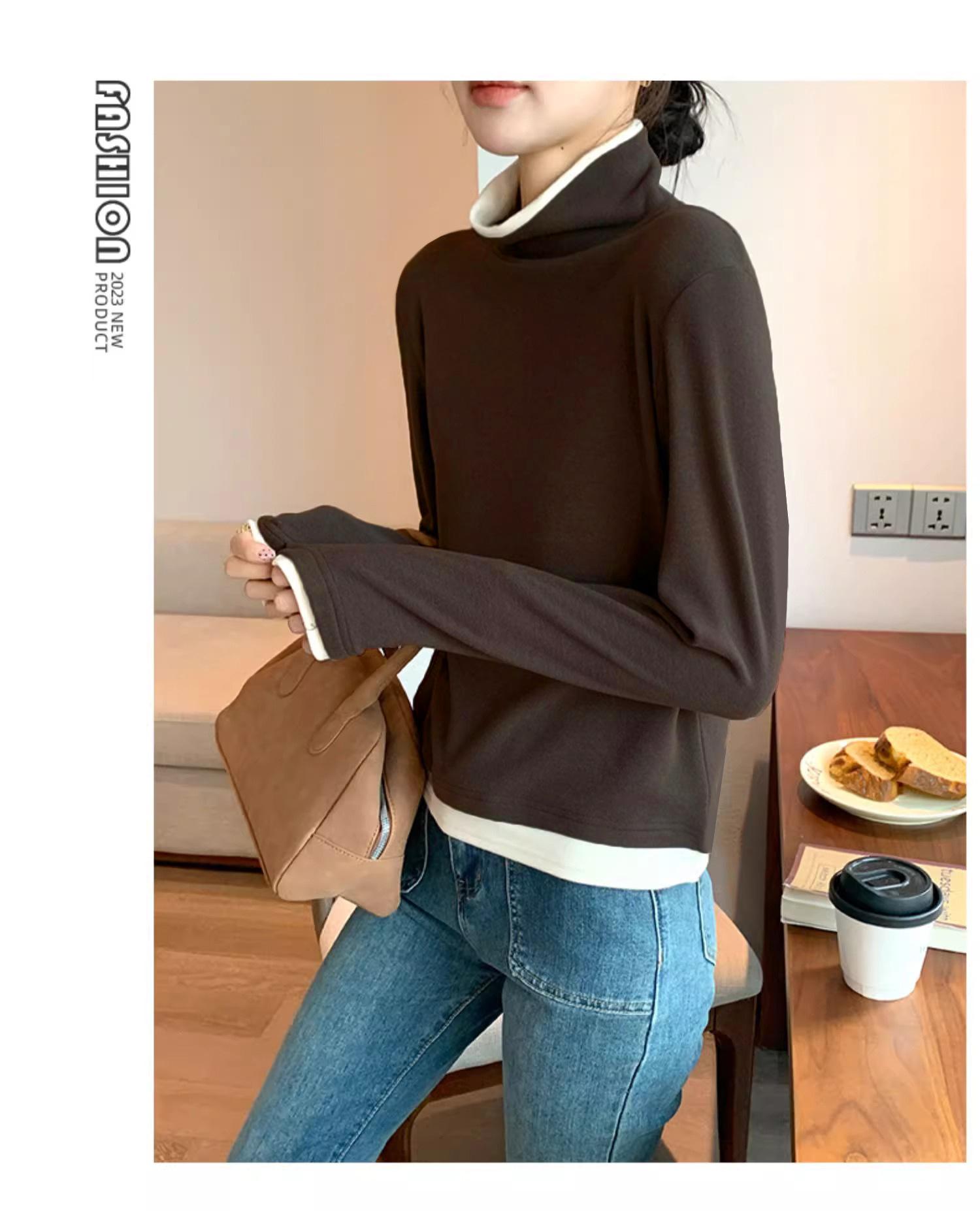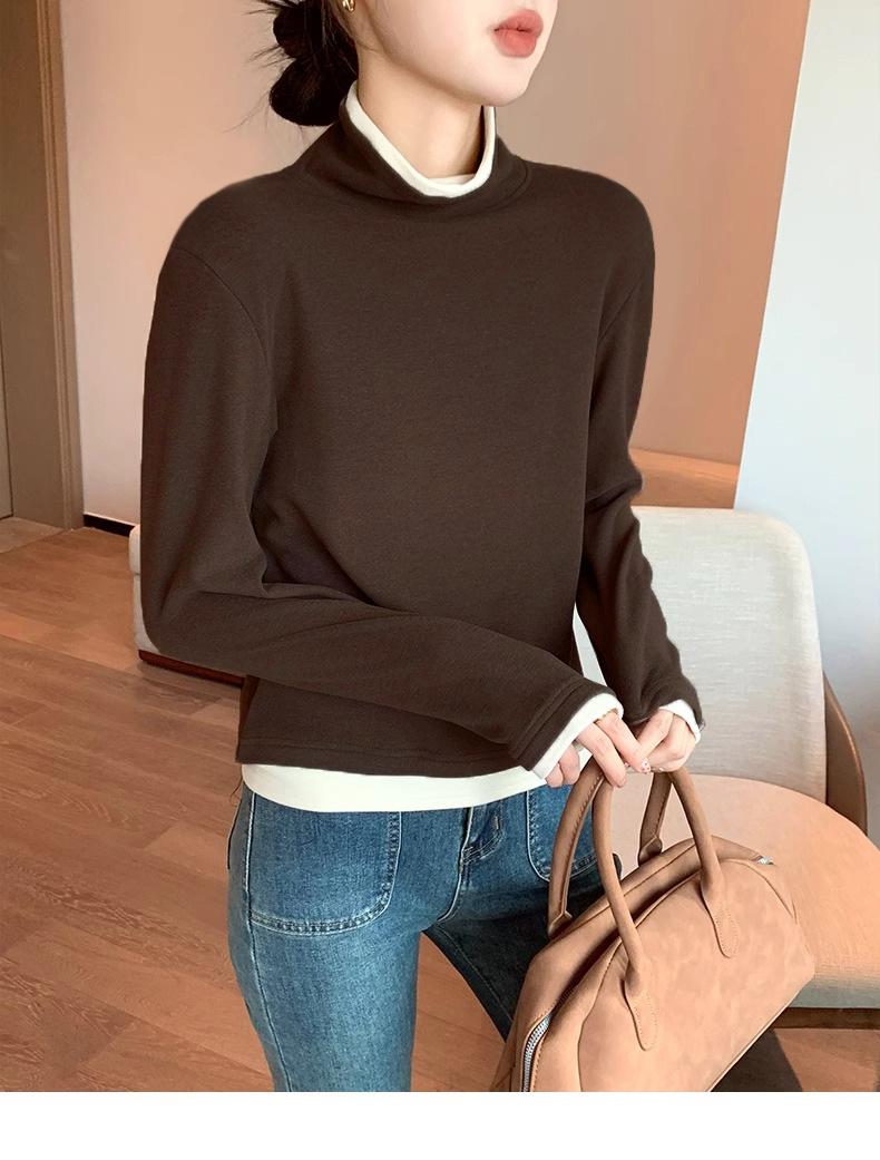 Camiseta base de terciopelo de manga larga estilo Maillard de estilo coreano de dos piezas falsas con cuello alto, nueva de otoño e invierno, cálida y combinable para mujer