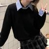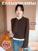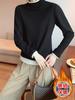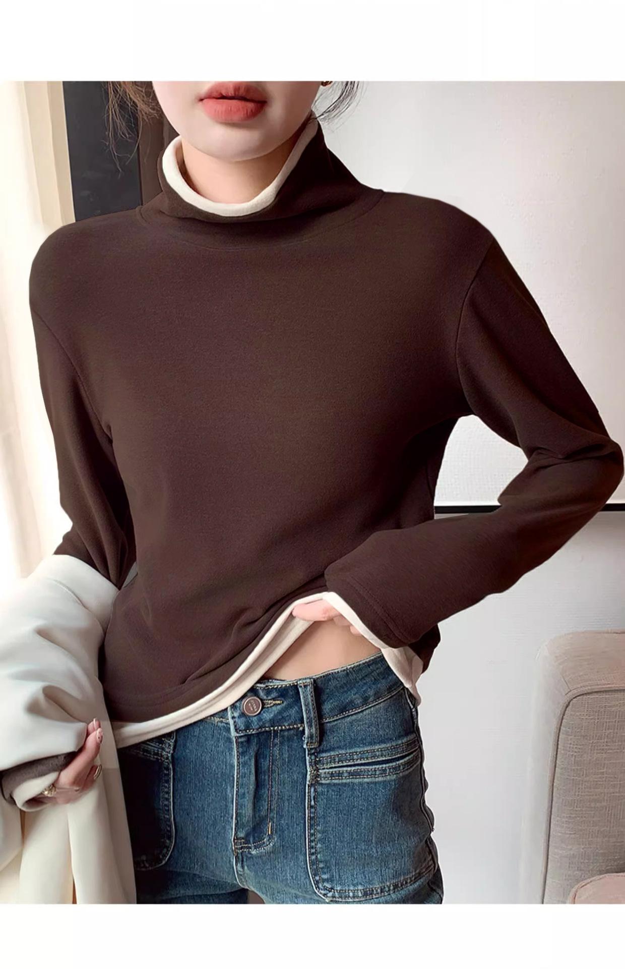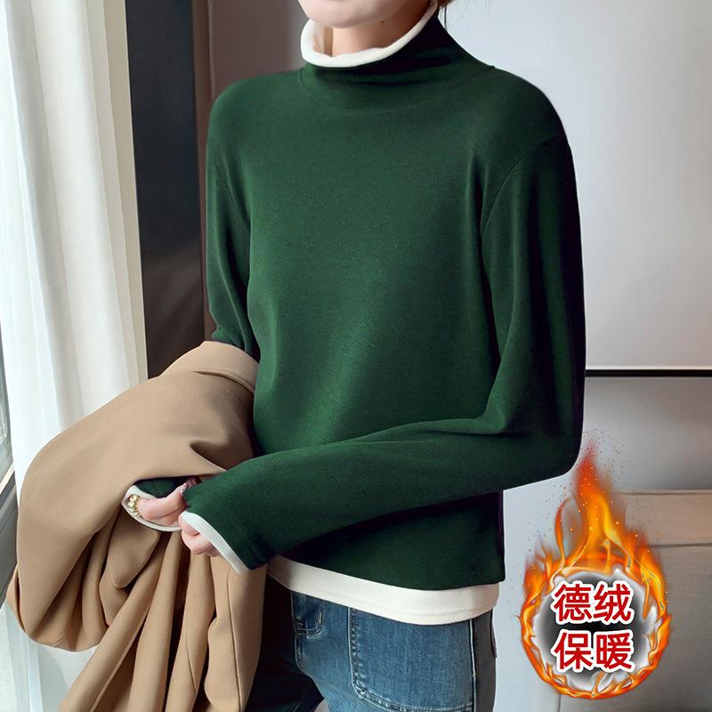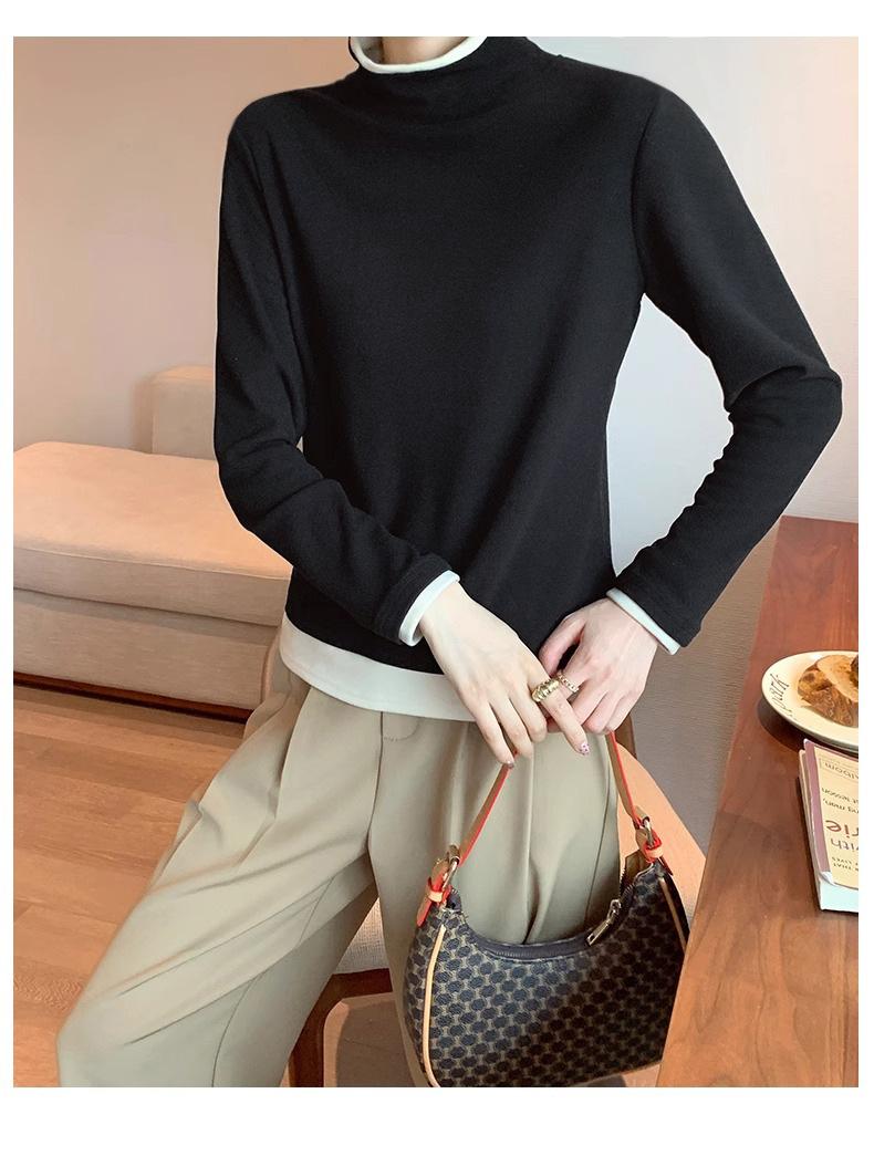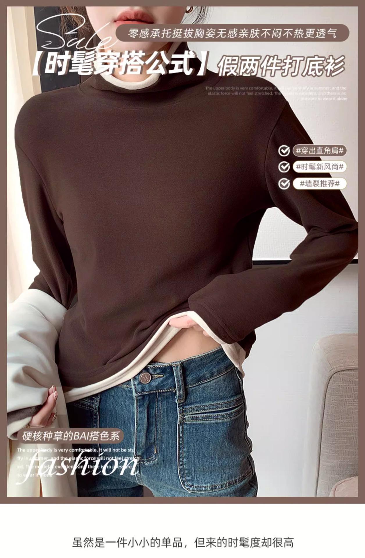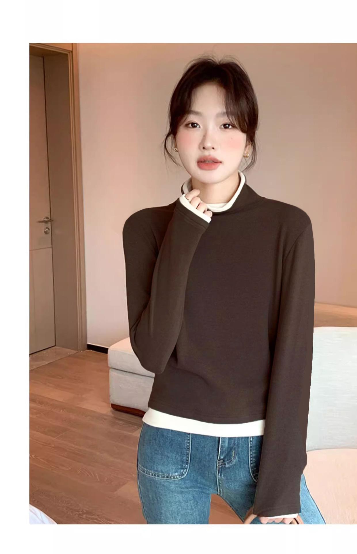 Camiseta base de terciopelo de manga larga estilo Maillard de estilo coreano de dos piezas falsas con cuello alto, nueva de otoño e invierno, cálida y combinable para mujer