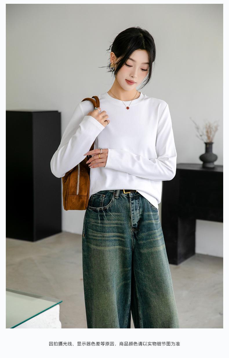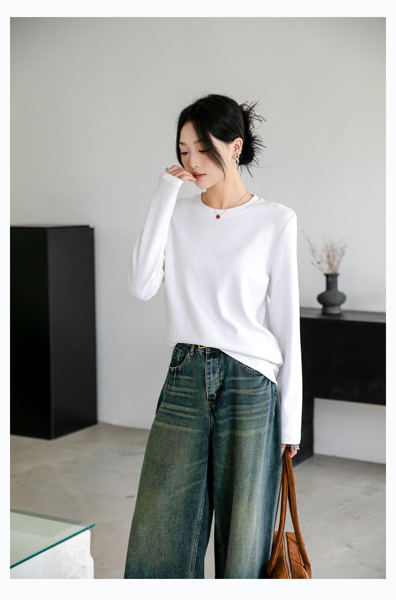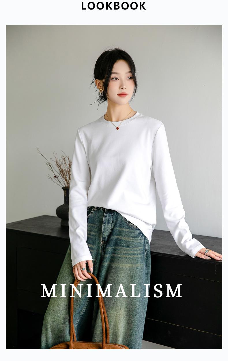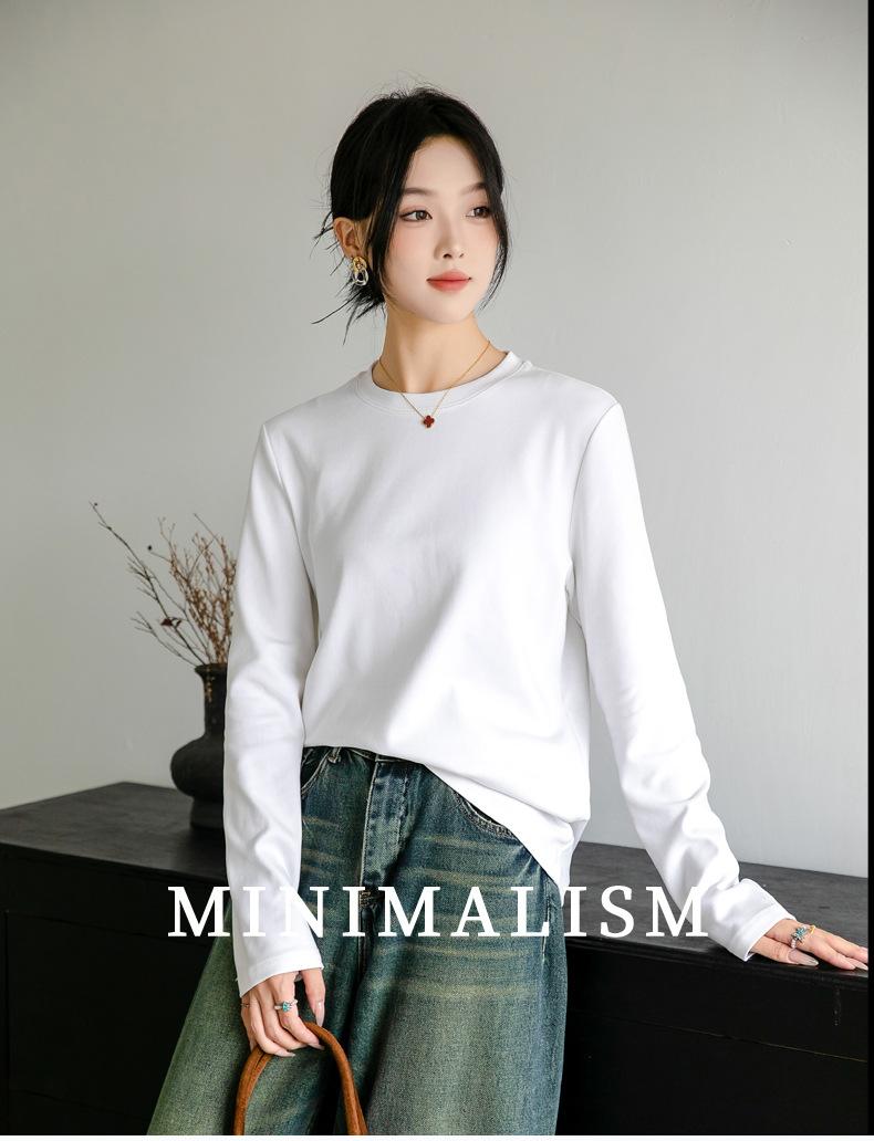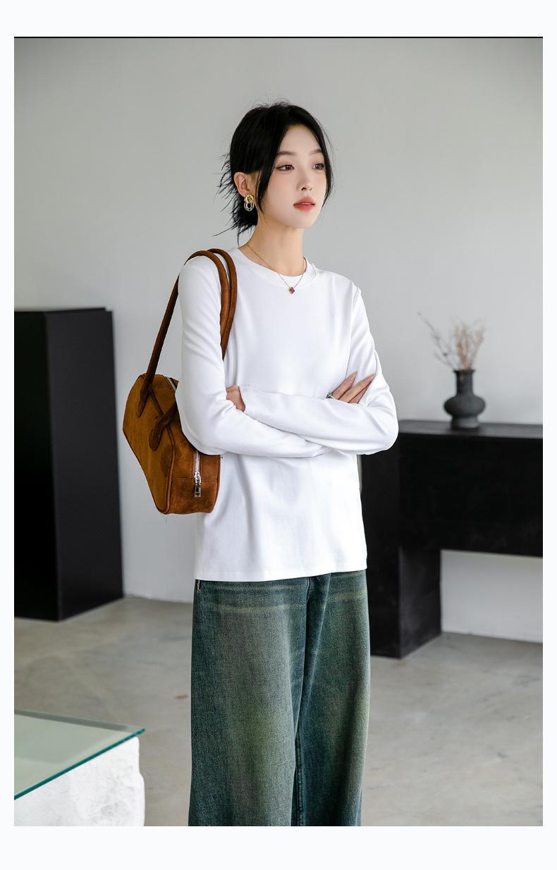 Camiseta básica de color liso que combina con todo para mujer, otoño e invierno 2024, nueva camiseta holgada, ajustada, con cuello redondo y microelástica de manga larga.