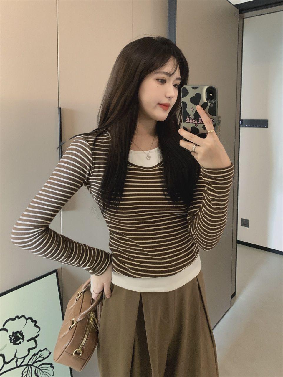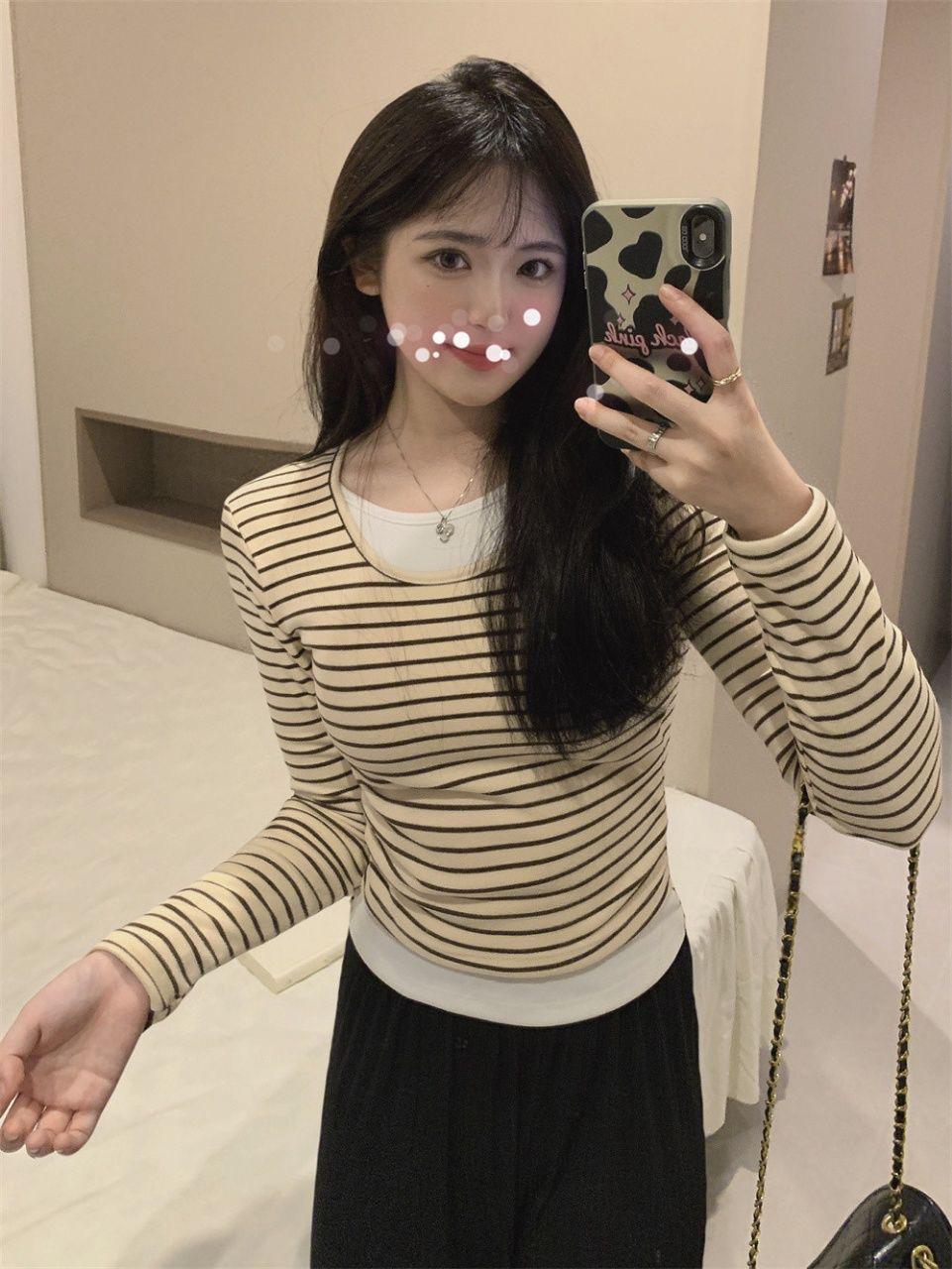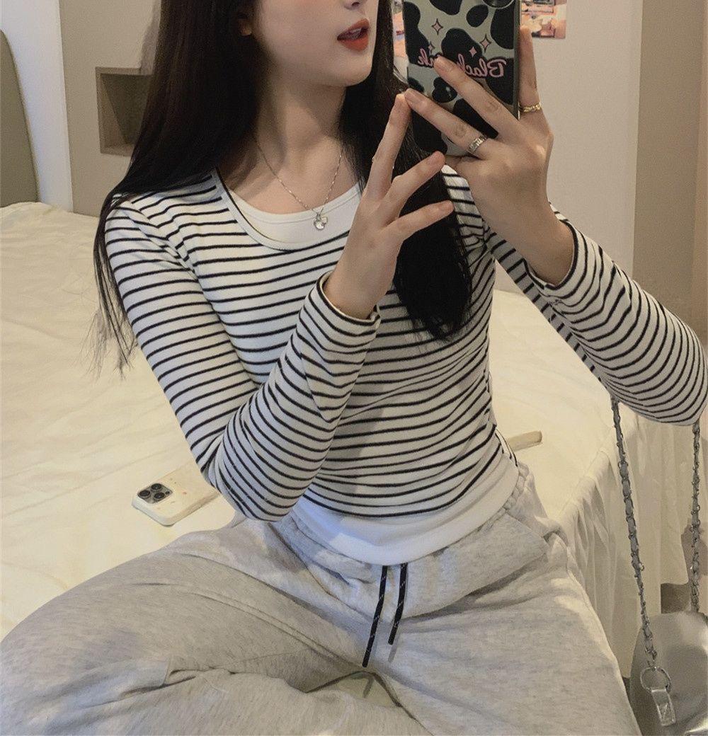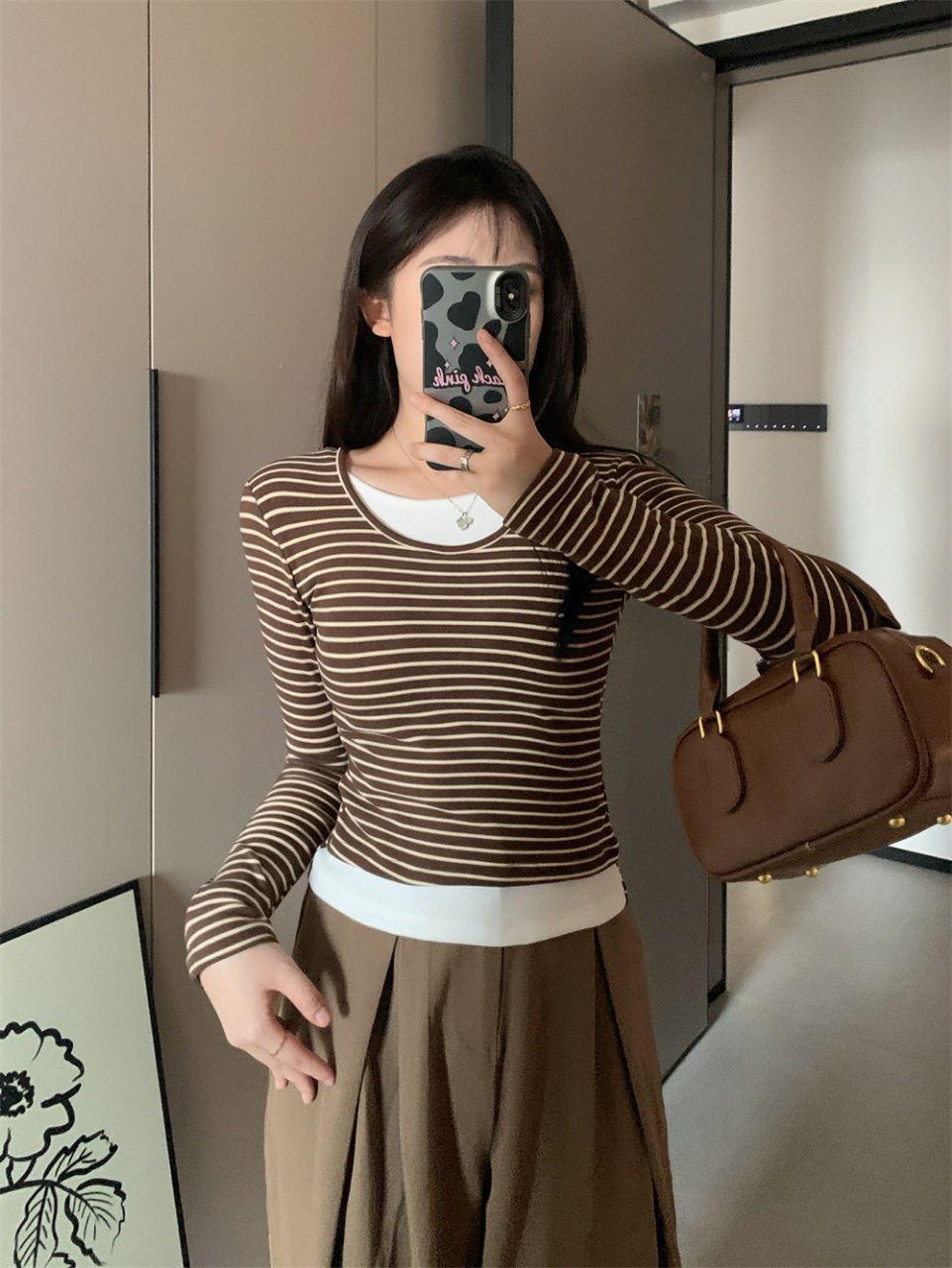Camiseta de manga larga con cuello redondo de terciopelo para mujer, otoño 2024, nuevo diseño de estilo coreano, estilo nicho falso, camisa base de dos piezas