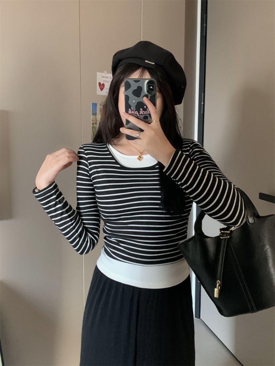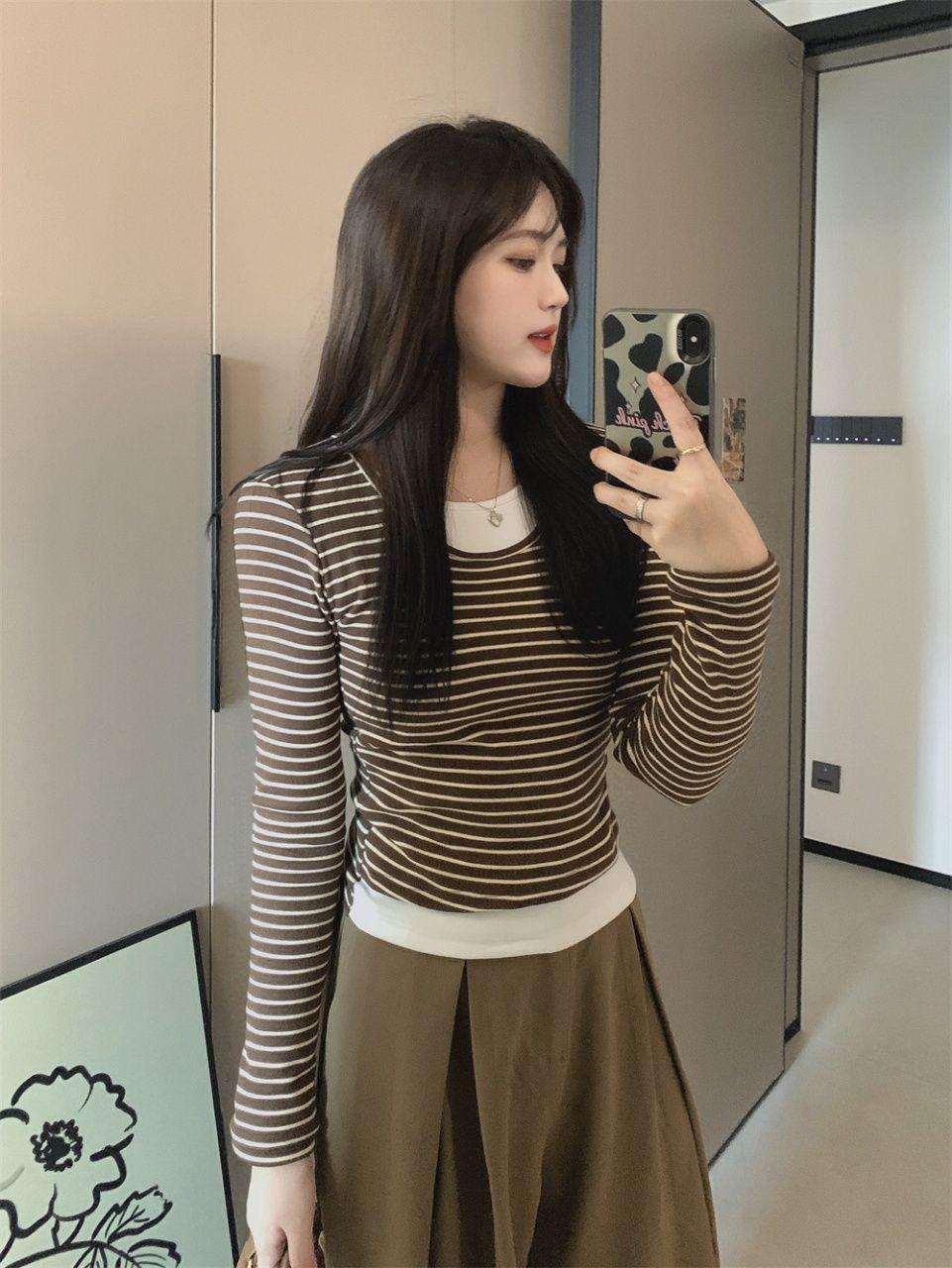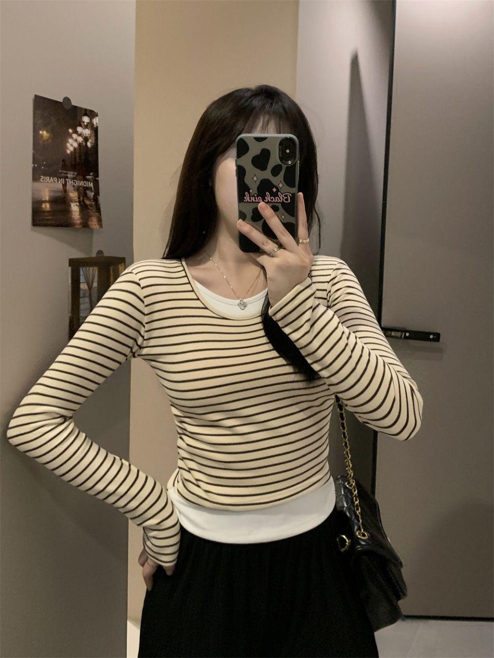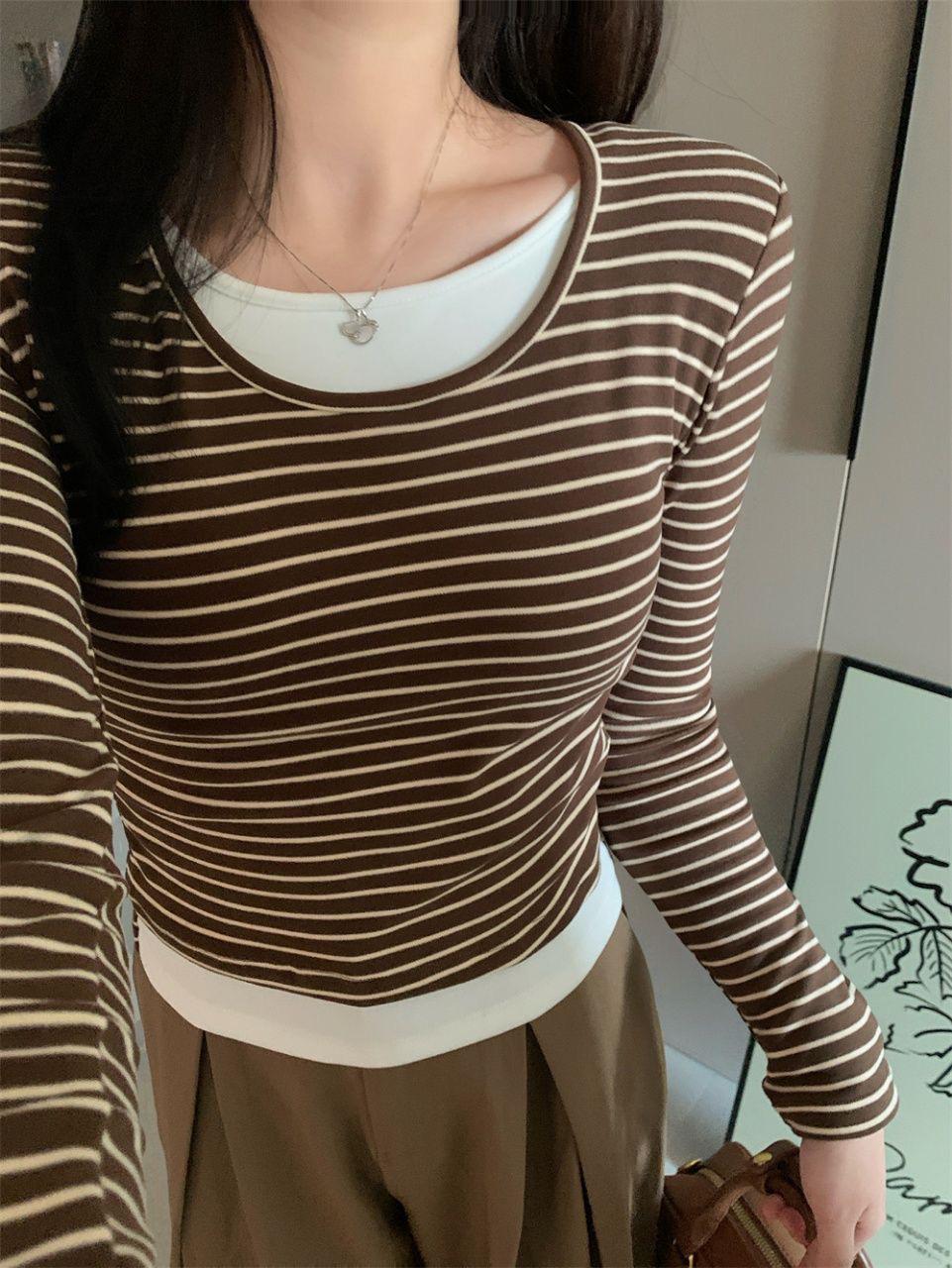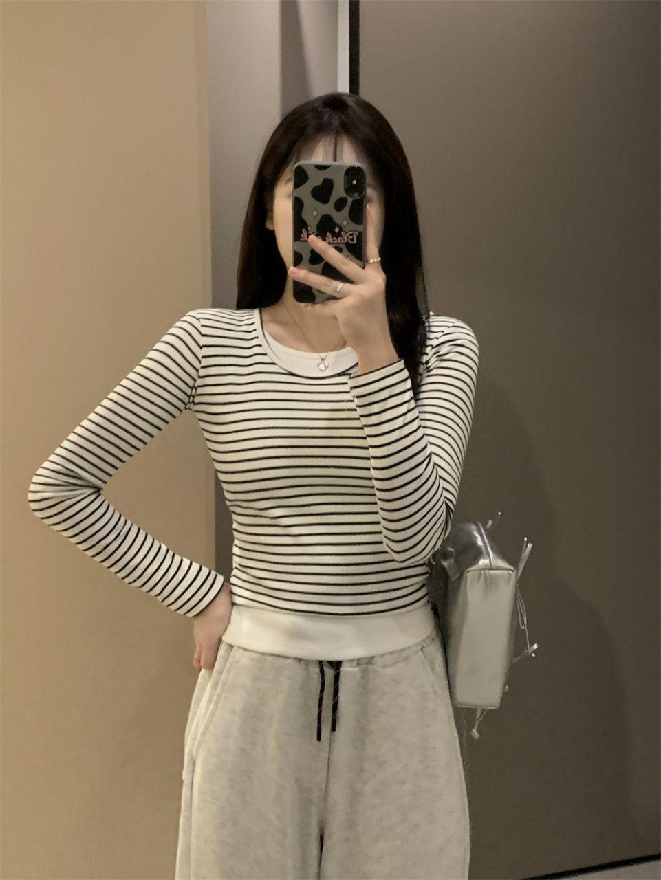 Camiseta de manga larga con cuello redondo de terciopelo para mujer, otoño 2024, nuevo diseño de estilo coreano, estilo nicho falso, camisa base de dos piezas