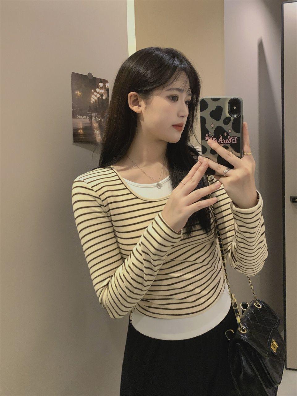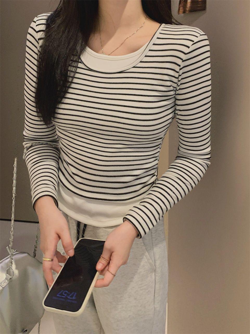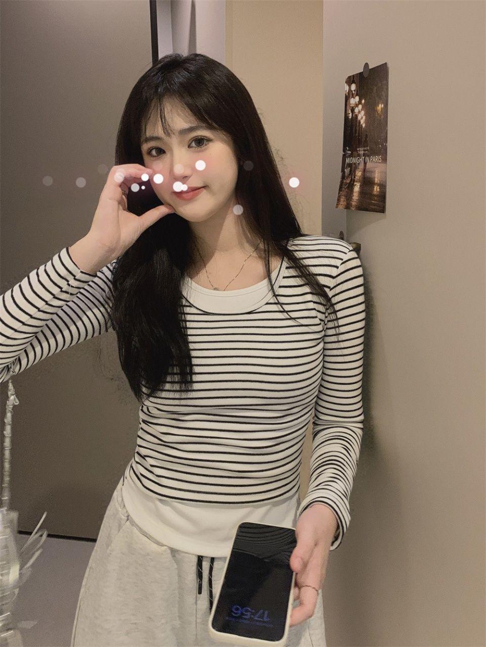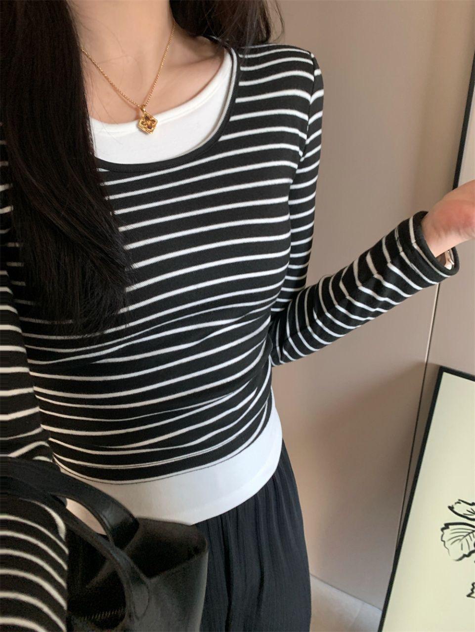 Camiseta de manga larga con cuello redondo de terciopelo para mujer, otoño 2024, nuevo diseño de estilo coreano, estilo nicho falso, camisa base de dos piezas