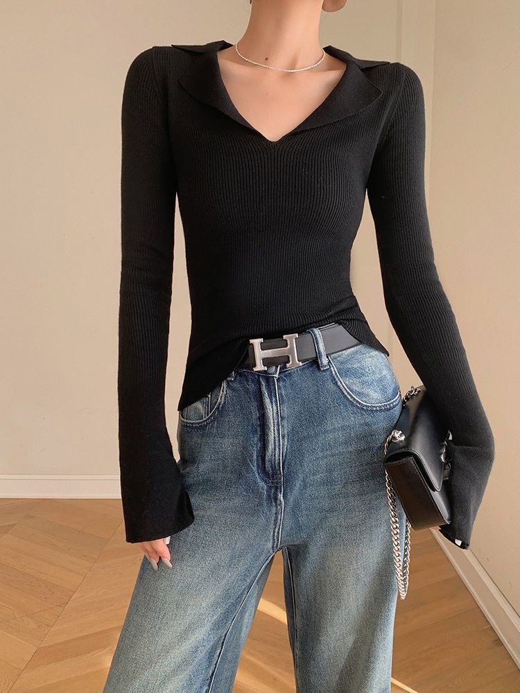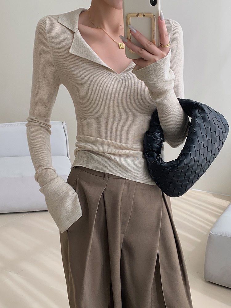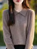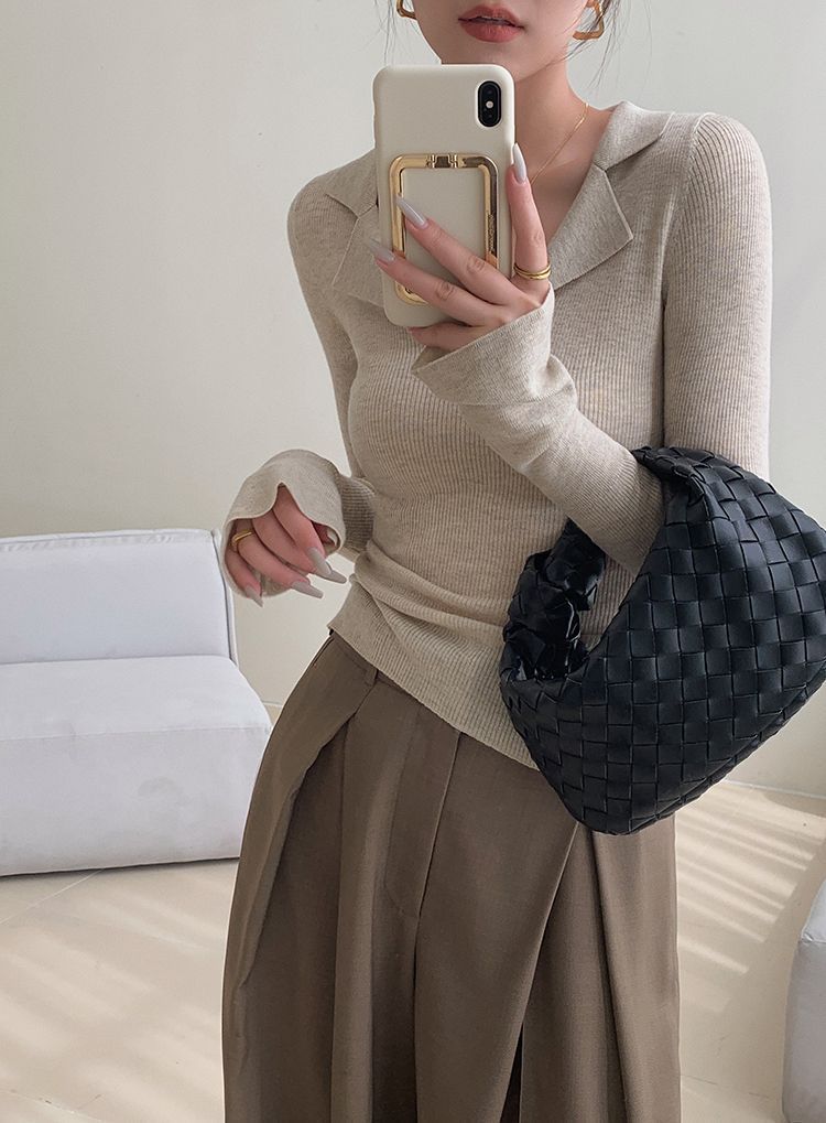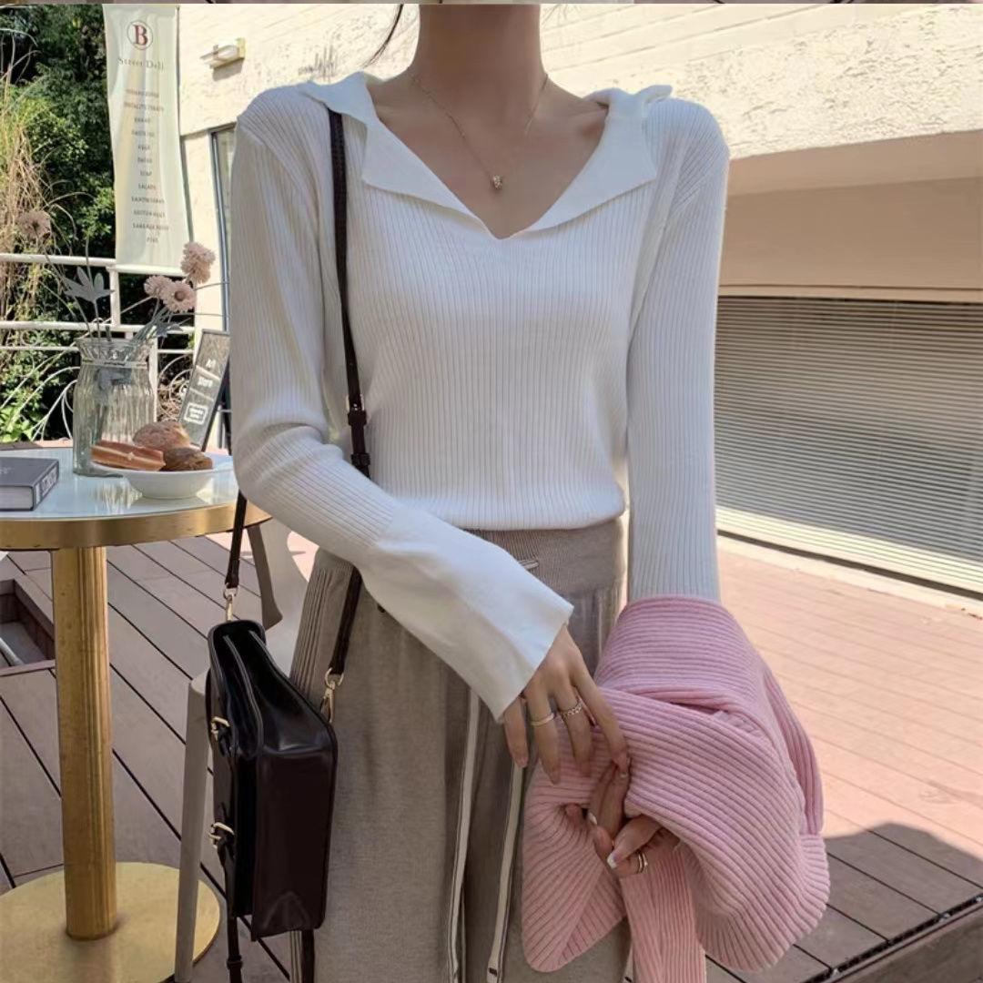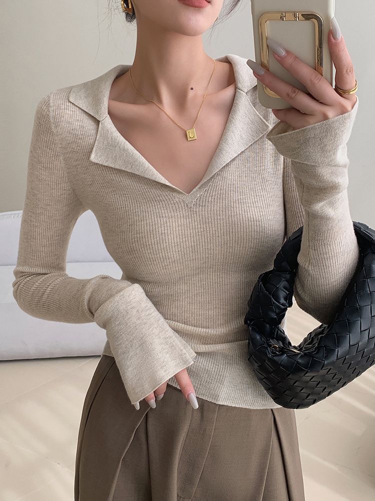 Suéter de punto con cuello tipo polo y mangas abullonadas para mujer, diseño de otoño e invierno, nuevo jersey de manga larga, camisa básica que combina con todo, corte ajustado y adelgazante.