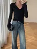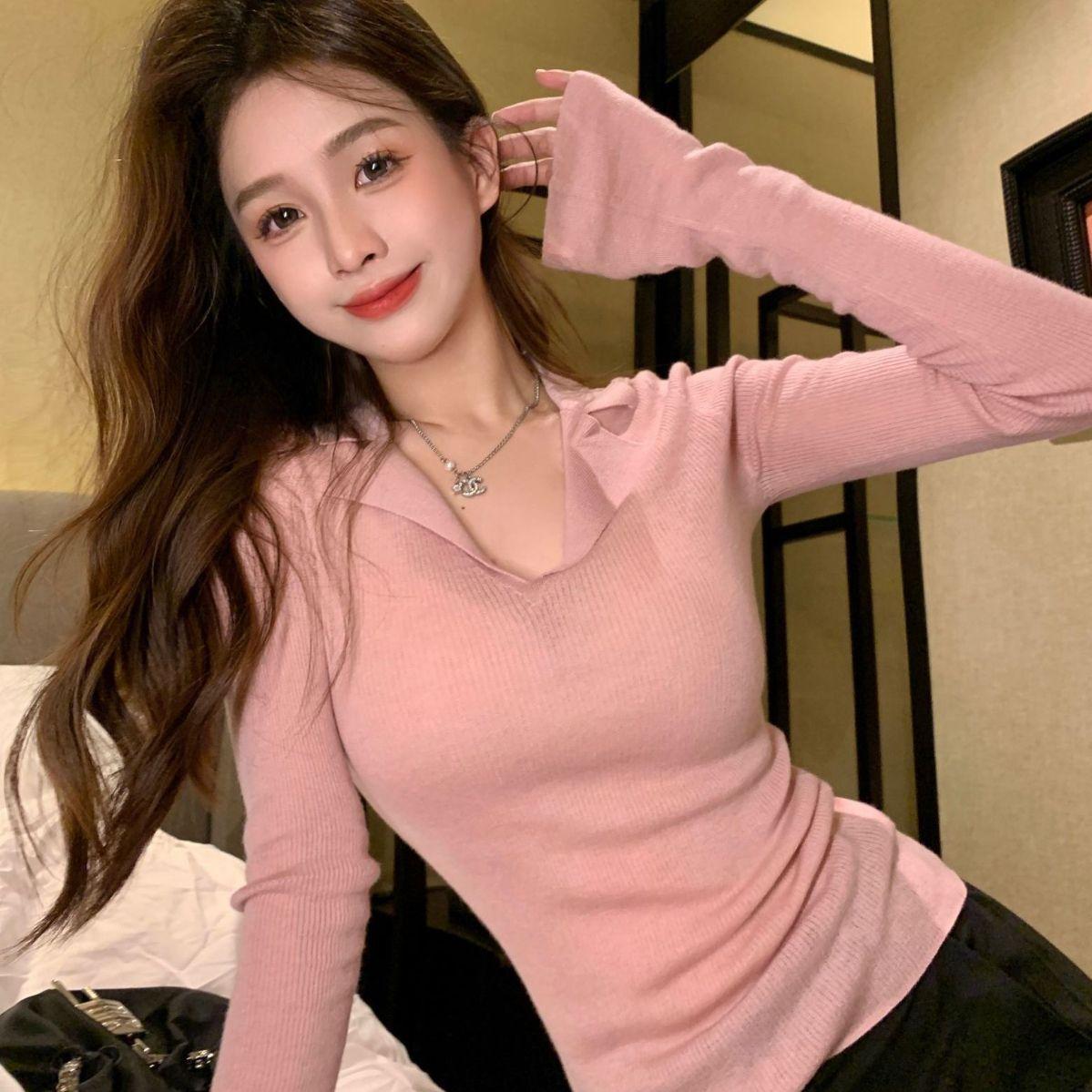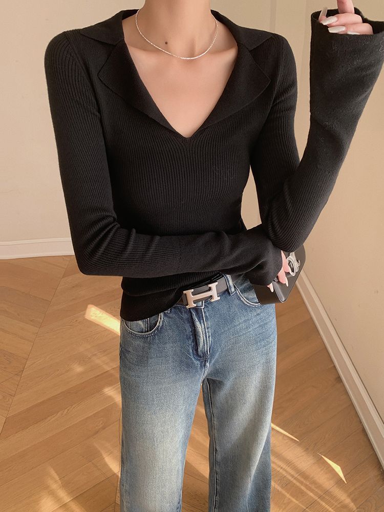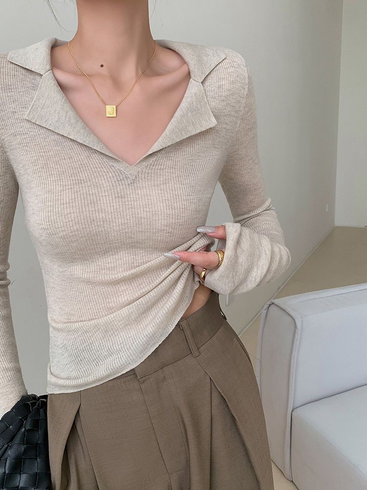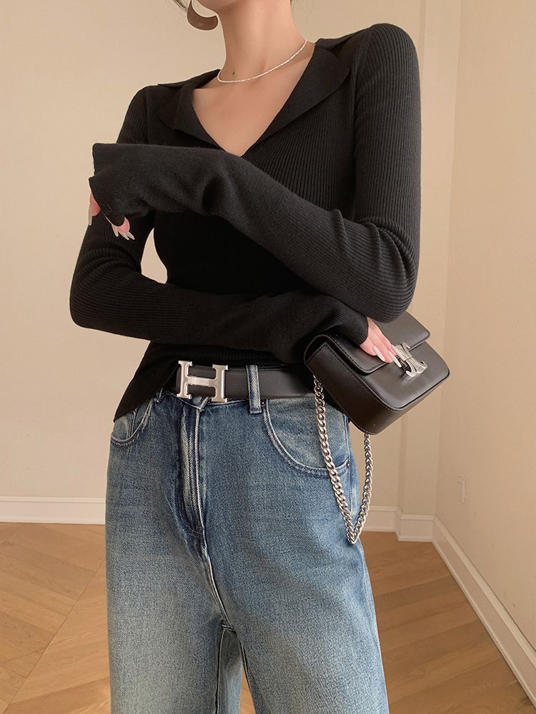 Suéter de punto con cuello tipo polo y mangas abullonadas para mujer, diseño de otoño e invierno, nuevo jersey de manga larga, camisa básica que combina con todo, corte ajustado y adelgazante.