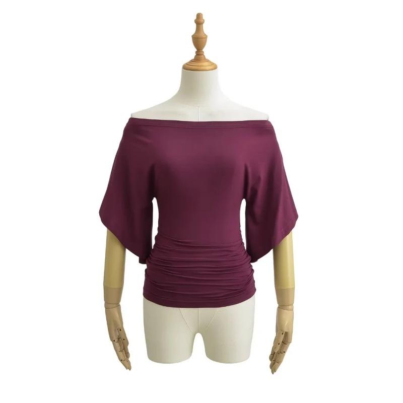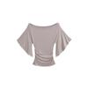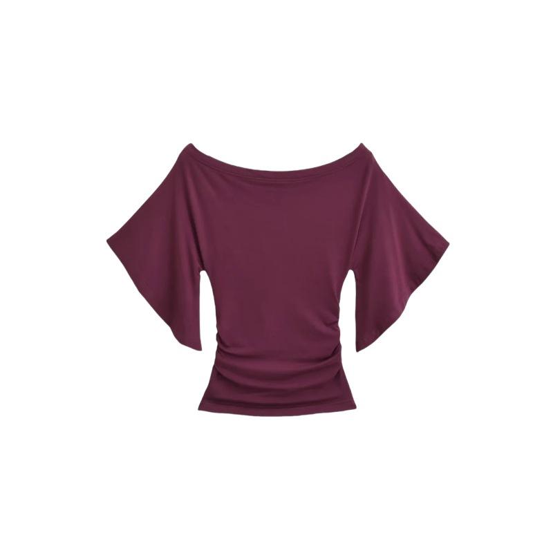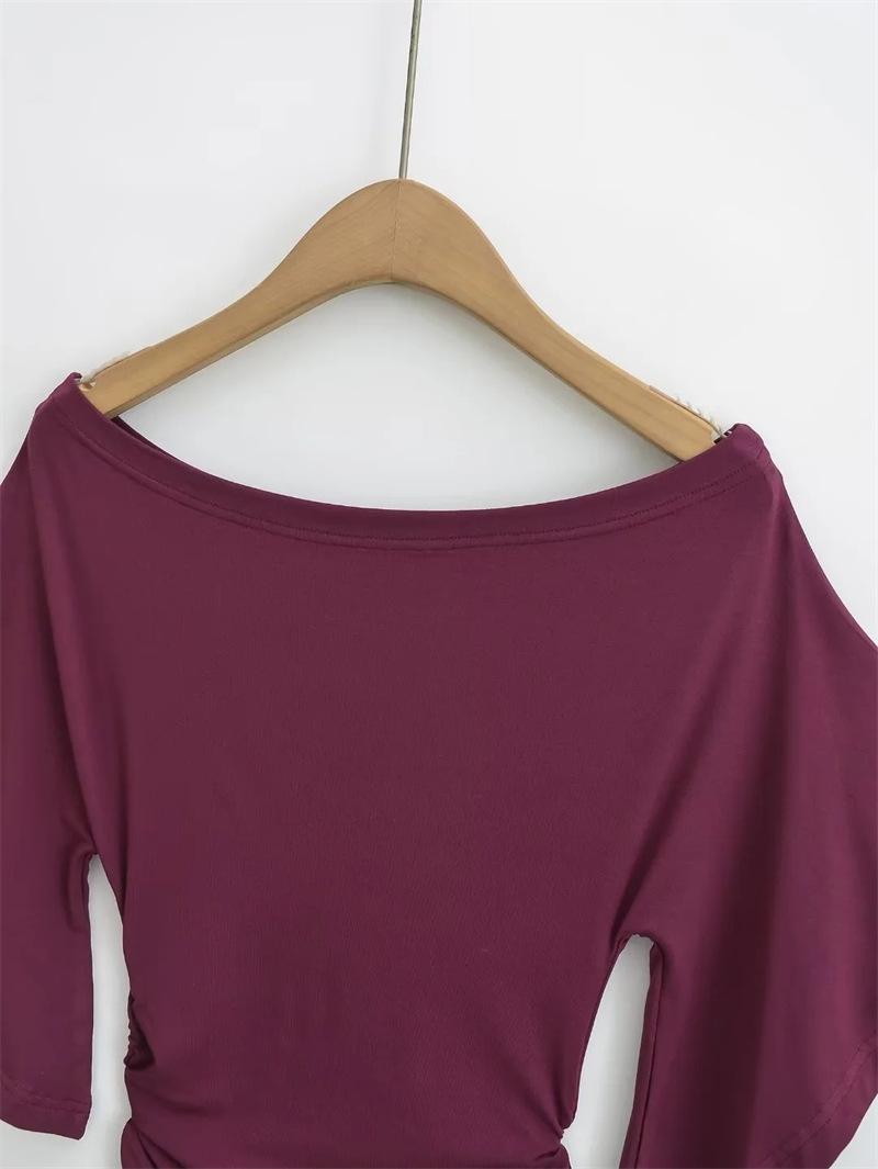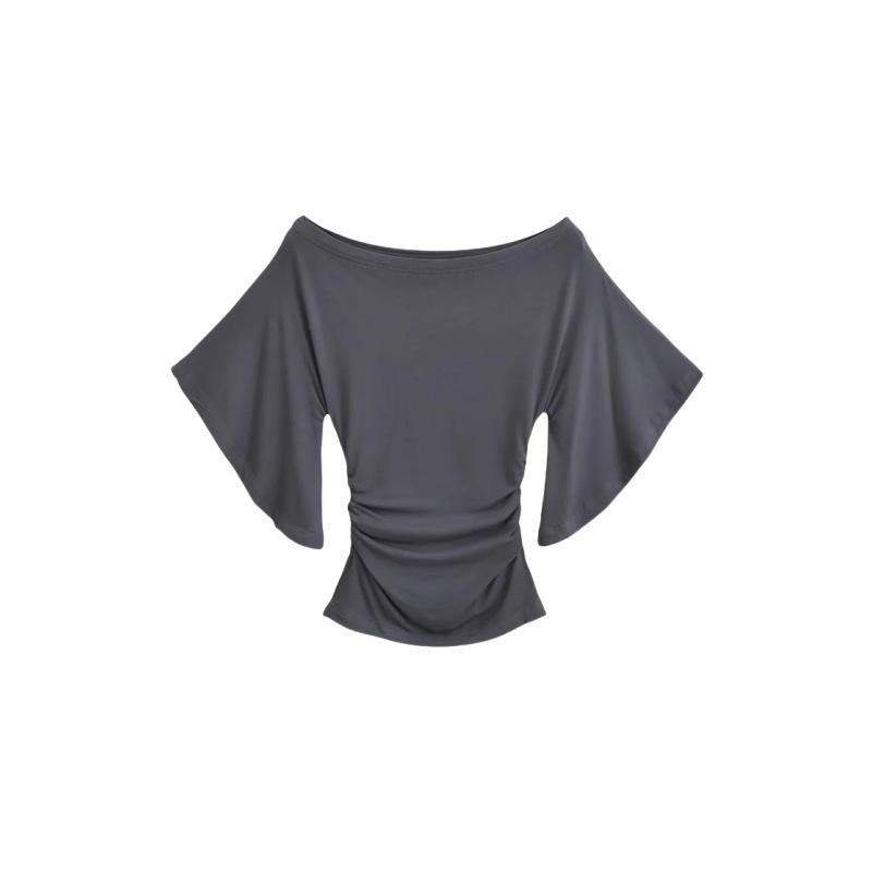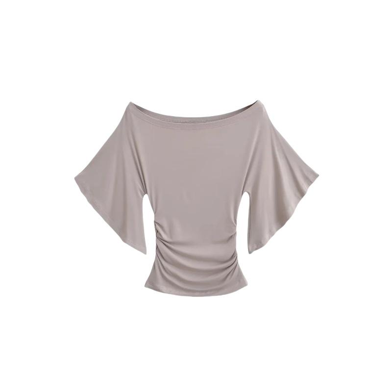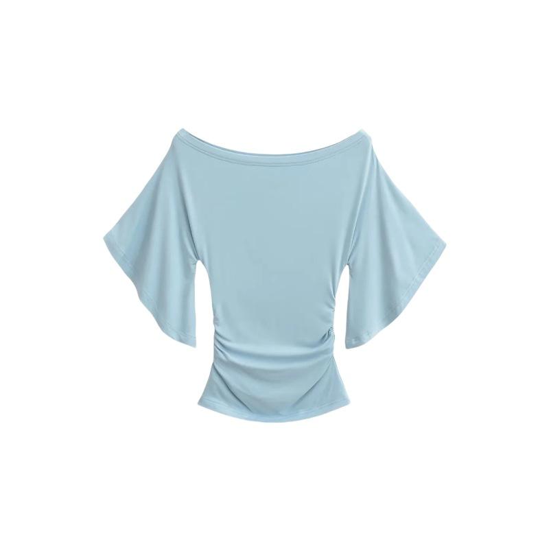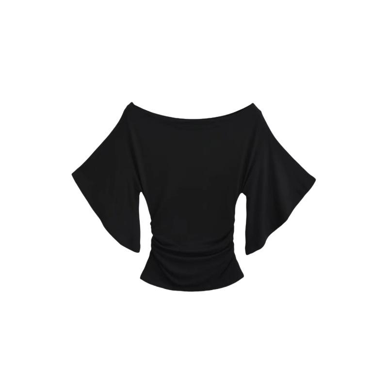 Camiseta sexy de manga acampanada con cuello y hombros descubiertos para mujer, estilo europeo y americano, elástica, ajustada, plisada, corta y pura