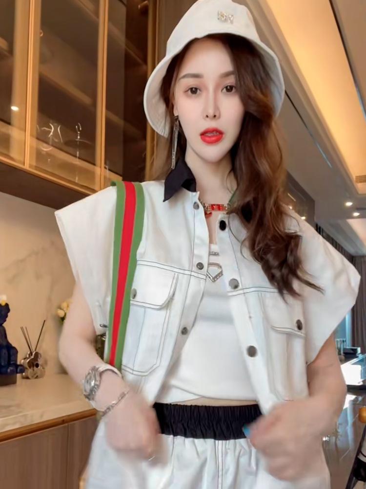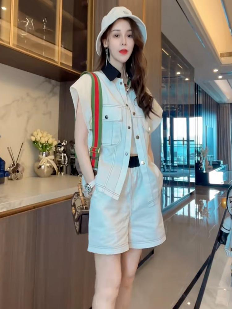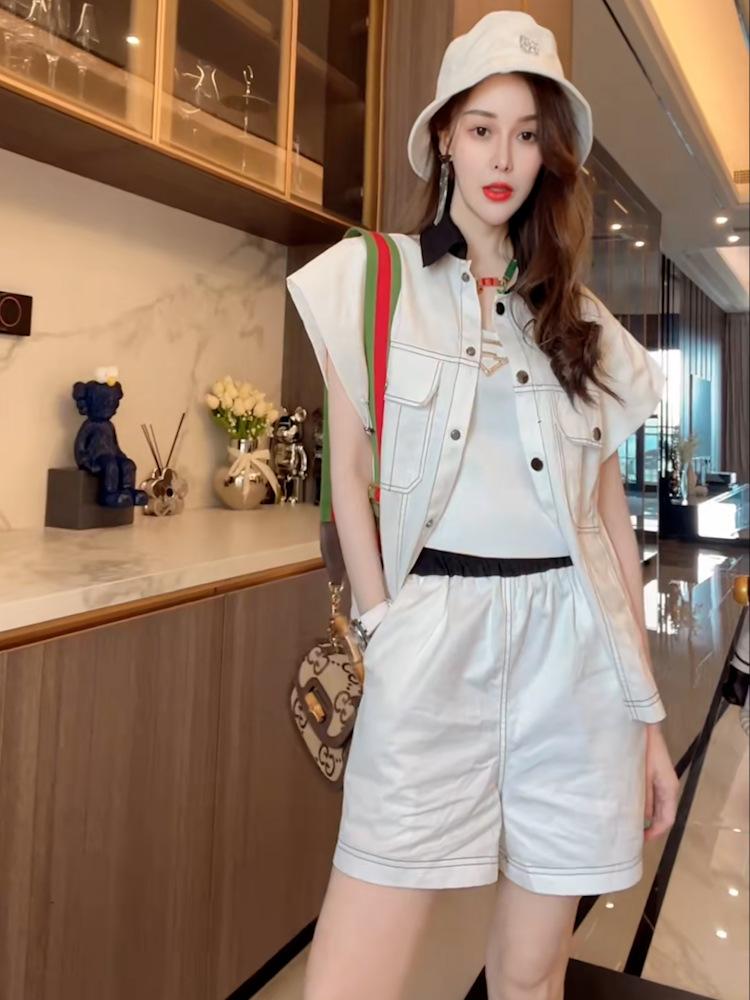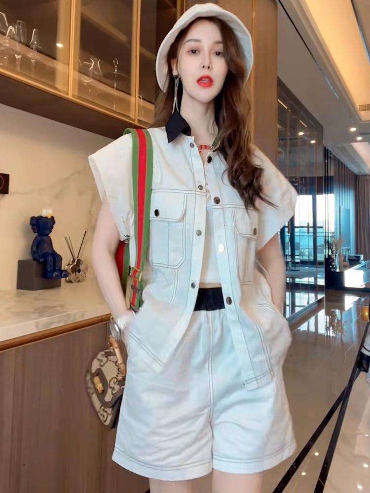 Cárdigan de dos piezas de color sólido, sencillo y combinable con todo, top de moda, pantalones cortos holgados de cintura alta, traje de verano 2024