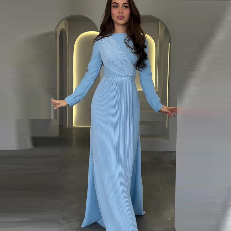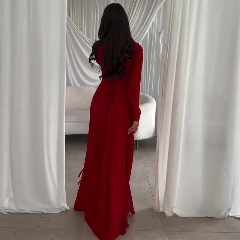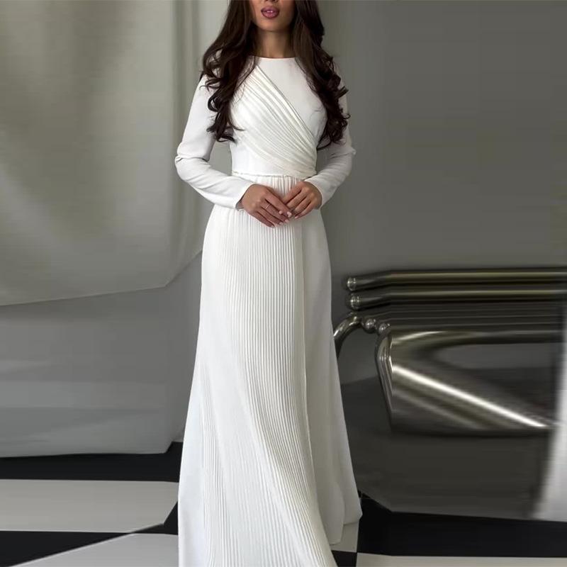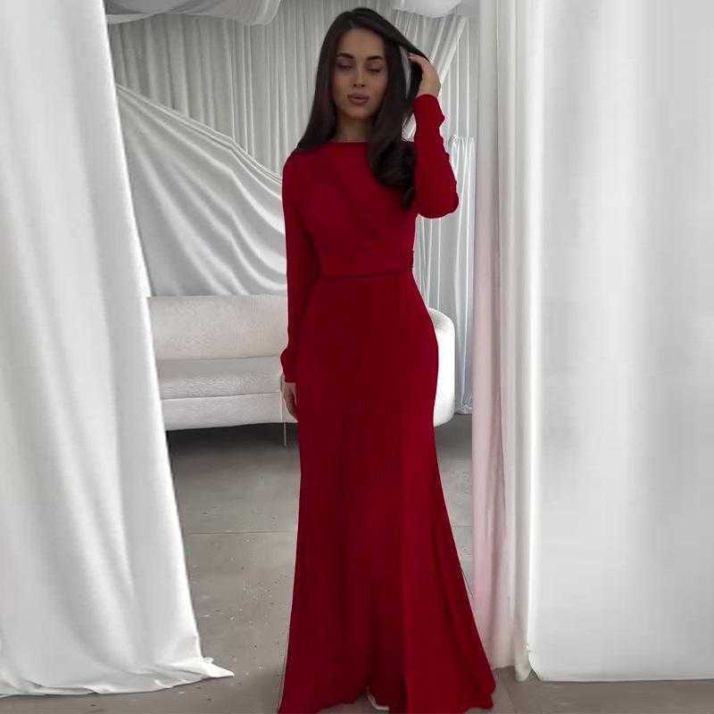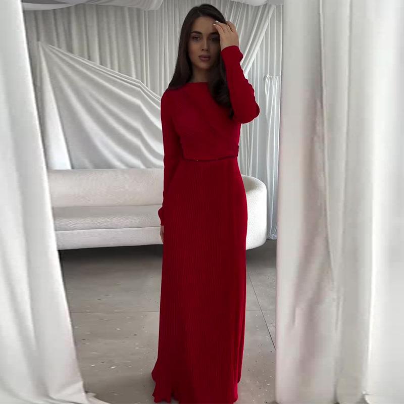 Otoño 2024 Nuevo Europeo y Americano Transfronterizo Amazon Transfronterizo Vestido de Manga Larga con Cuello Redondo de Color Sólido para Mujer con Costuras en la Cintura Alta