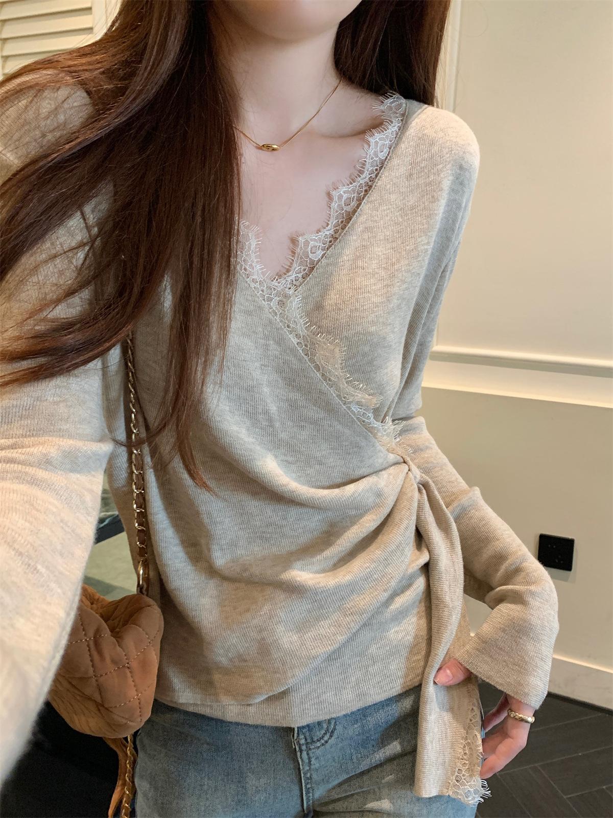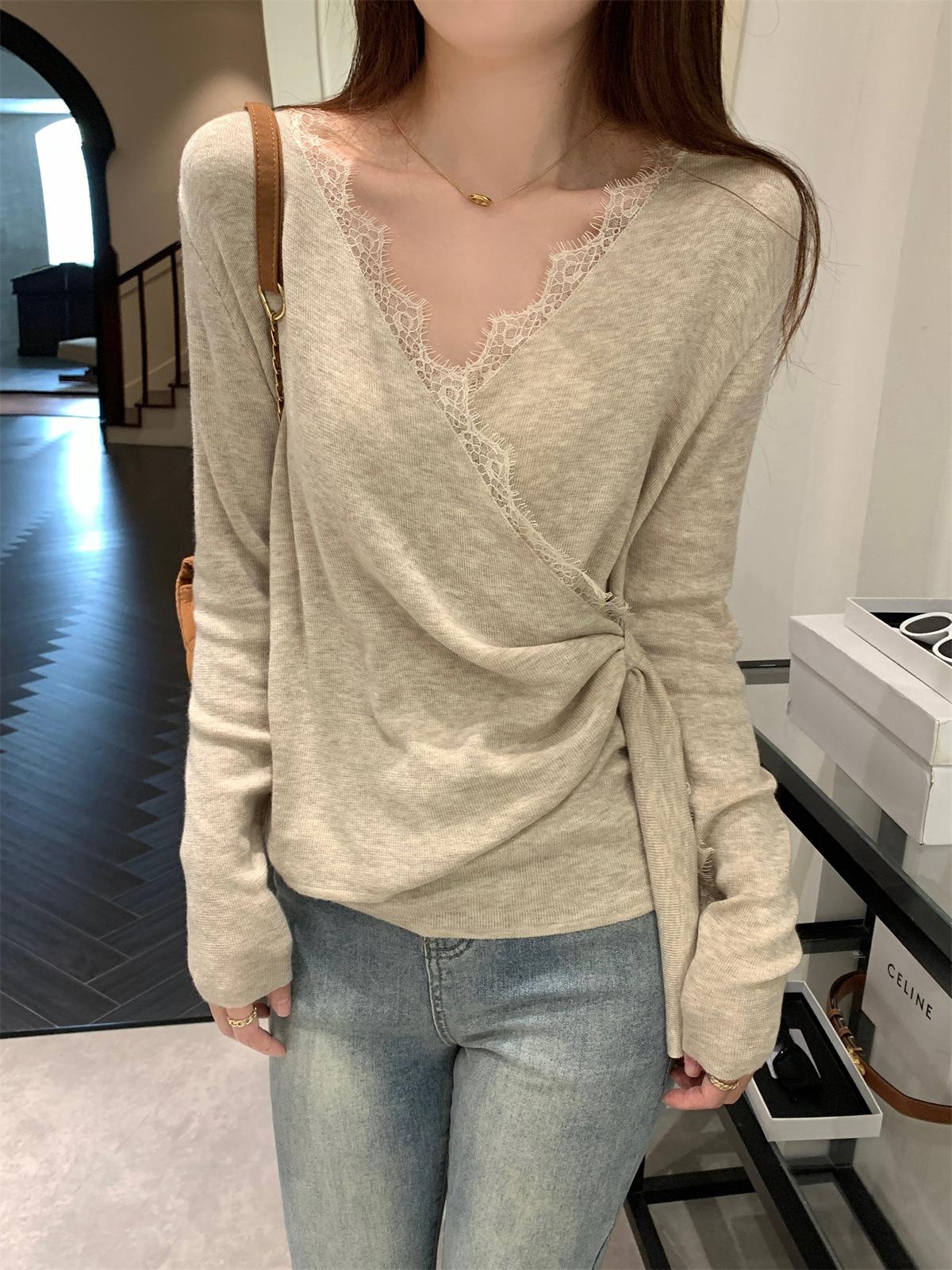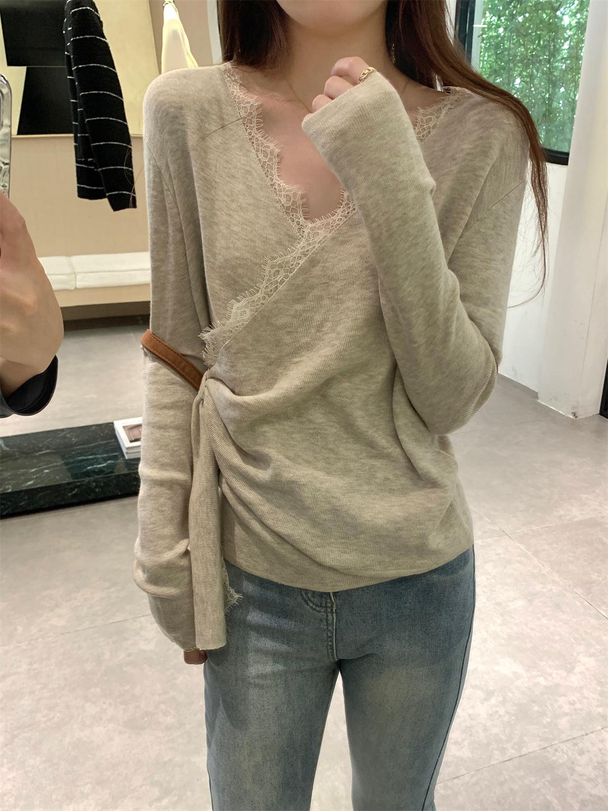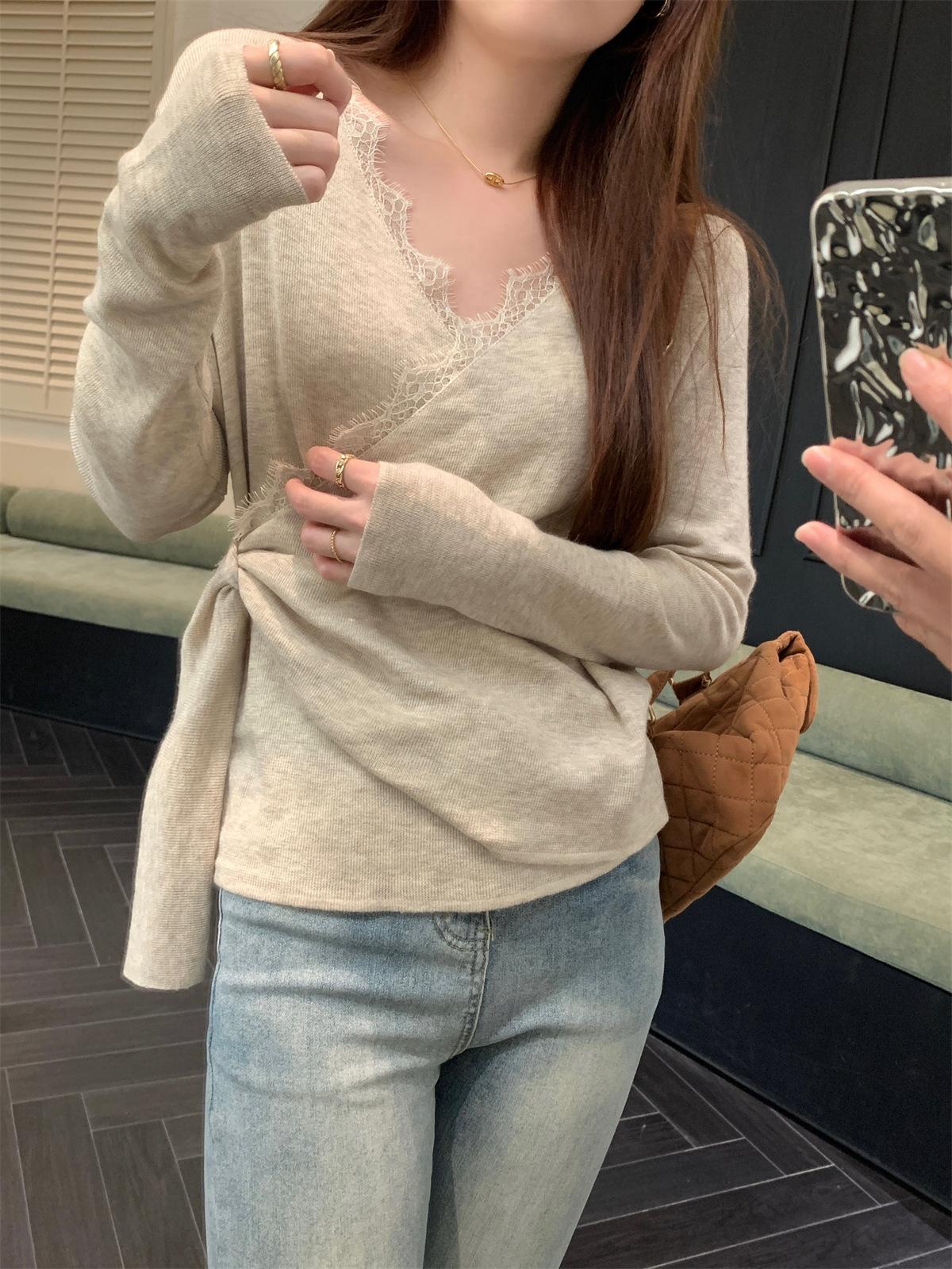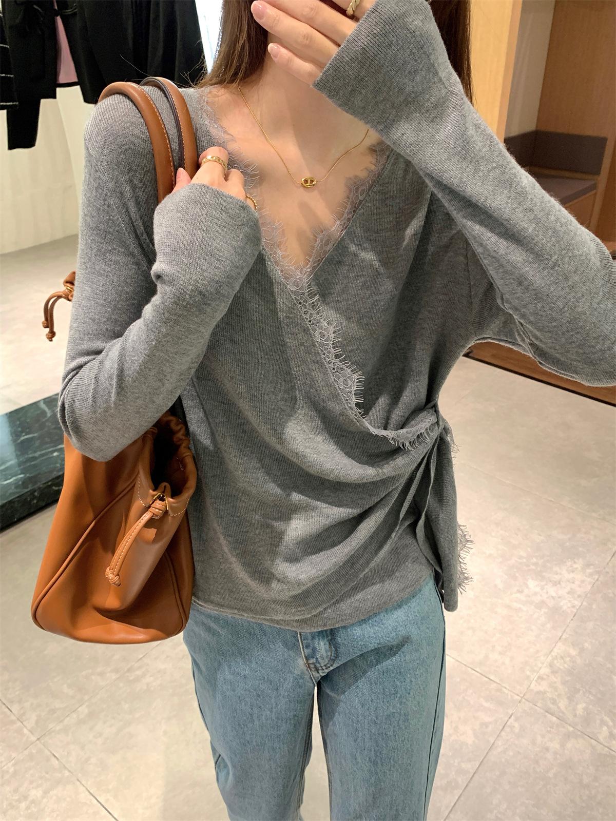 Top de punto de manga larga con diseño de nicho irregular y cintura cruzada con encaje de estilo coreano para otoño e invierno, color gris