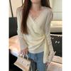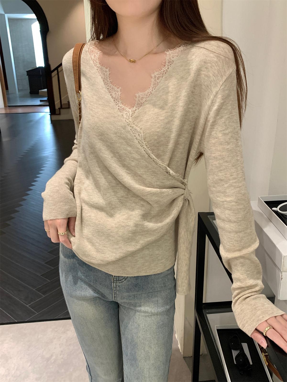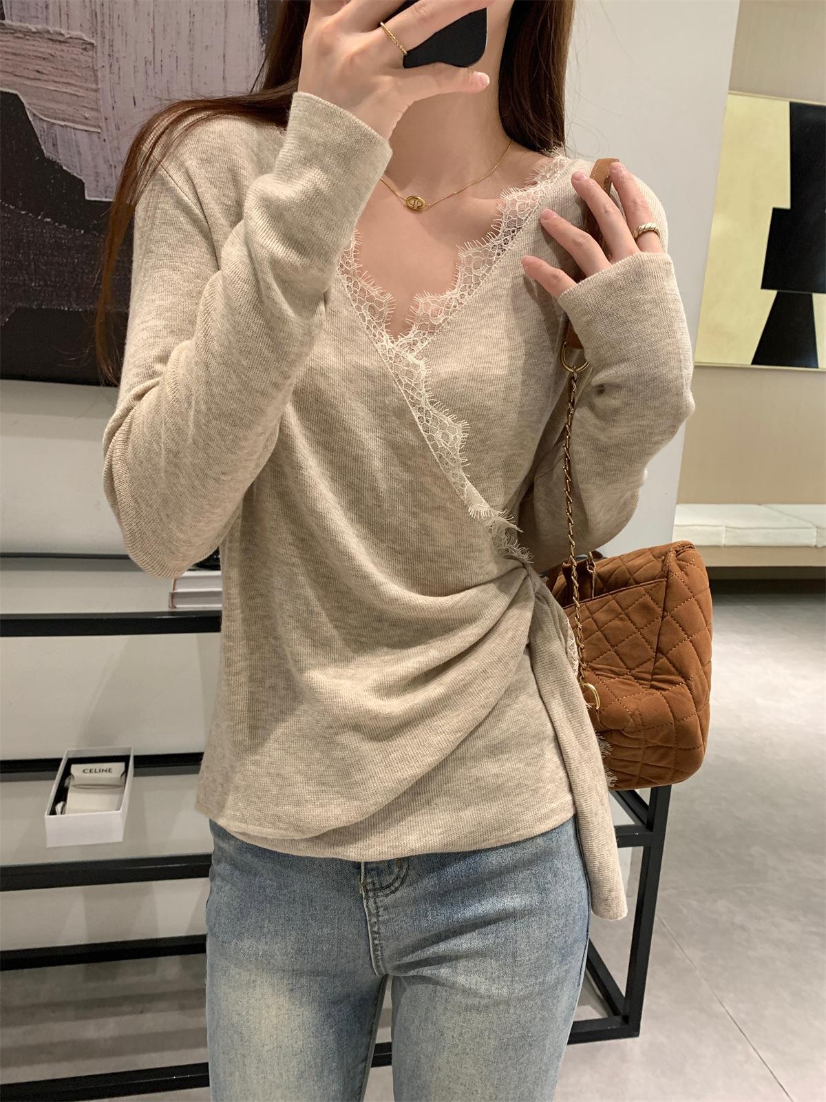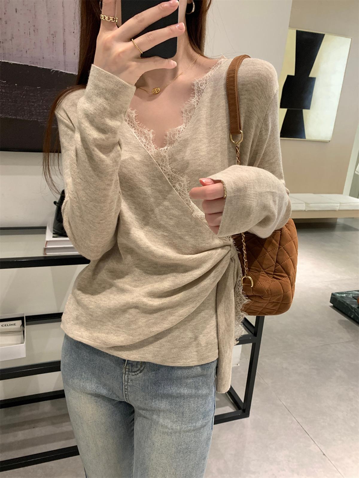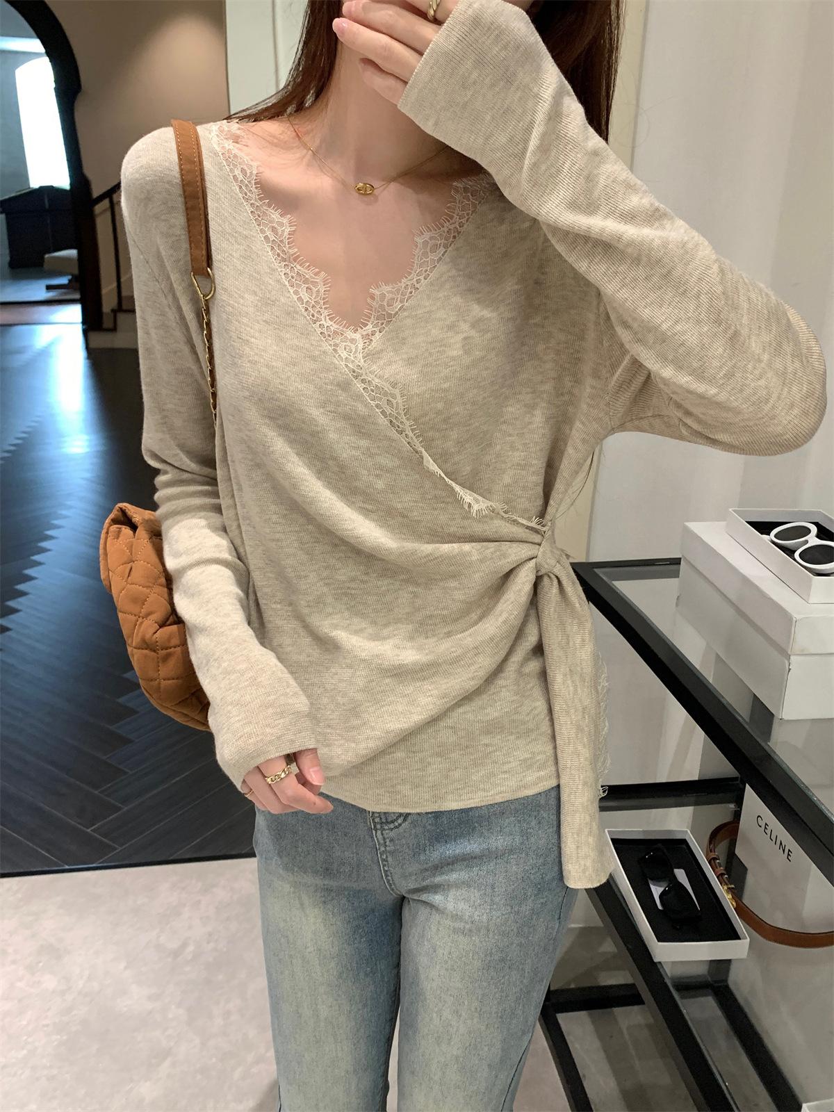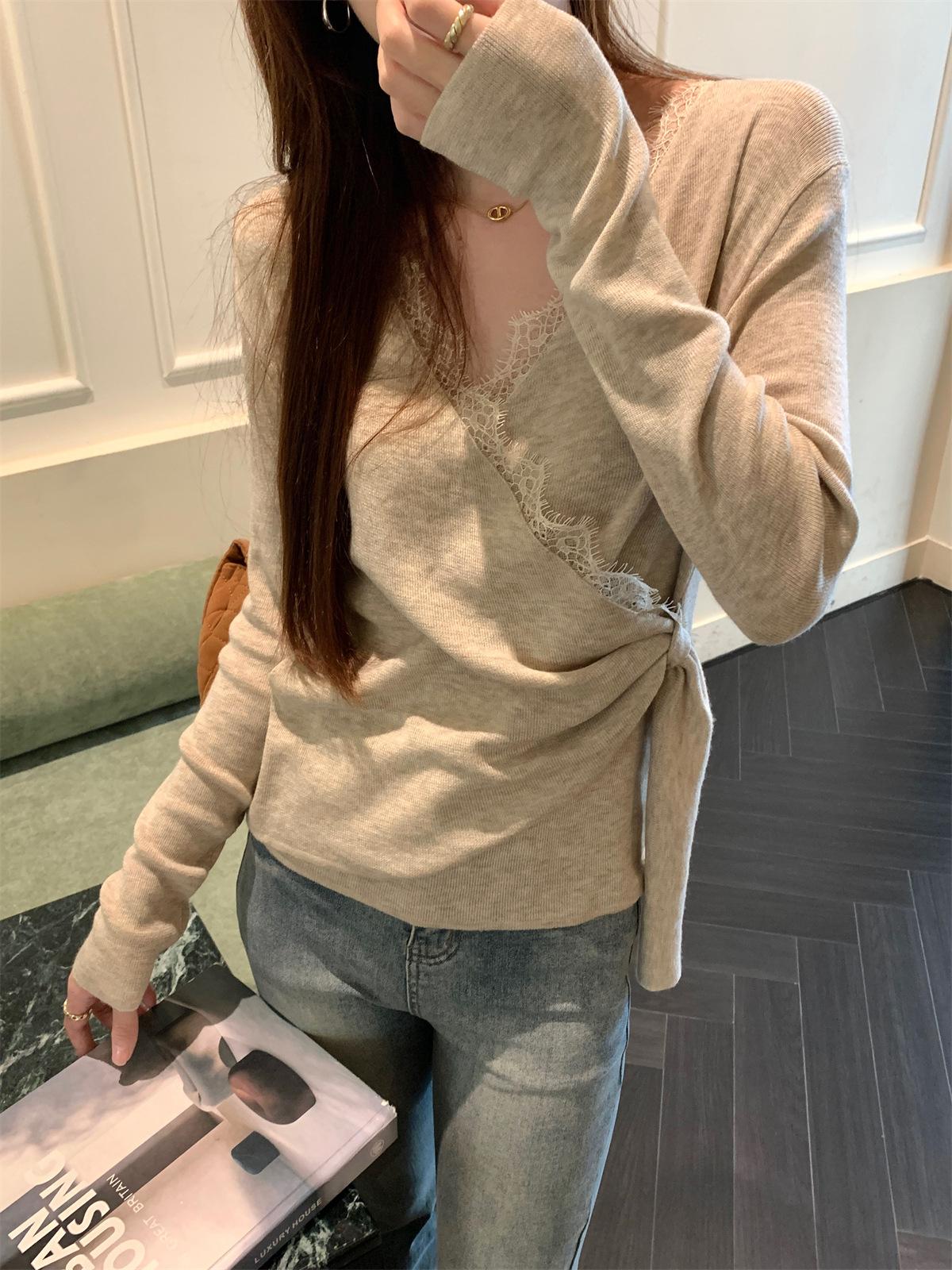 Top de punto de manga larga con diseño de nicho irregular y cintura cruzada con encaje de estilo coreano para otoño e invierno, color gris