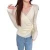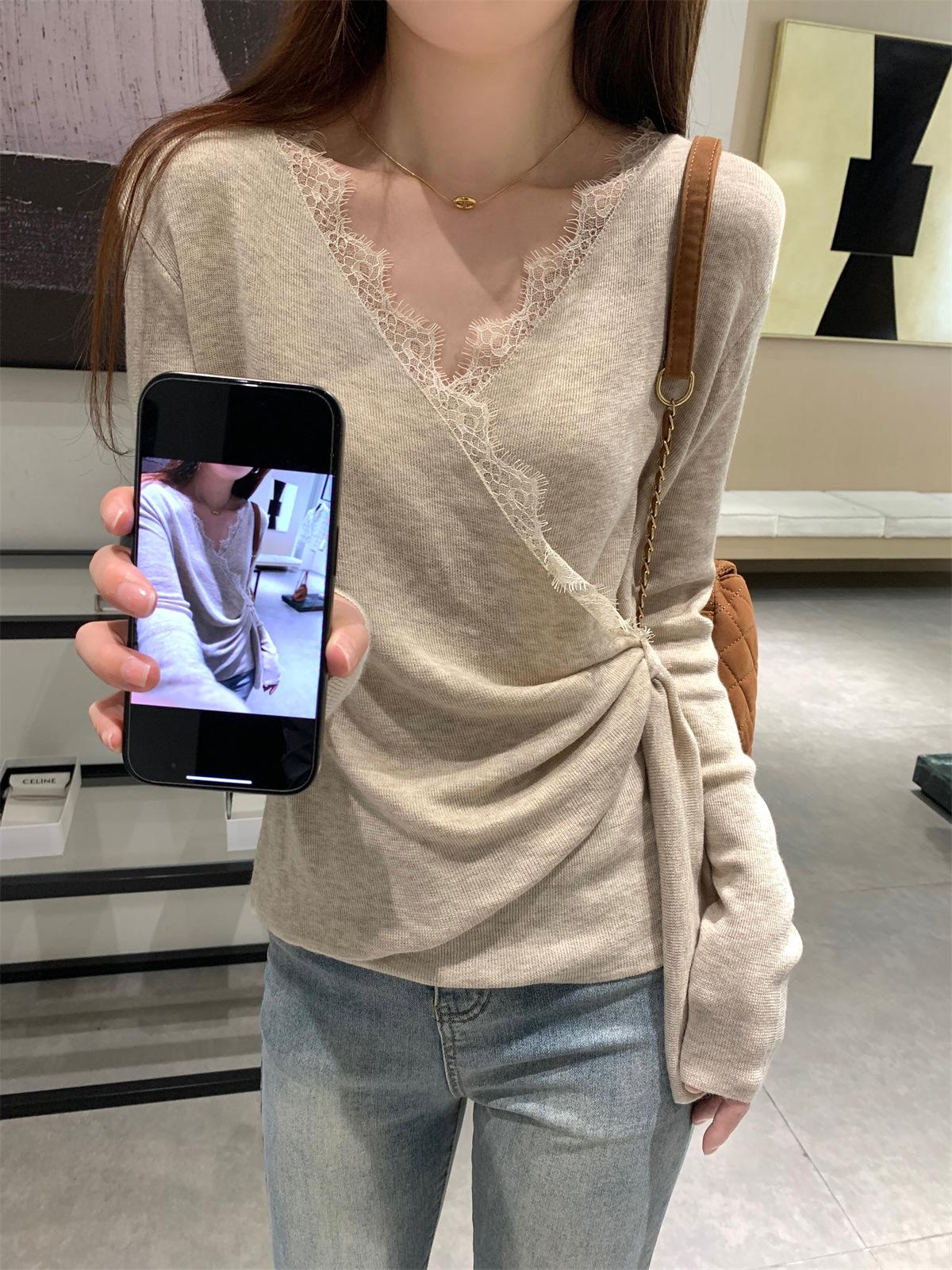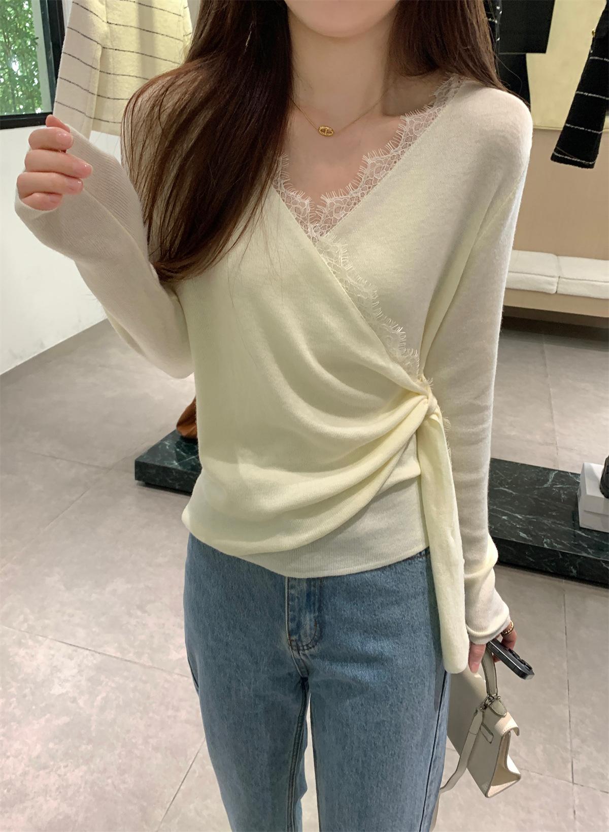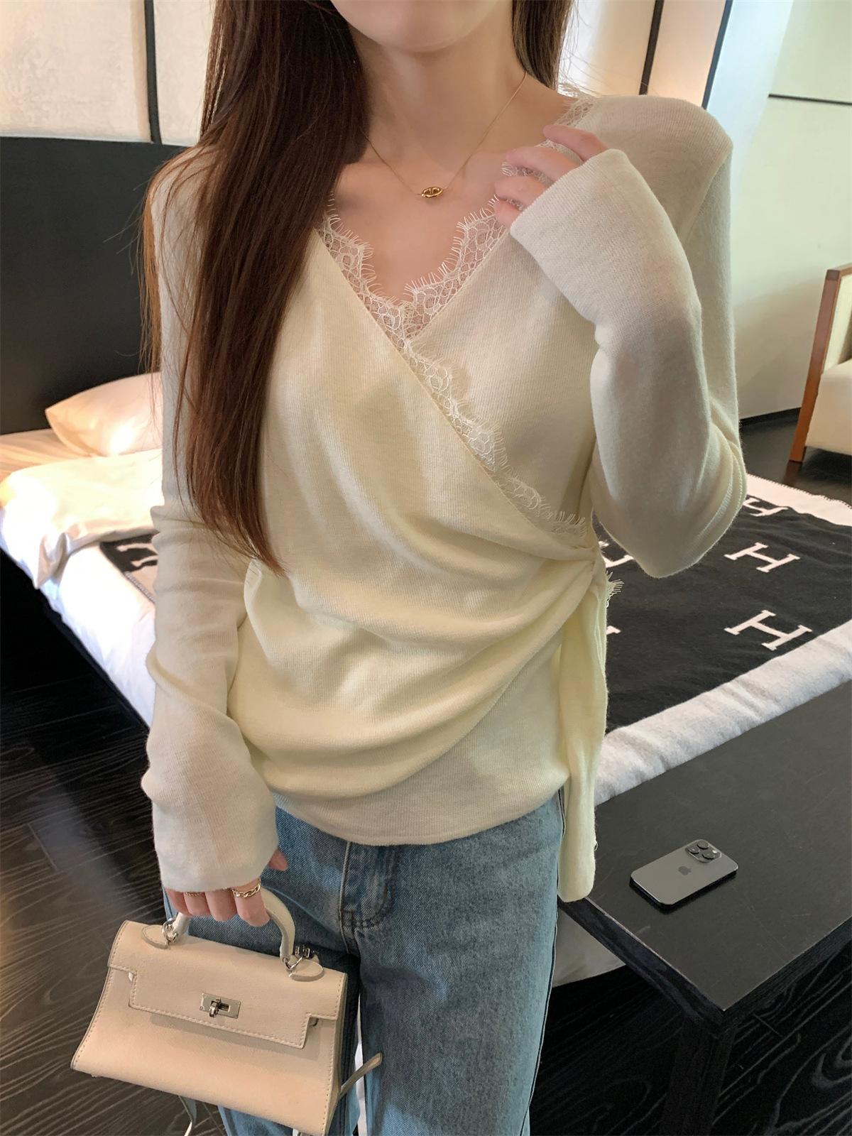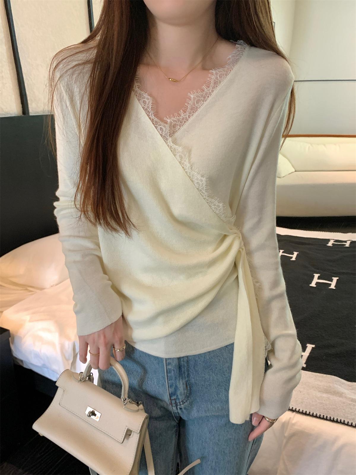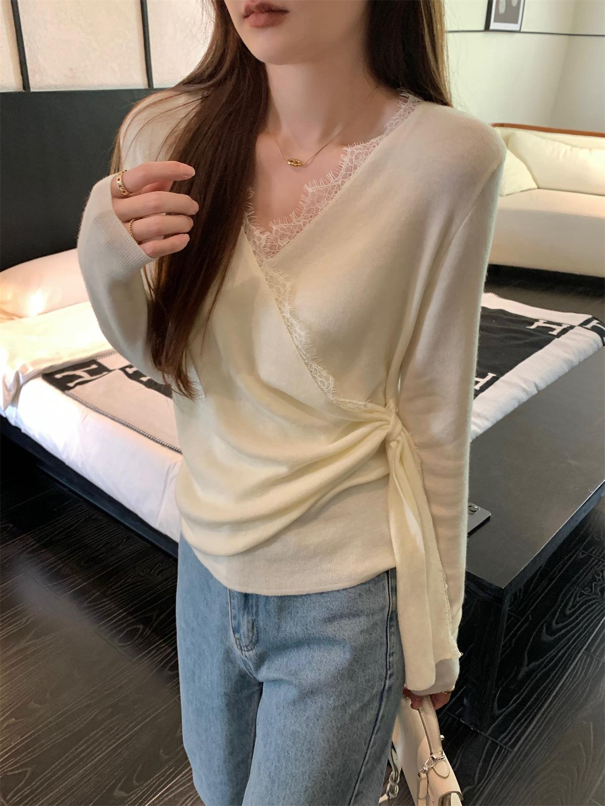 Top de punto de manga larga con diseño de nicho irregular y cintura cruzada con encaje de estilo coreano para otoño e invierno, color gris