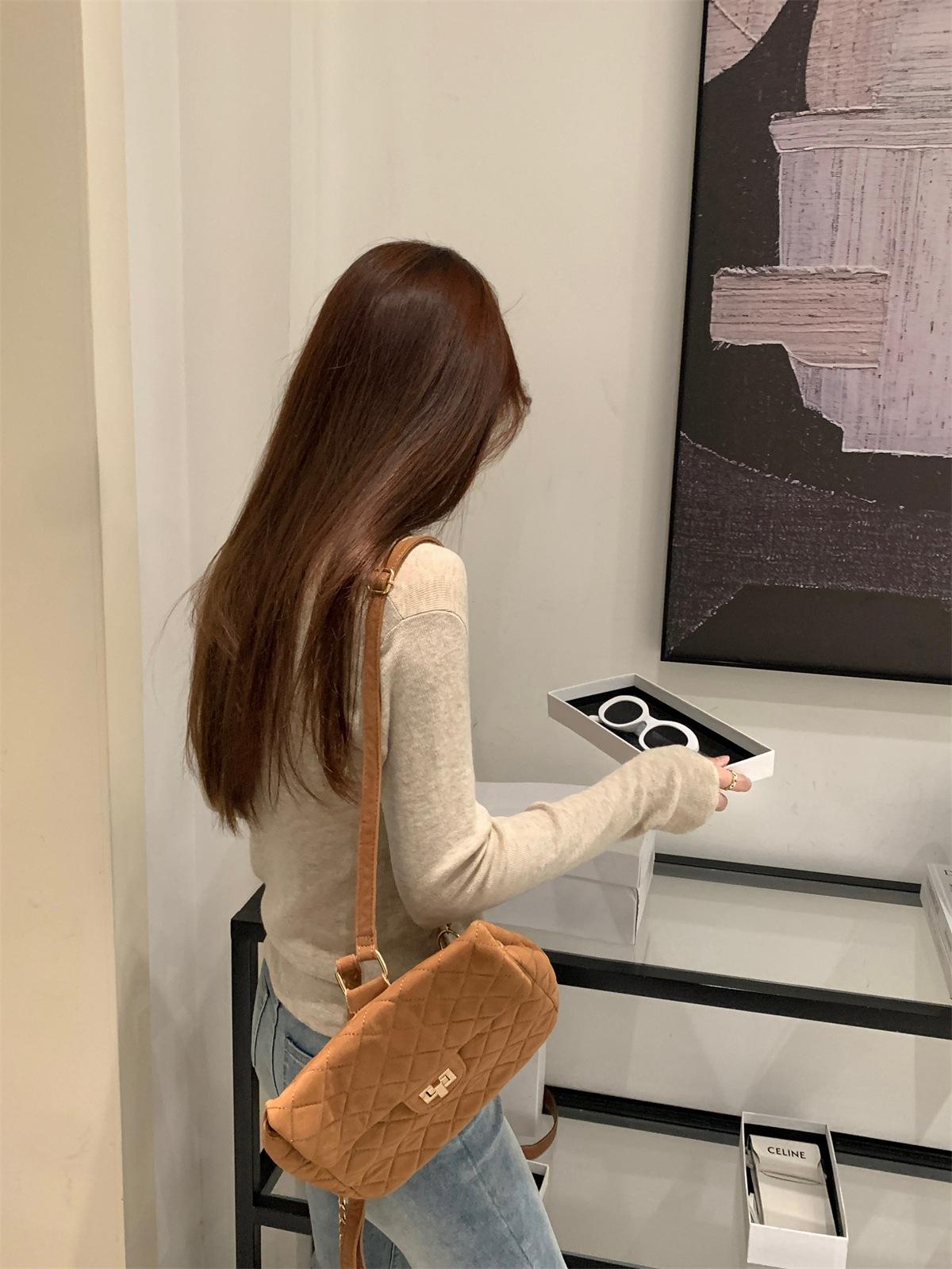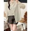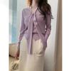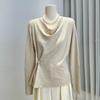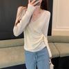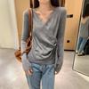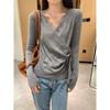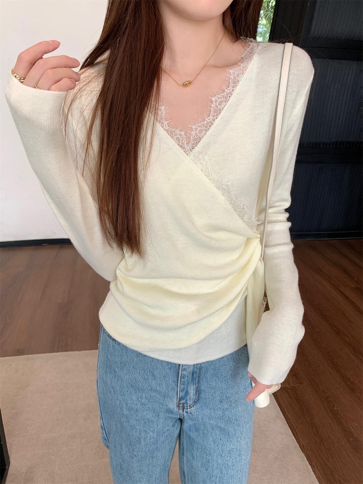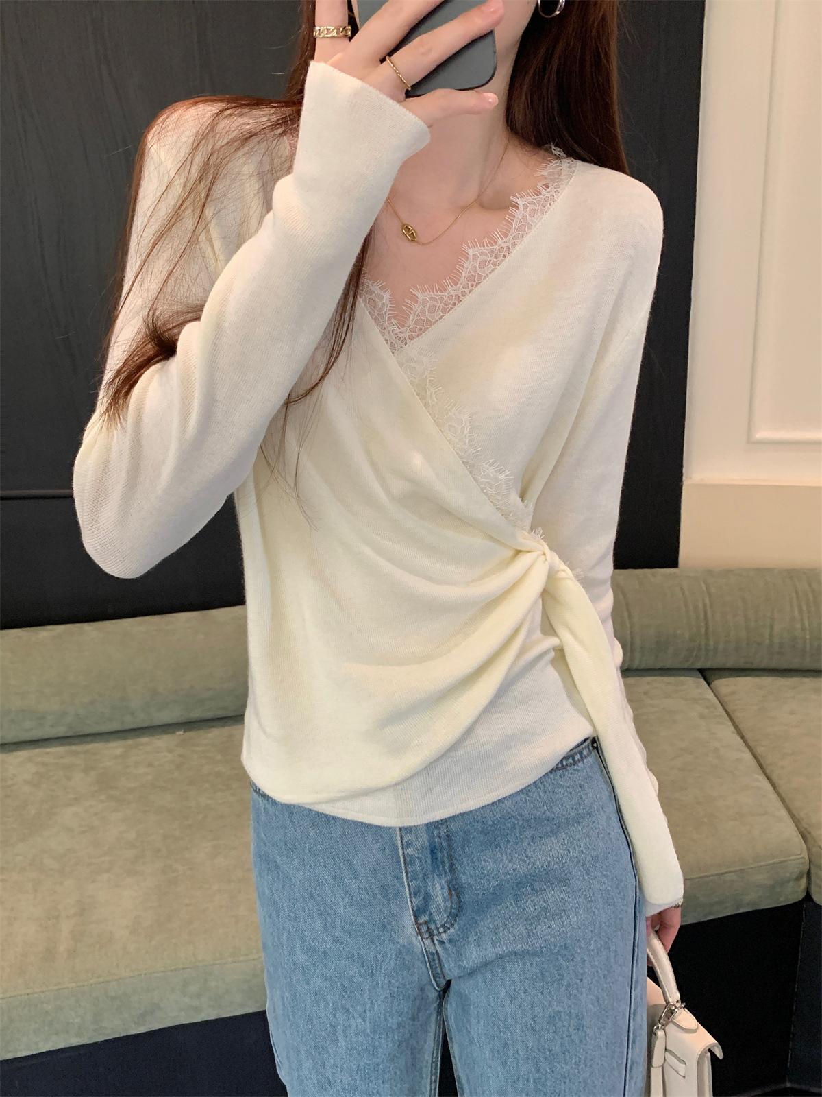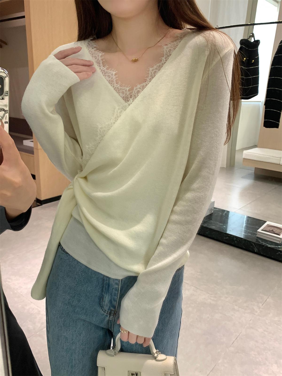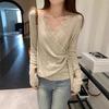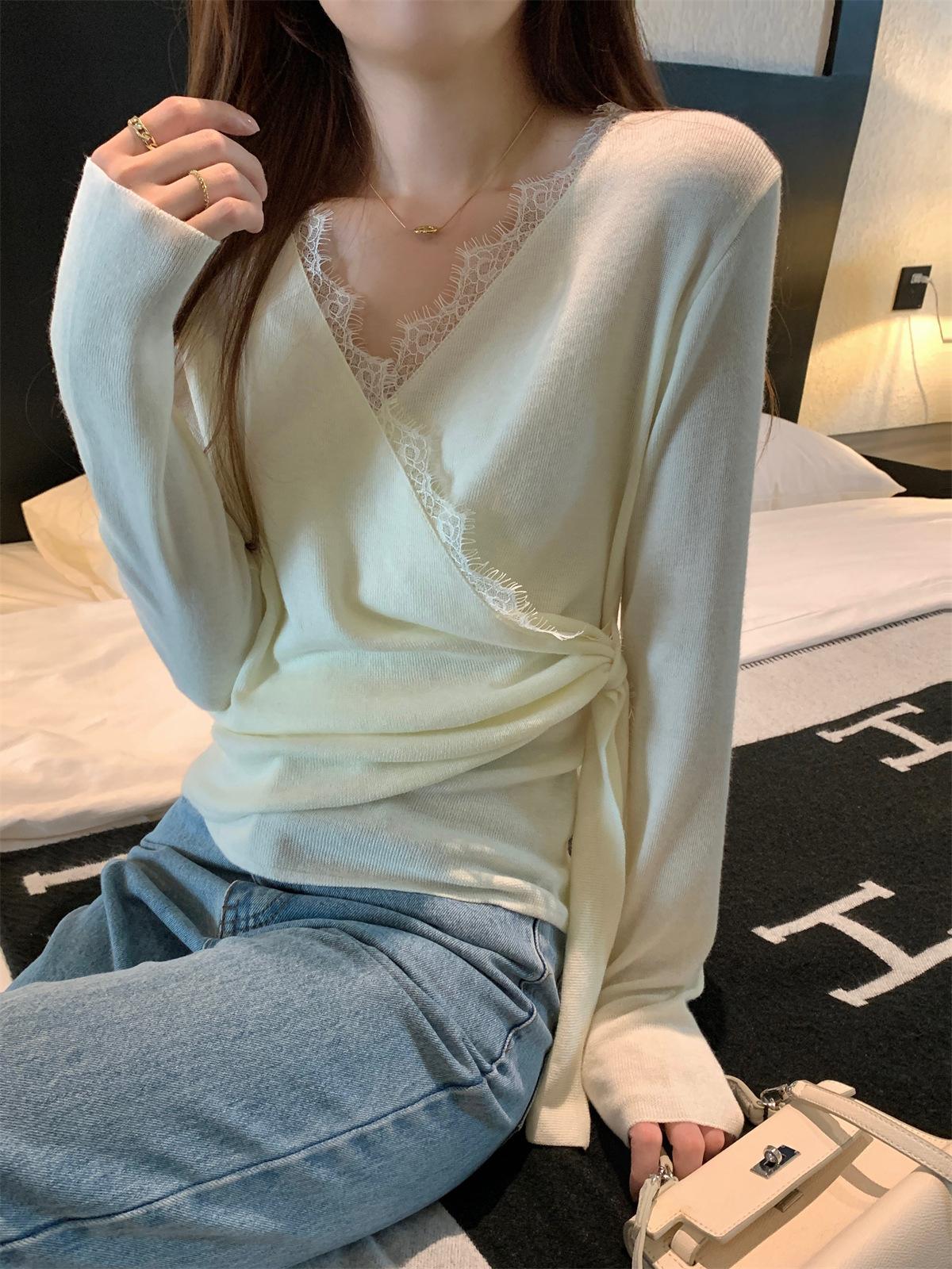 Top de punto de manga larga con diseño de nicho irregular y cintura cruzada con encaje de estilo coreano para otoño e invierno, color gris