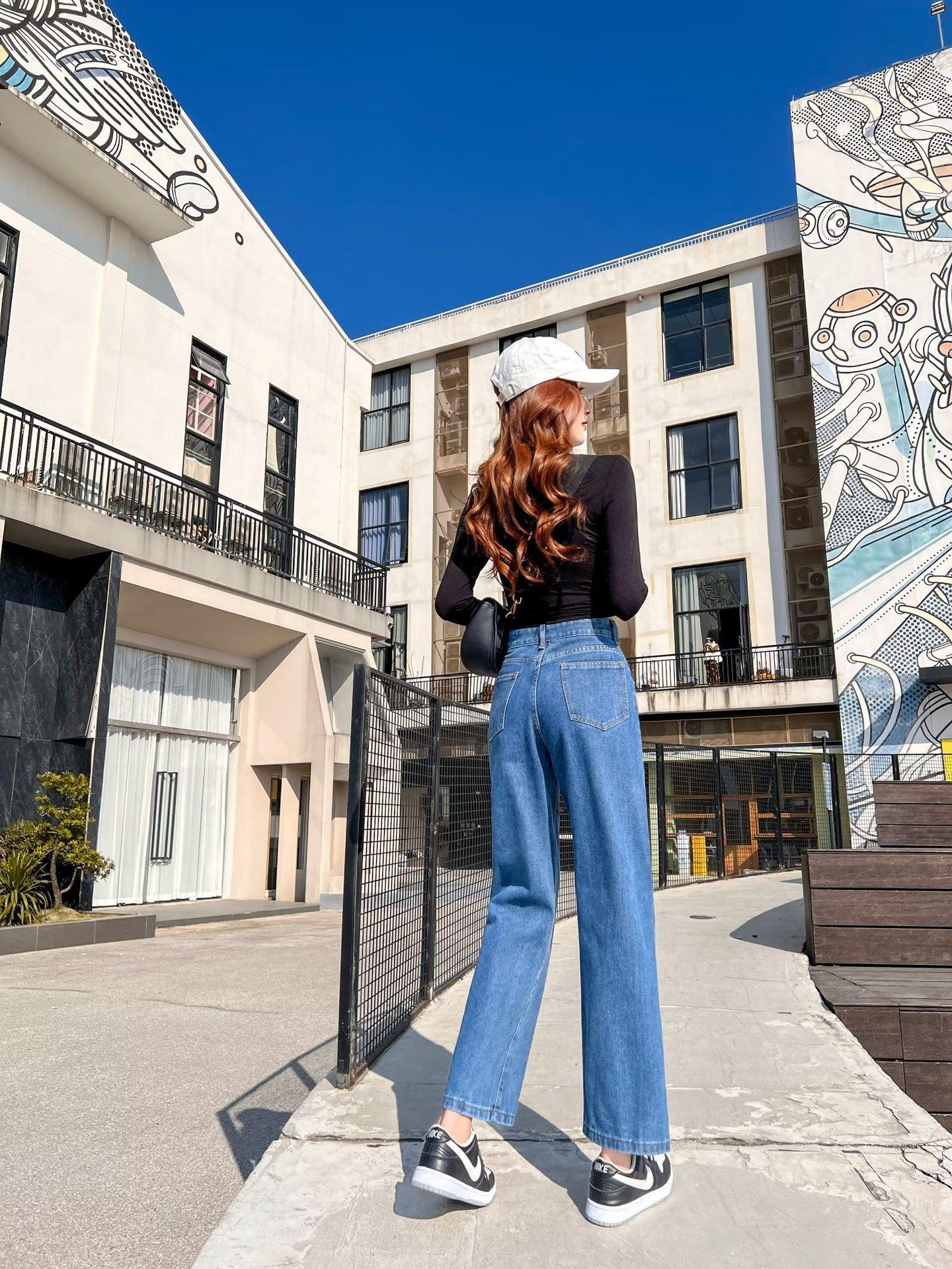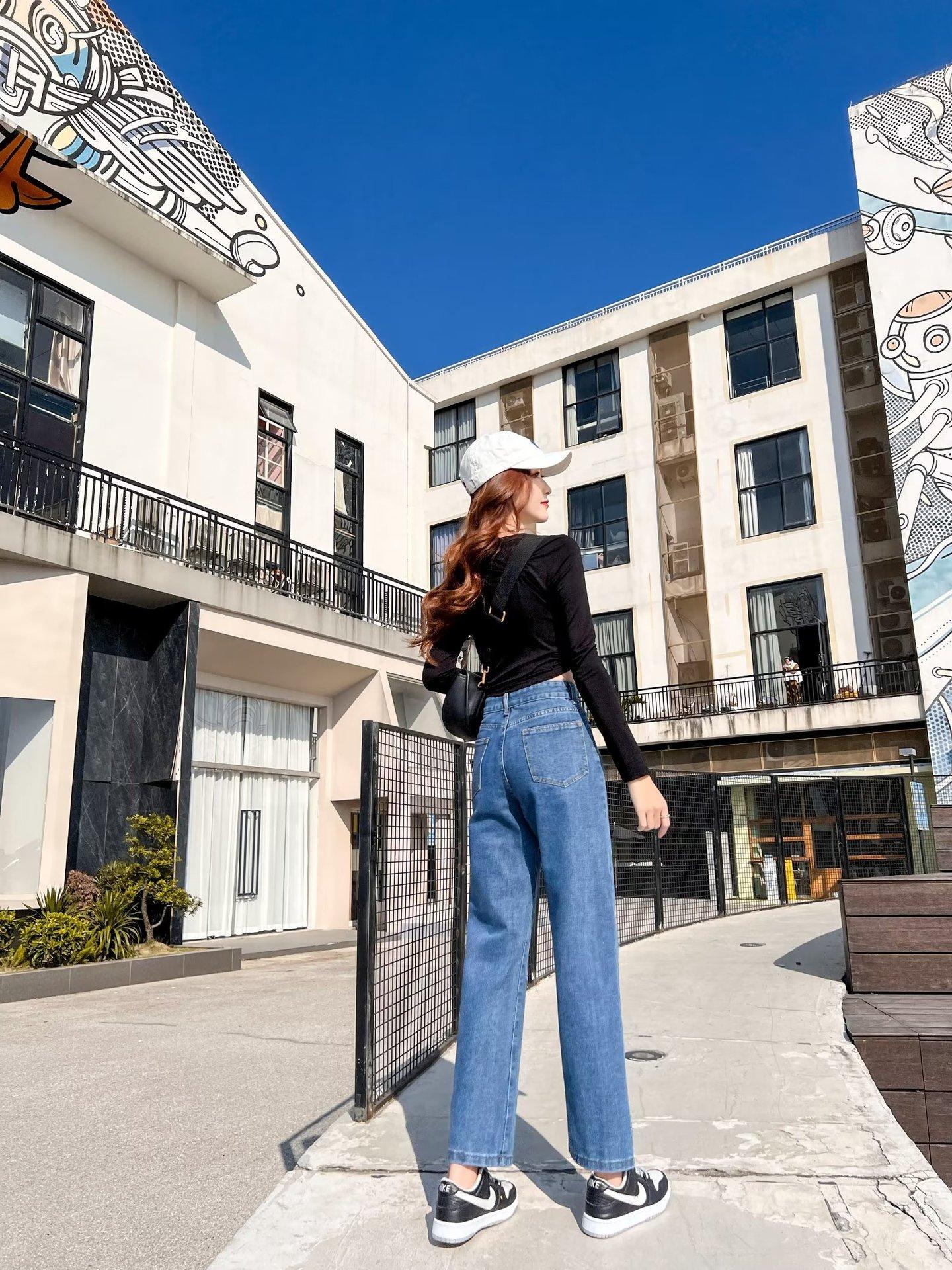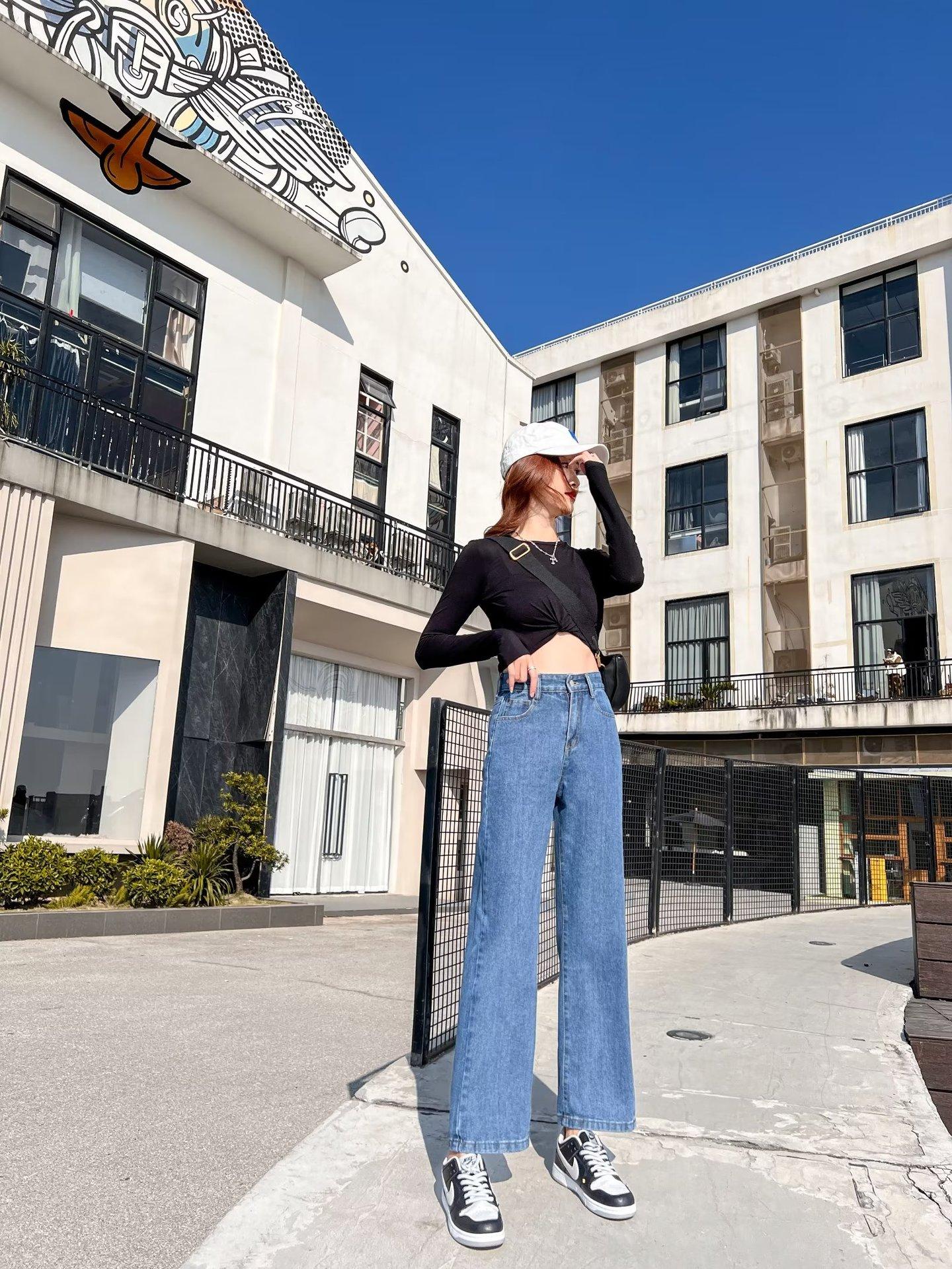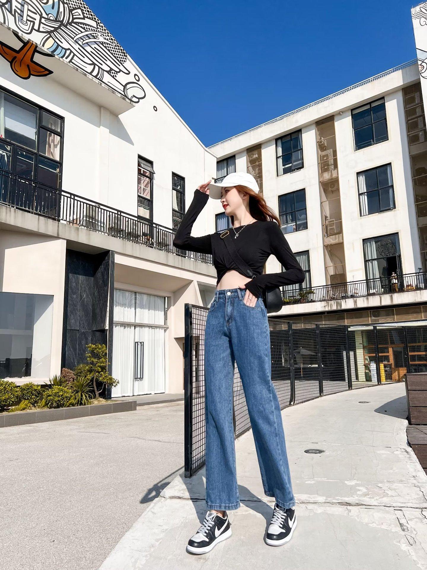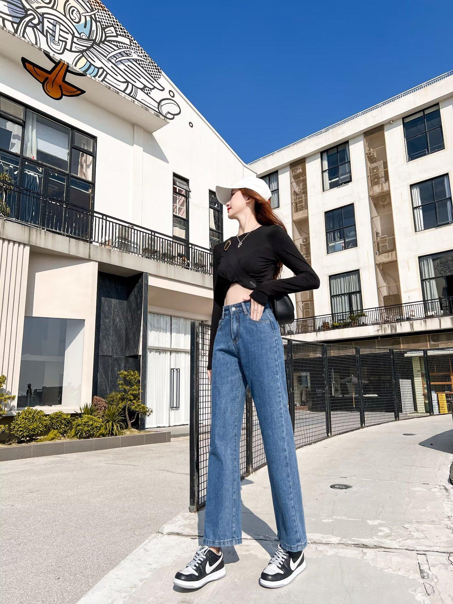 Jeans de pierna ancha para mujer primavera y otoño 2023 nuevo estilo otoño cintura alta slim holgados talla pequeña pantalones rectos de nueve puntos