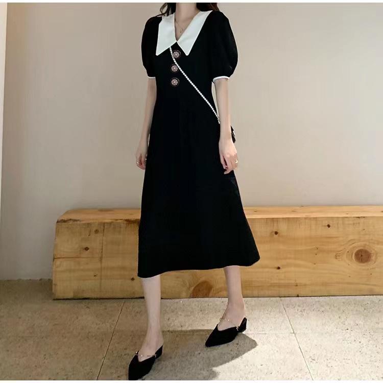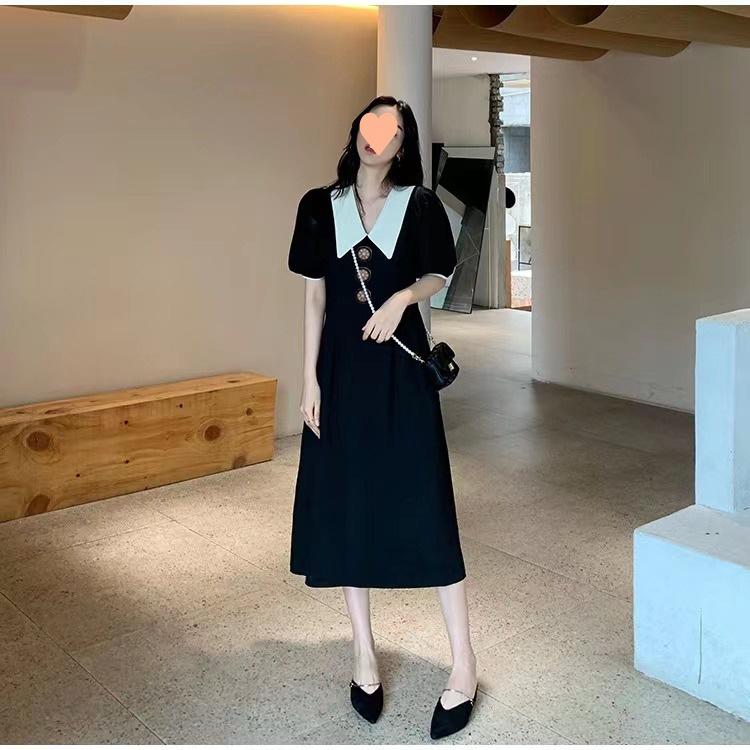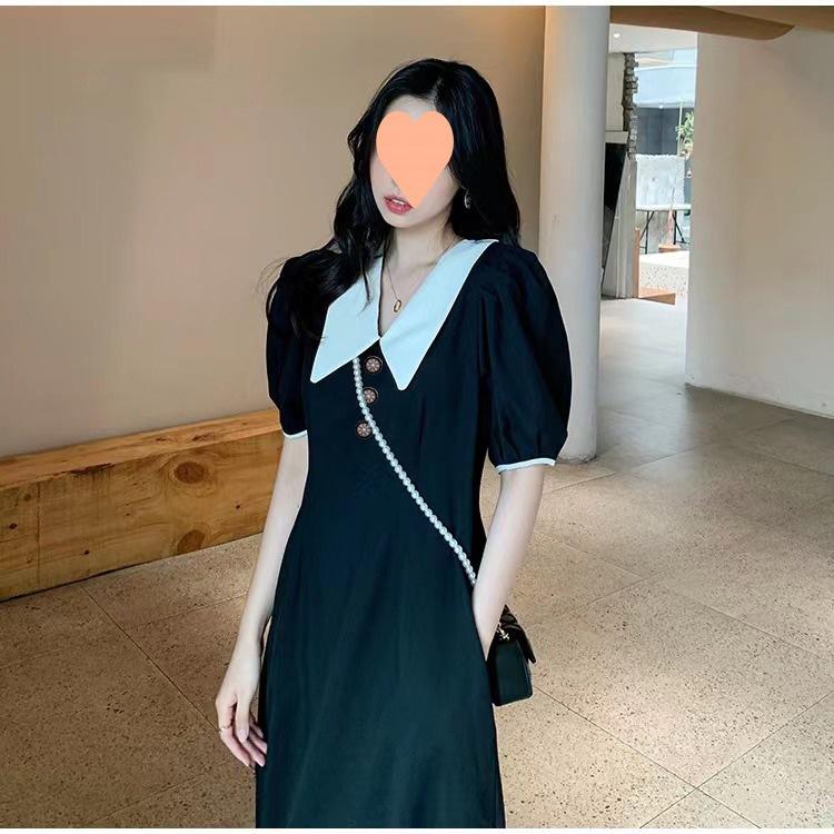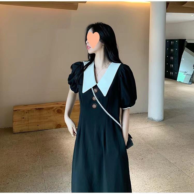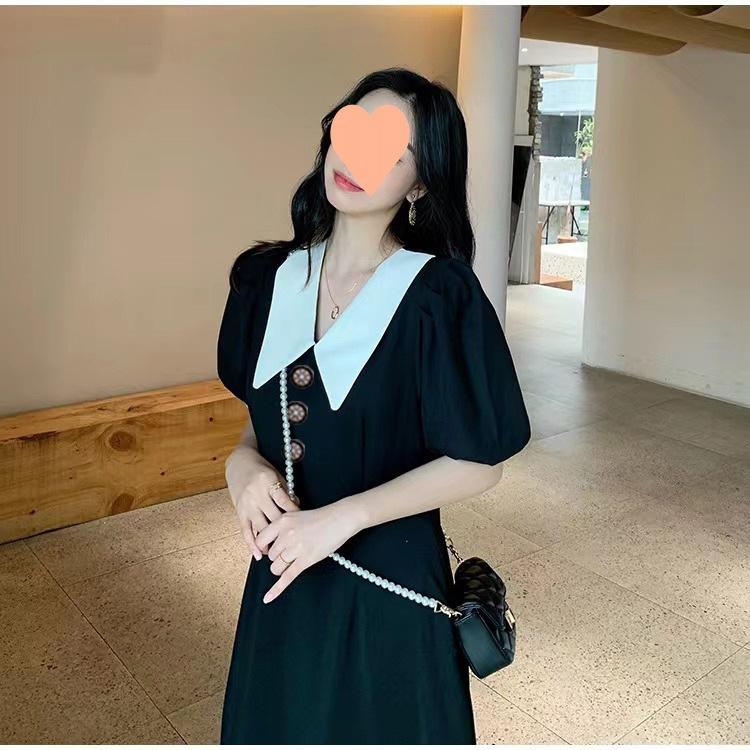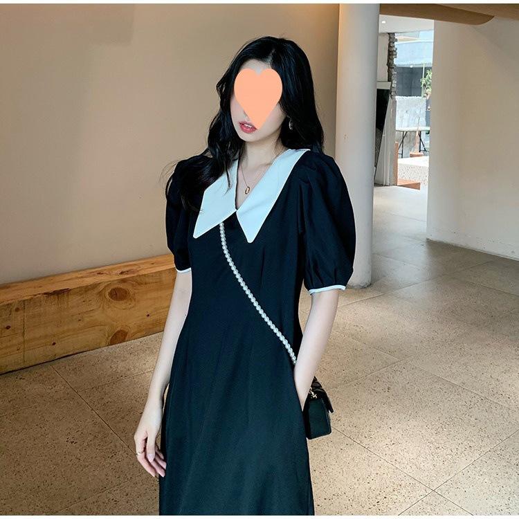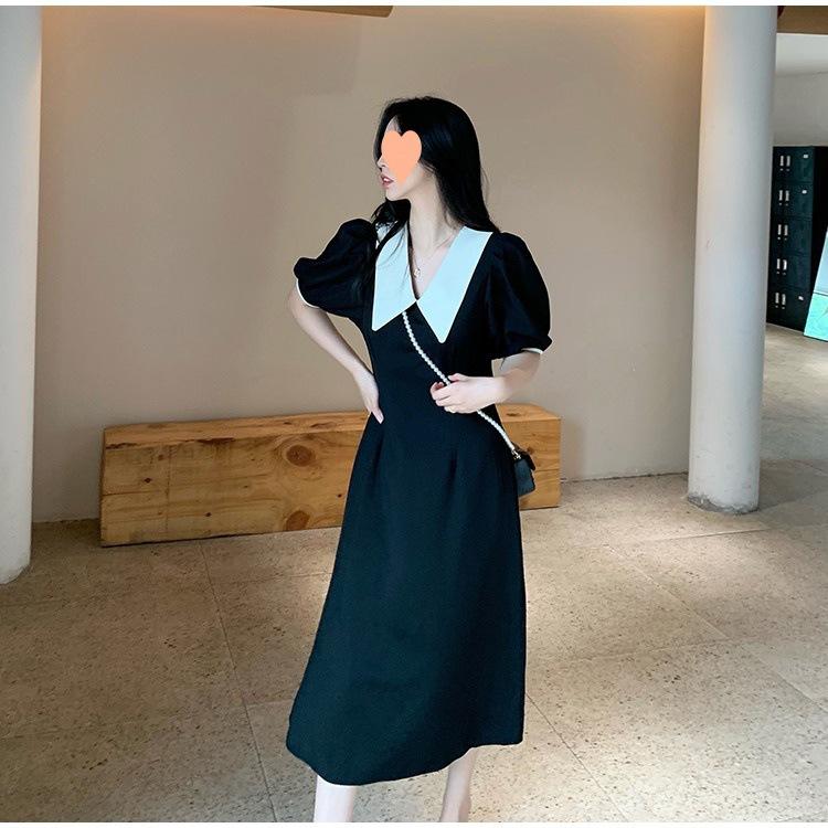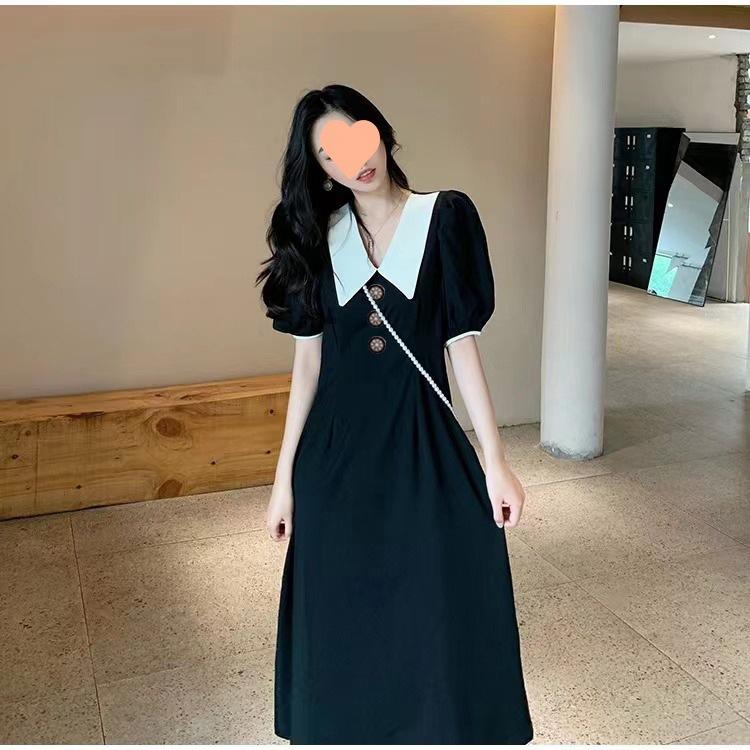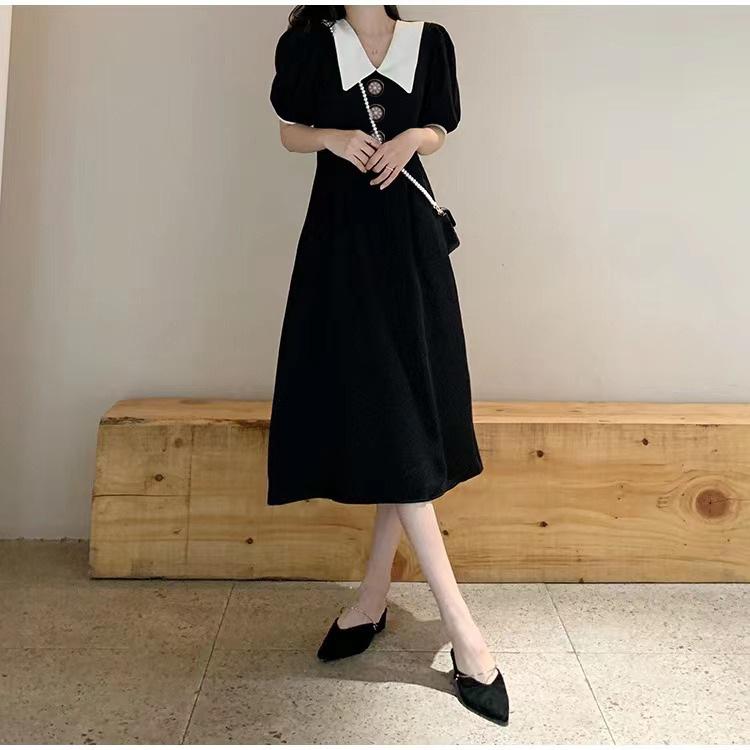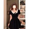 Vestido Estilo Hepburn 2025 de Manga Abullonada para Mujer Verano Estilo Francés Cintura Falda Retro Negro Cuello Muñeca