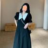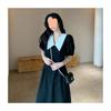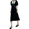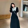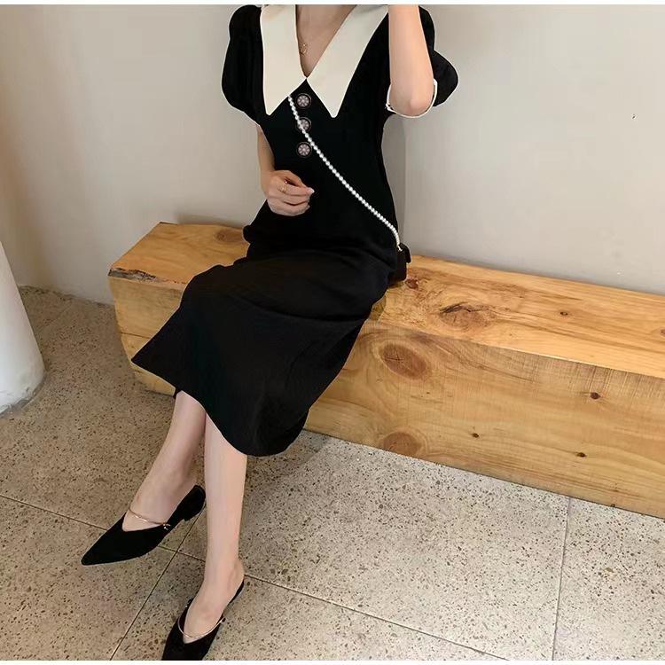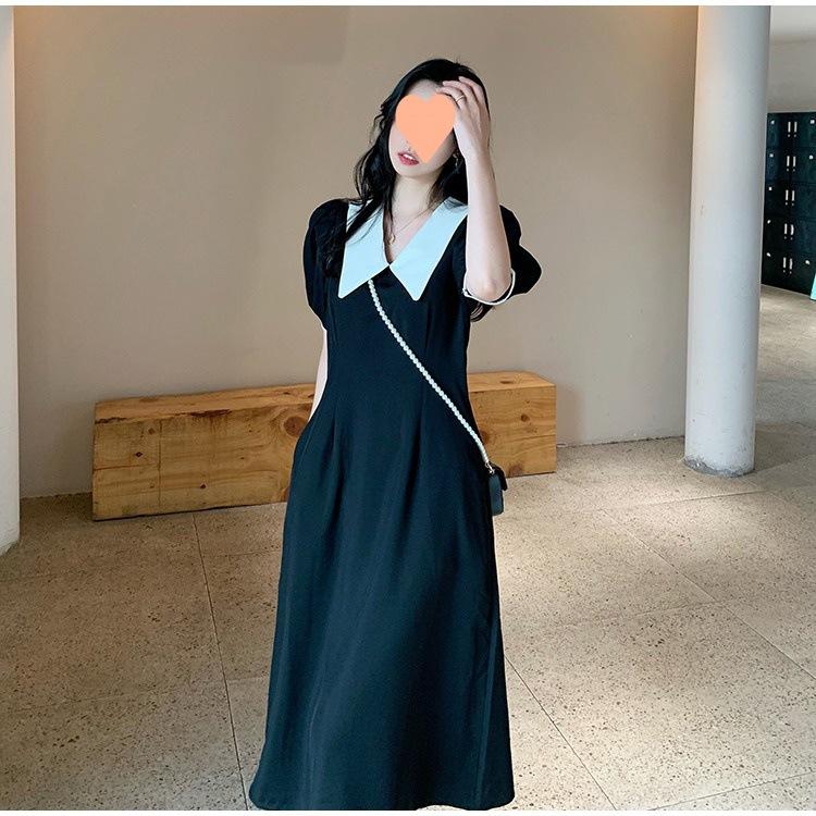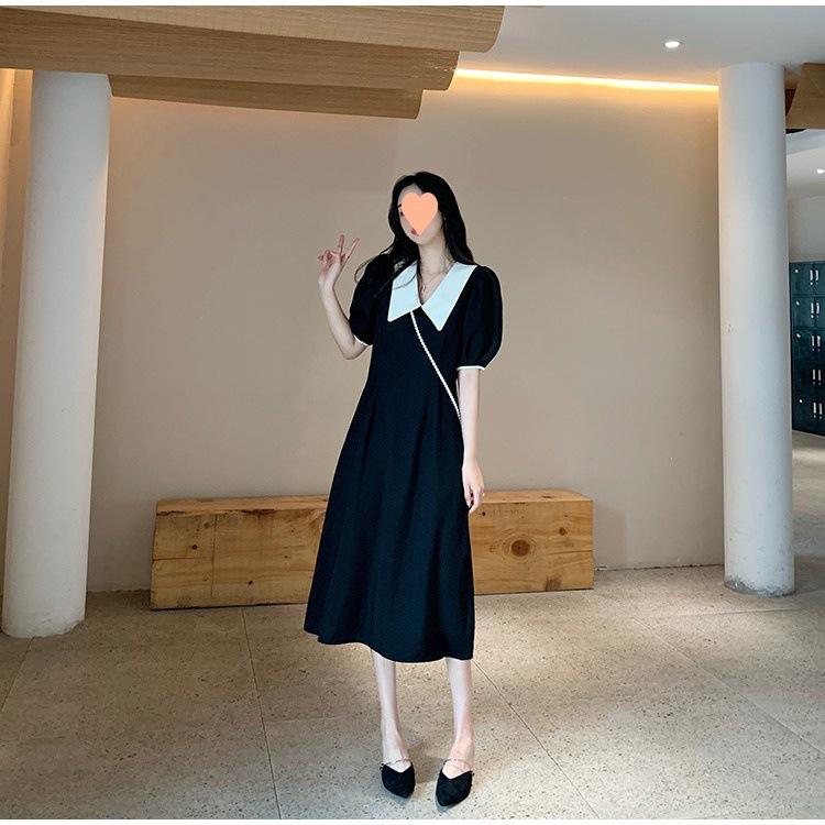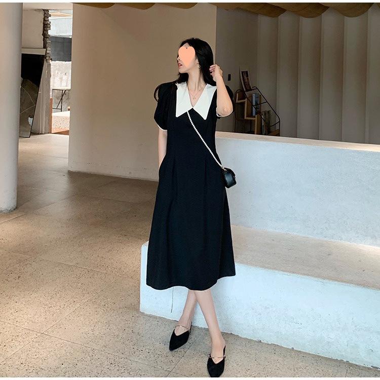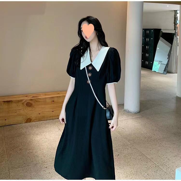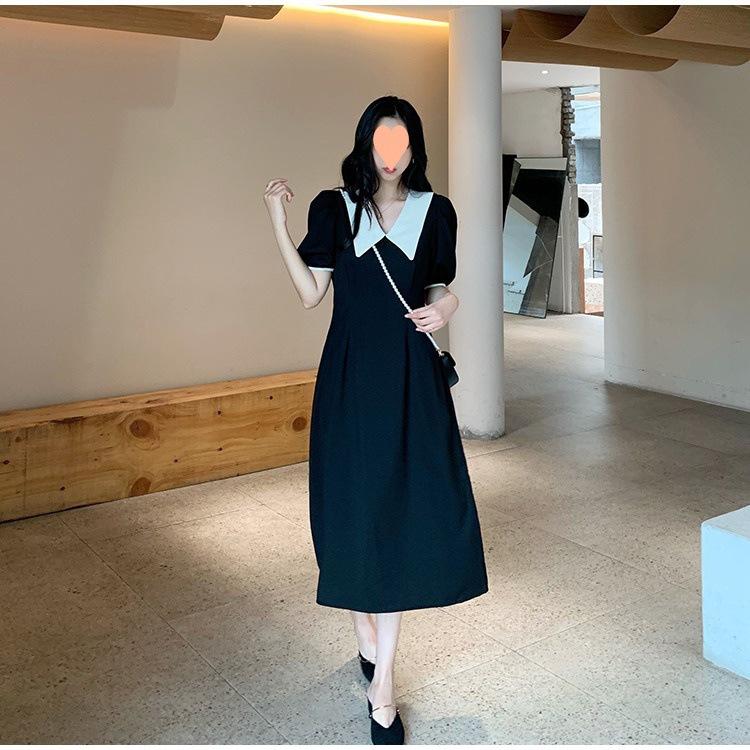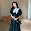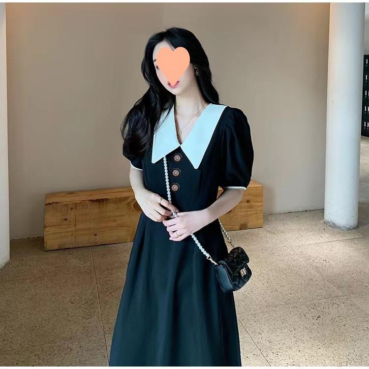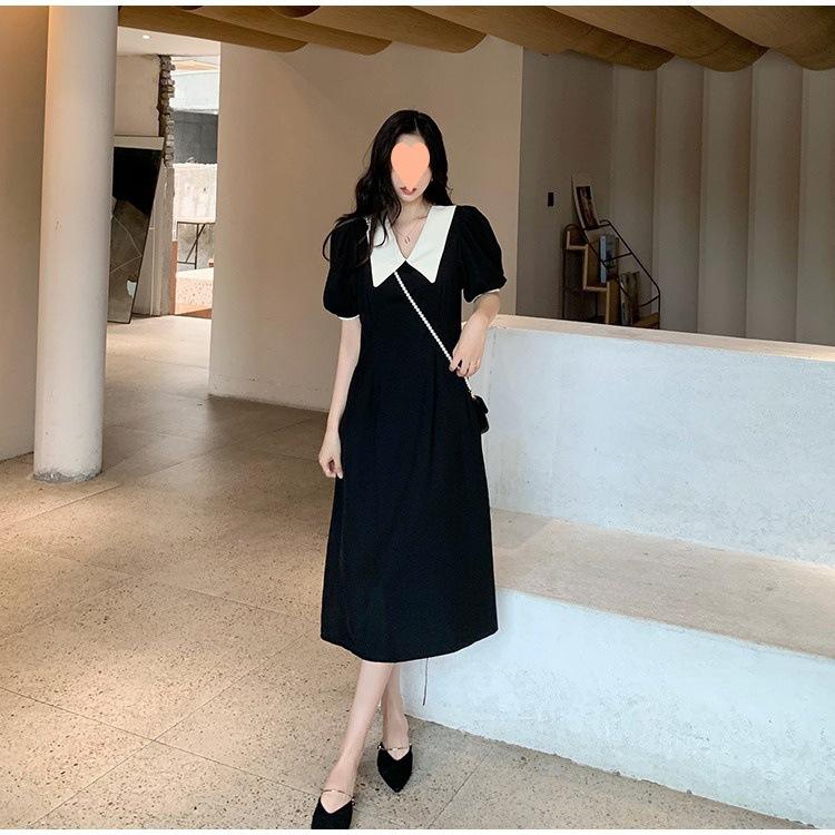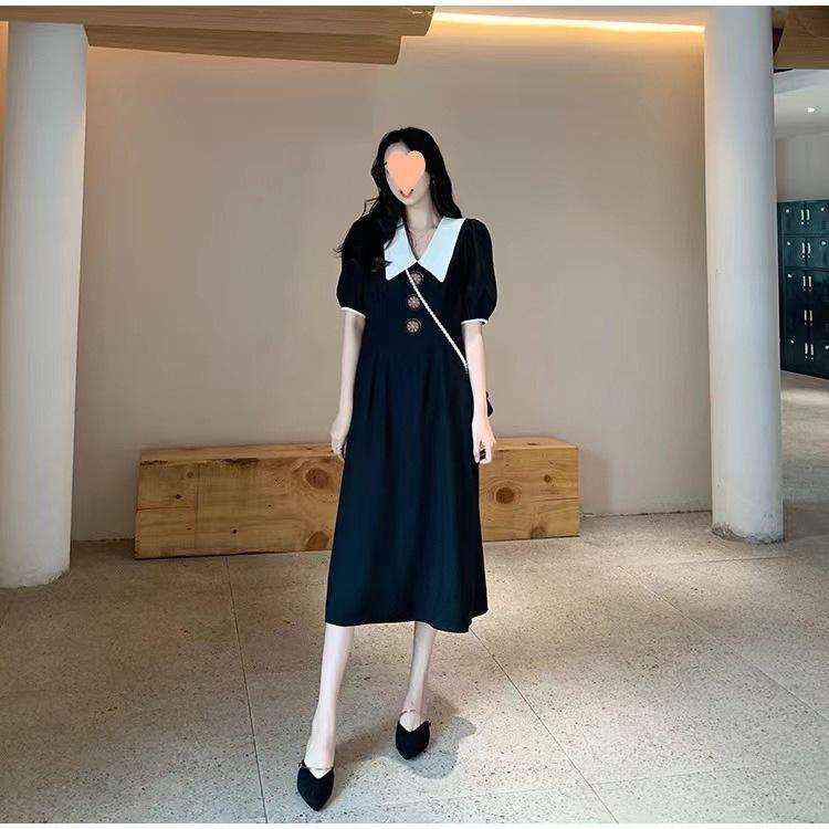 Vestido Estilo Hepburn 2025 de Manga Abullonada para Mujer Verano Estilo Francés Cintura Falda Retro Negro Cuello Muñeca