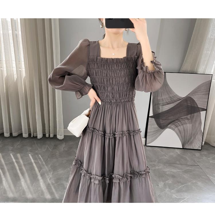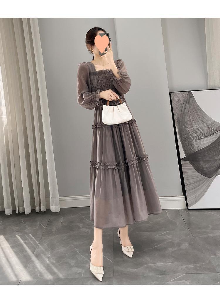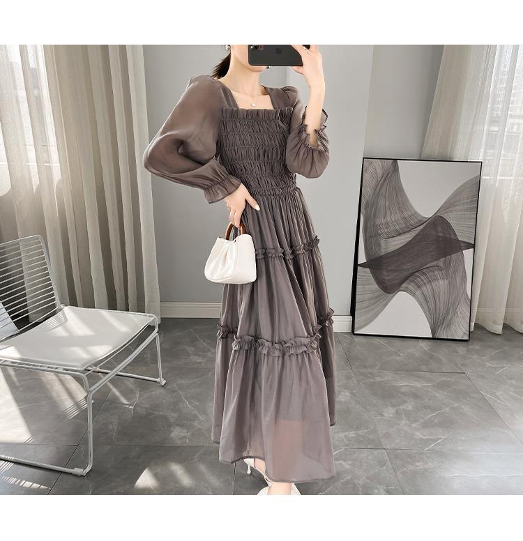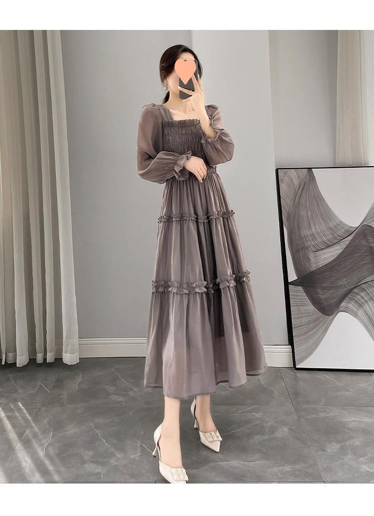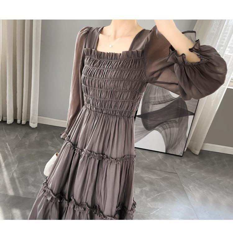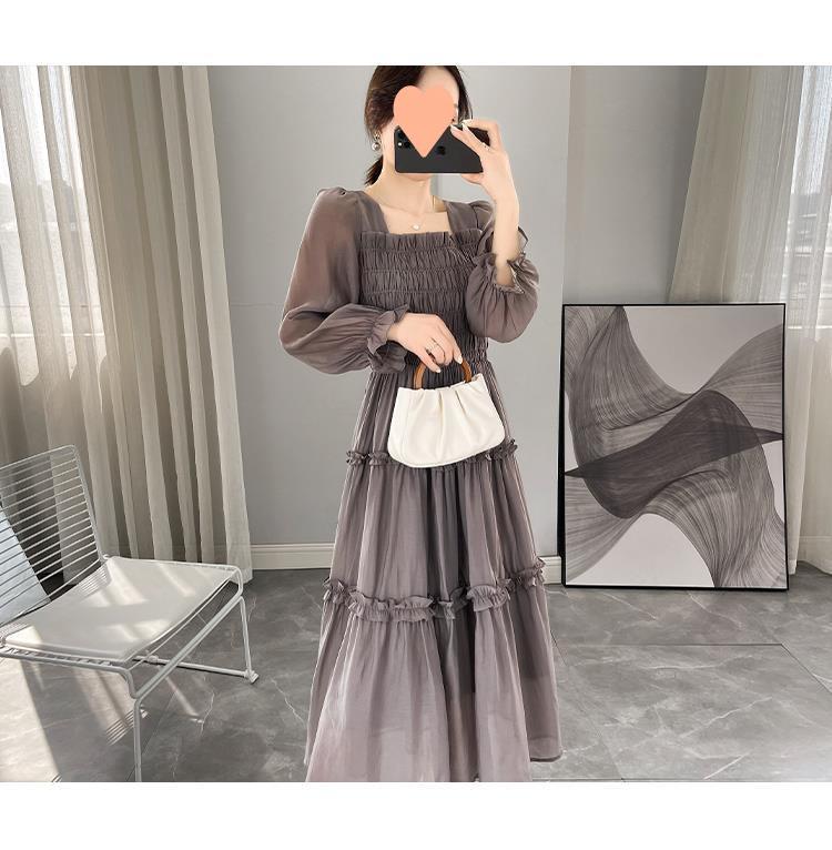 Vestido de cuello cuadrado de manga larga gris humo estilo francés para primavera y otoño, nuevo diseño de falda de línea A que adelgaza la cintura, falda larga estilo hada con sensación de primavera y otoño.