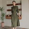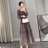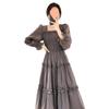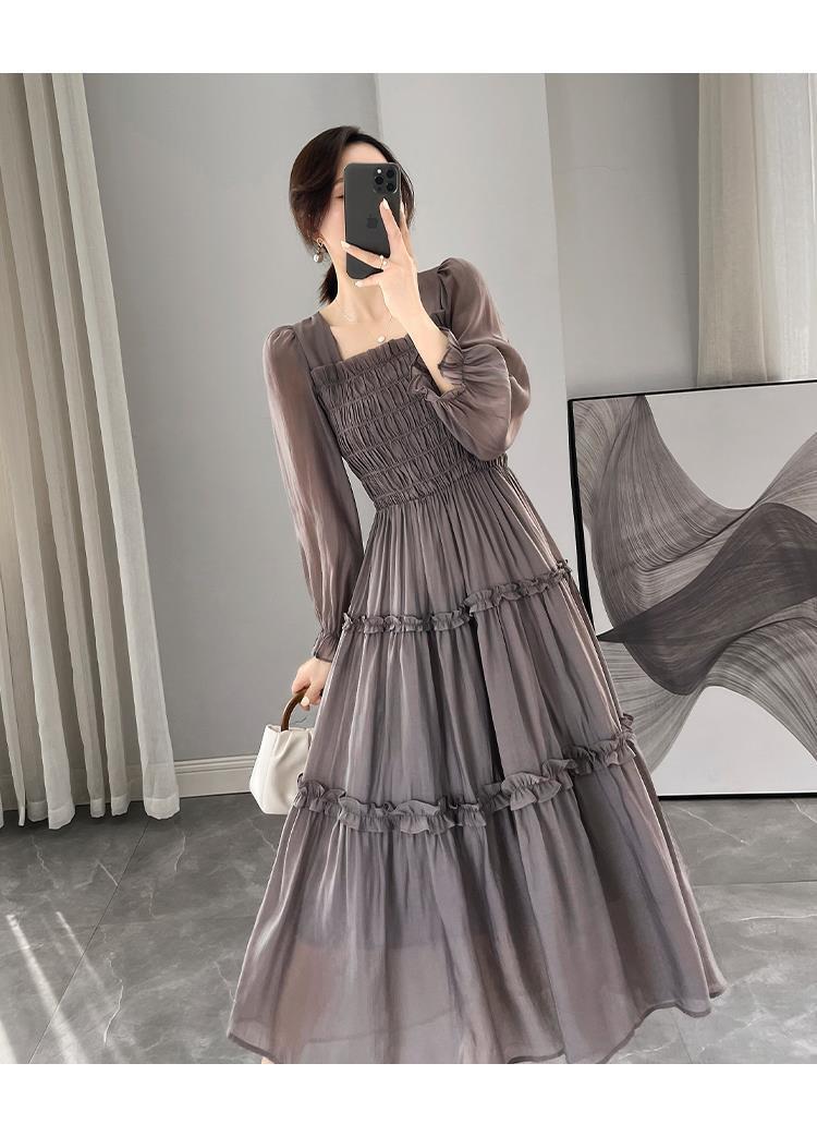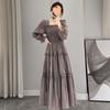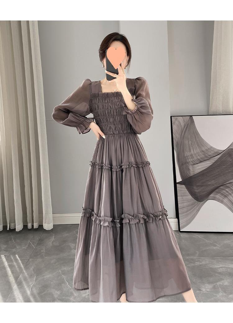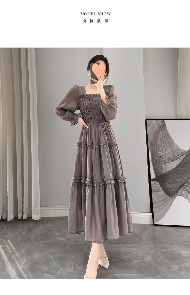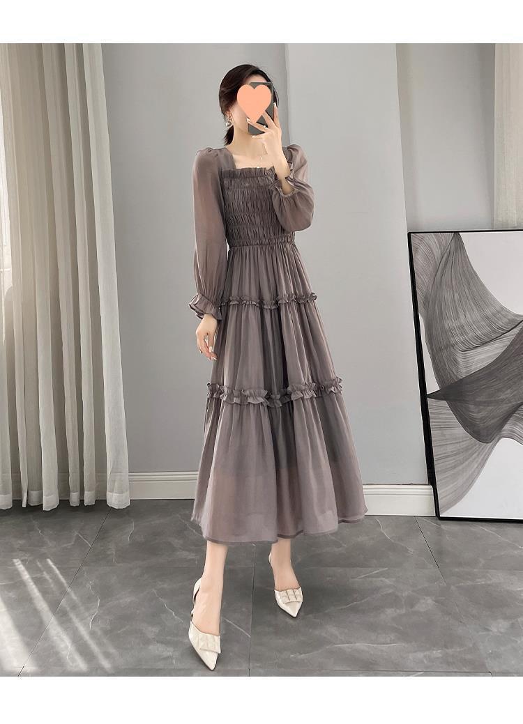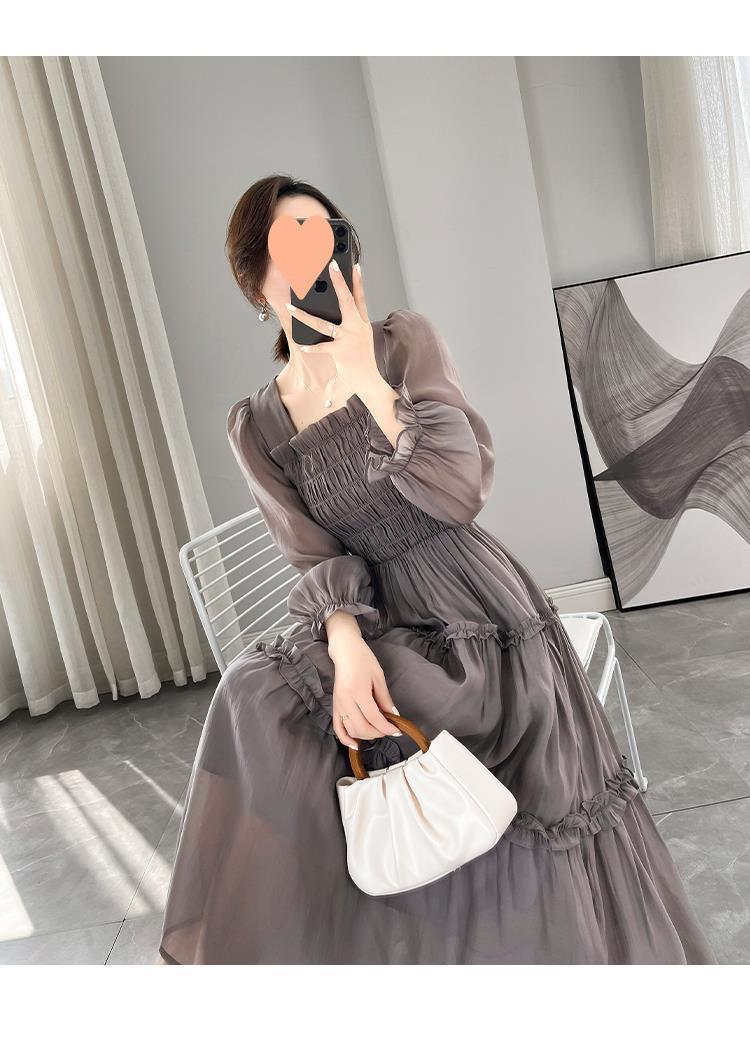 Vestido de cuello cuadrado de manga larga gris humo estilo francés para primavera y otoño, nuevo diseño de falda de línea A que adelgaza la cintura, falda larga estilo hada con sensación de primavera y otoño.