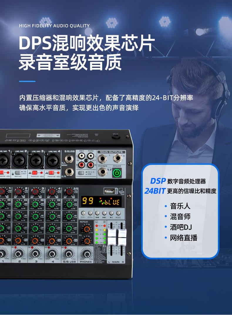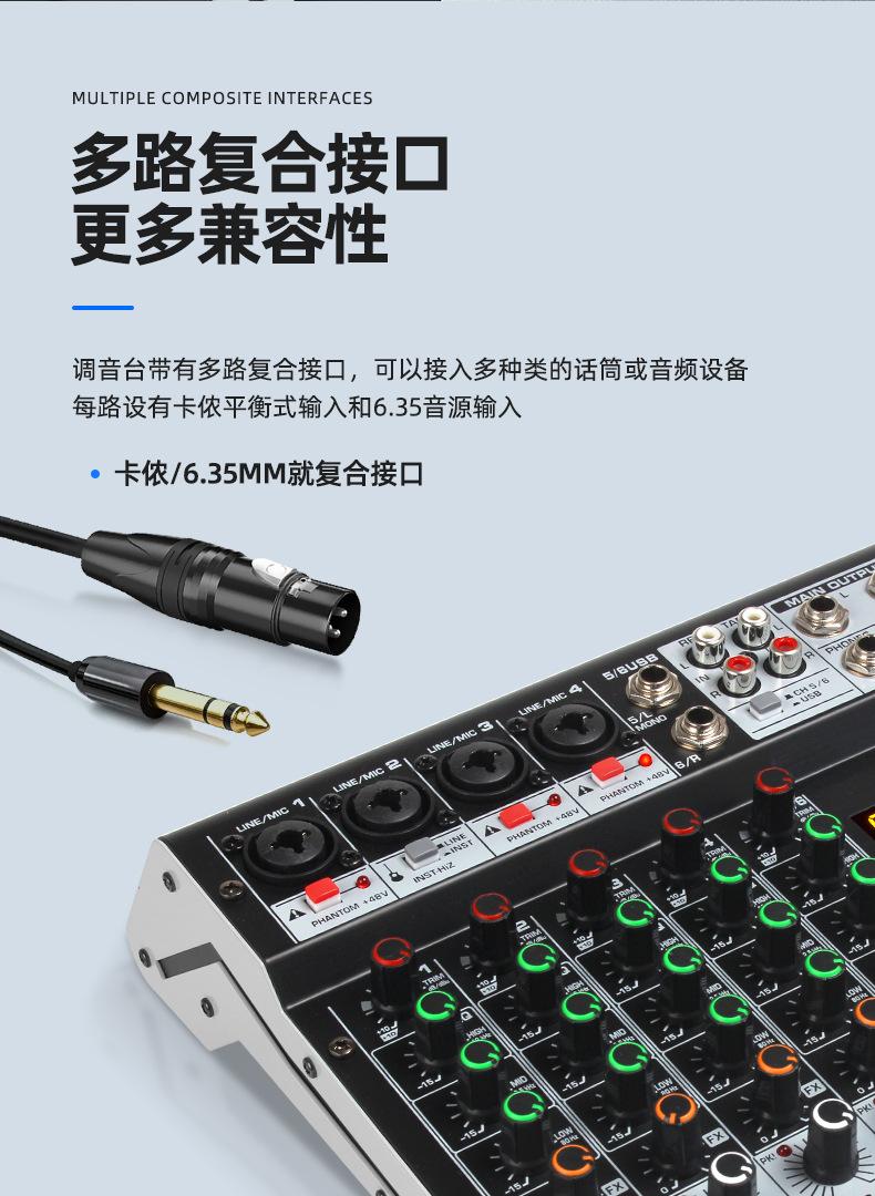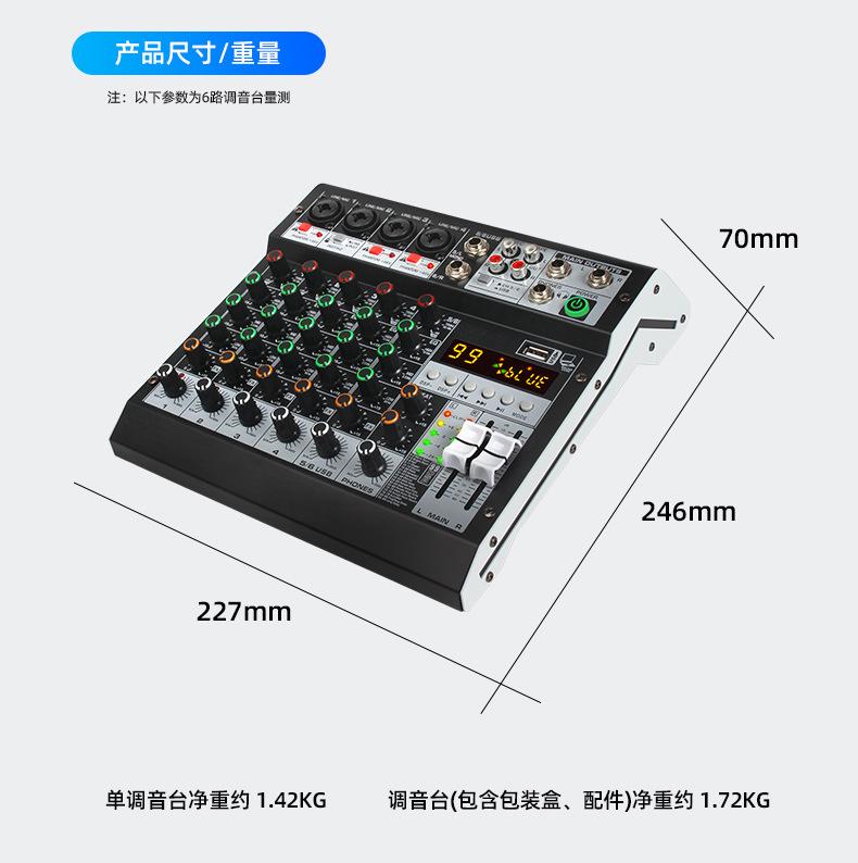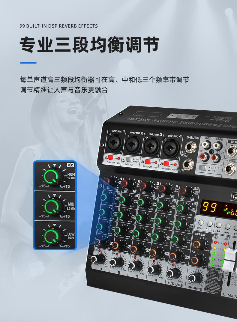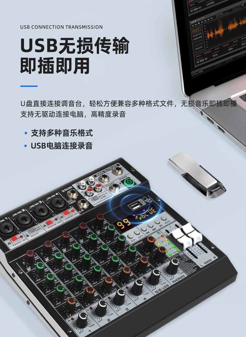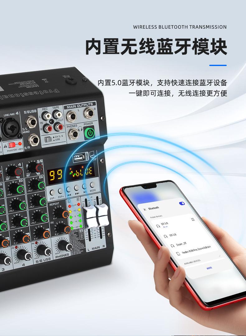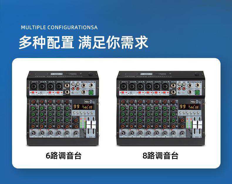 Mezclador de 6 vías para ordenador, grabador, teléfono móvil, tarjeta de sonido, escenario en vivo, Bluetooth, USB, mezclador de DJ de 8 vías