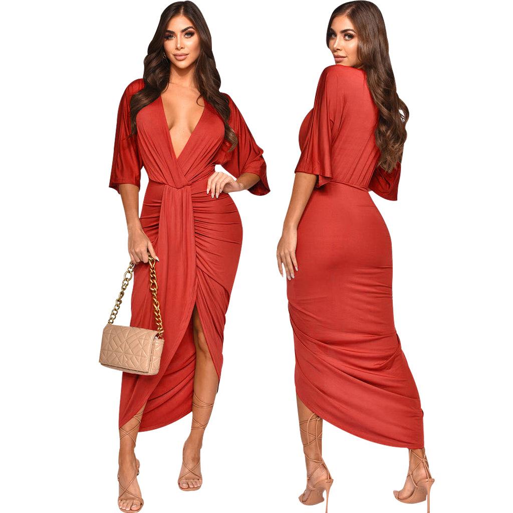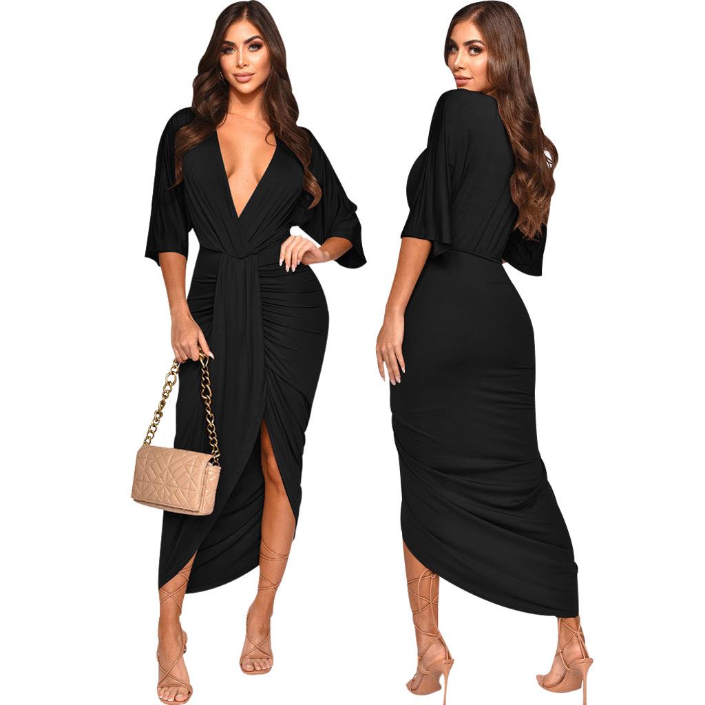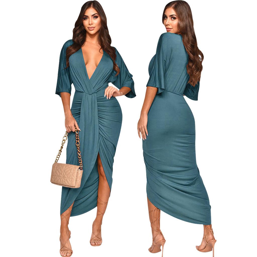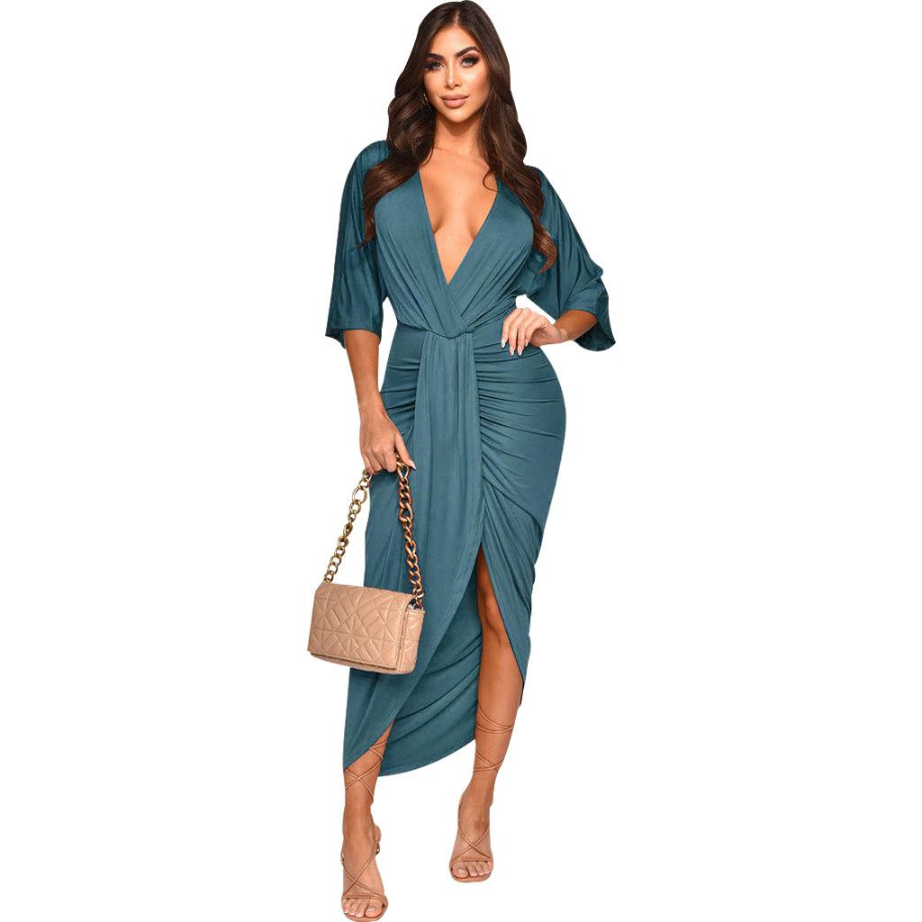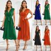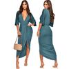 Vestido de verano 2023 de manga larga con cuello en V y cordones, ajustado, plisado, de longitud media, de comercio exterior de Amazon.