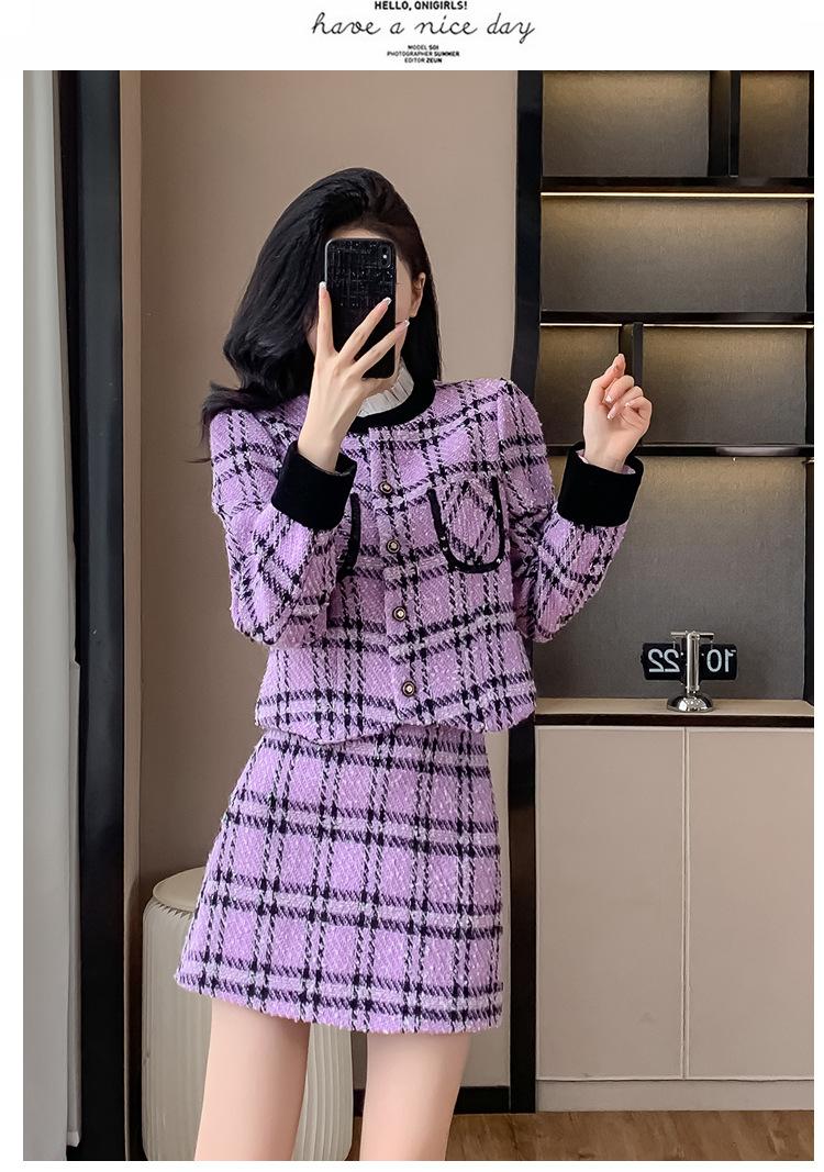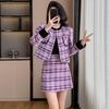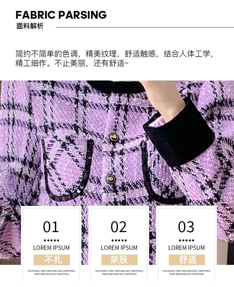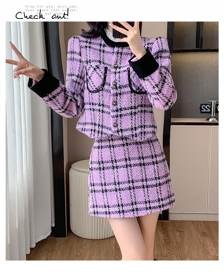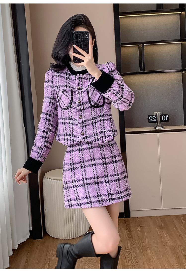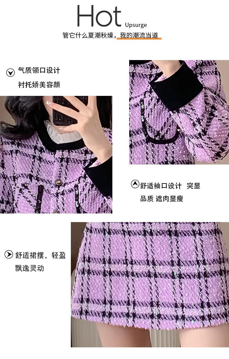 2025 otoño e invierno nuevo abrigo de estilo pequeño para mujer pata de gallo con lentejuelas cuello redondo abrigo con falda traje de dos piezas