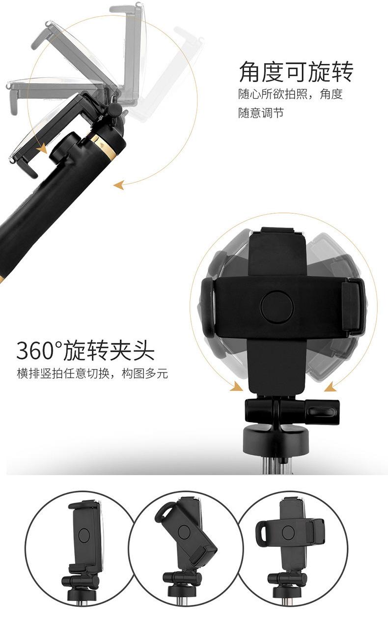 Control remoto Bluetooth, diseño de trípode integrado, clip giratorio para teléfono móvil, se puede usar para cambiar el palo para selfies para tomas horizontales y verticales