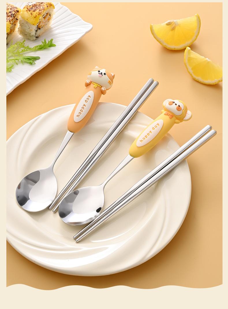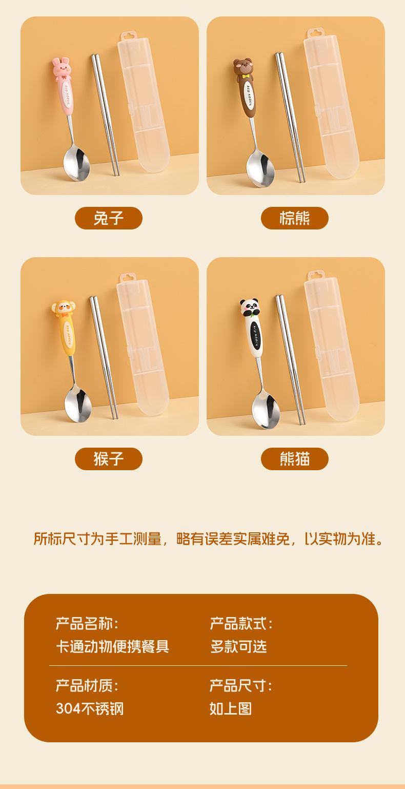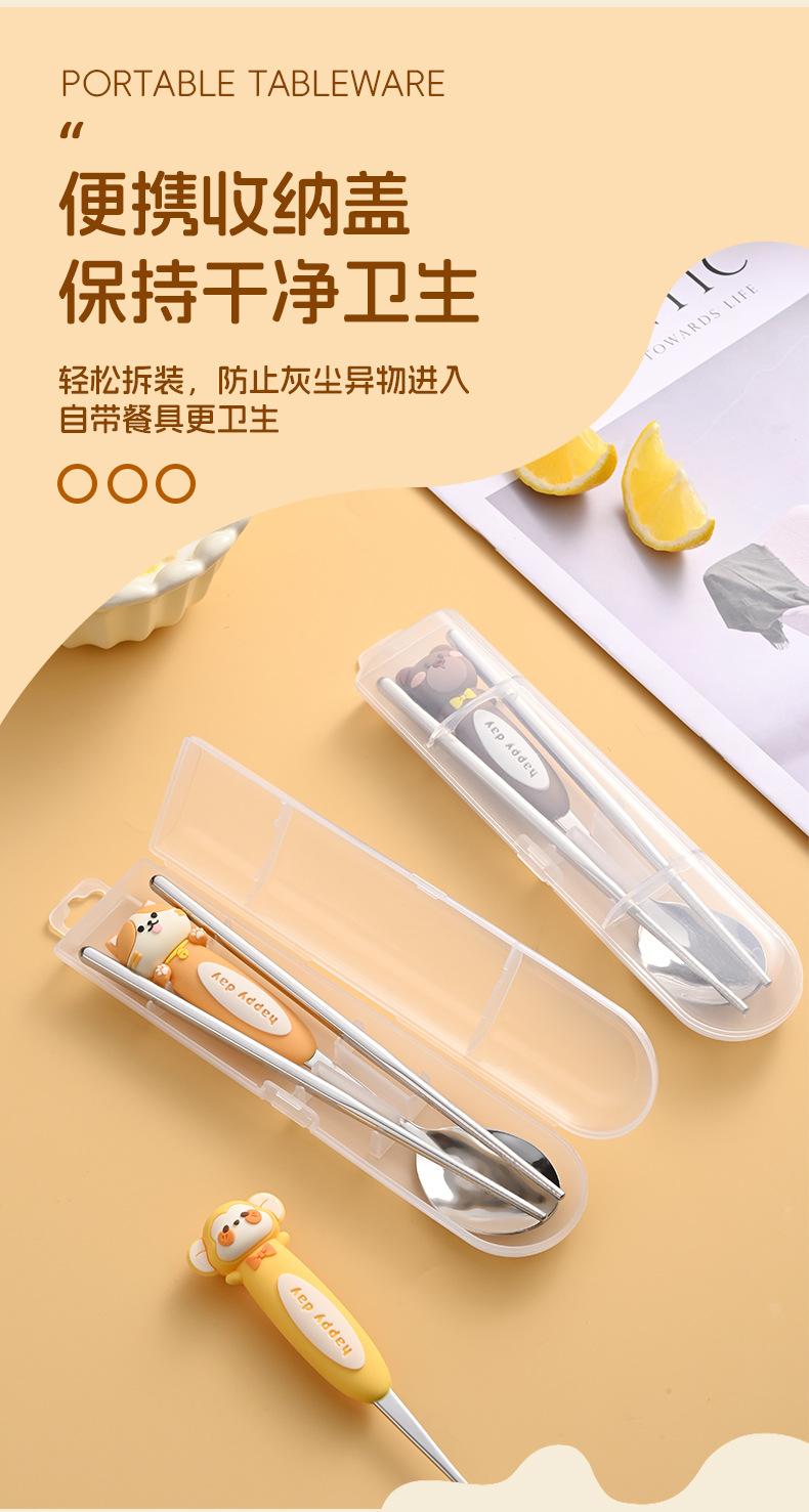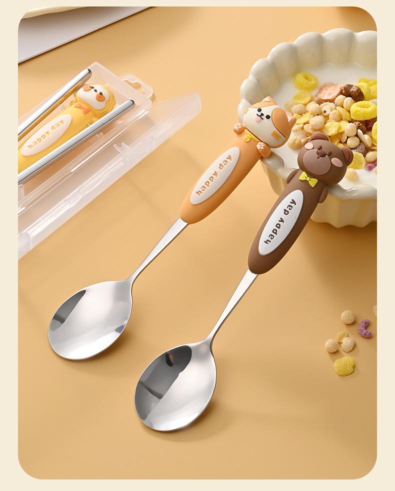 Juego de cubiertos portátiles de acero inoxidable 304 de dibujos animados, grado alimenticio, animal lindo, estudiante, niños, cuchara, palillos, juego