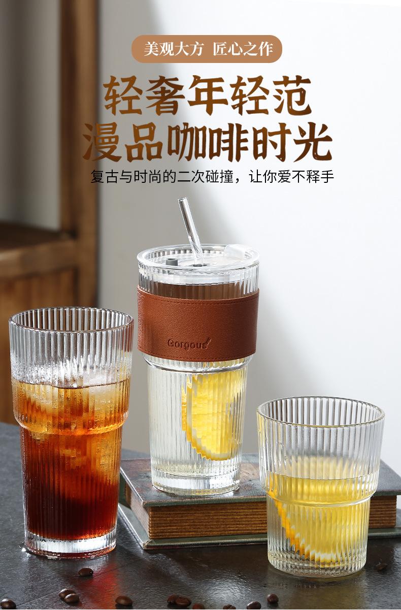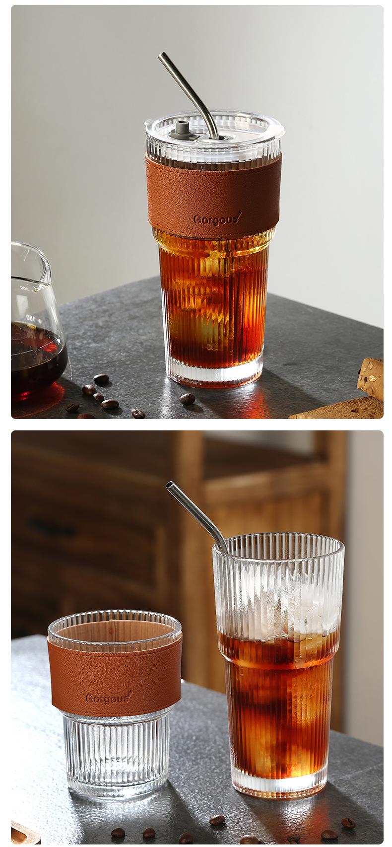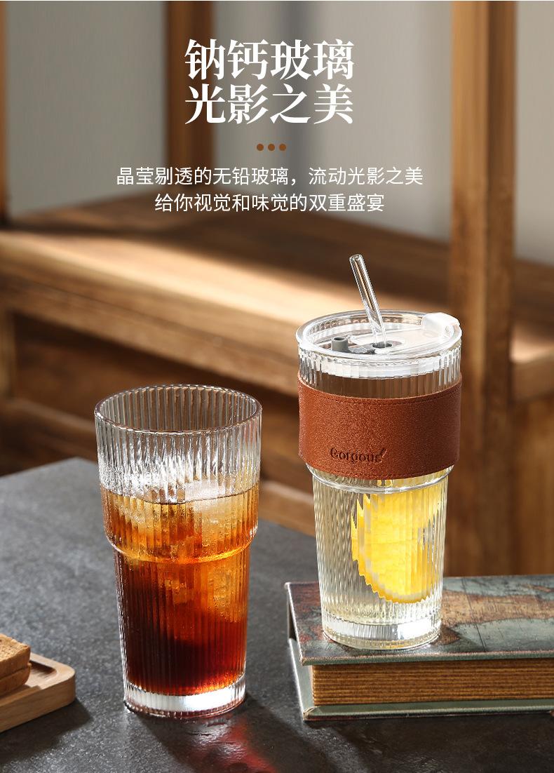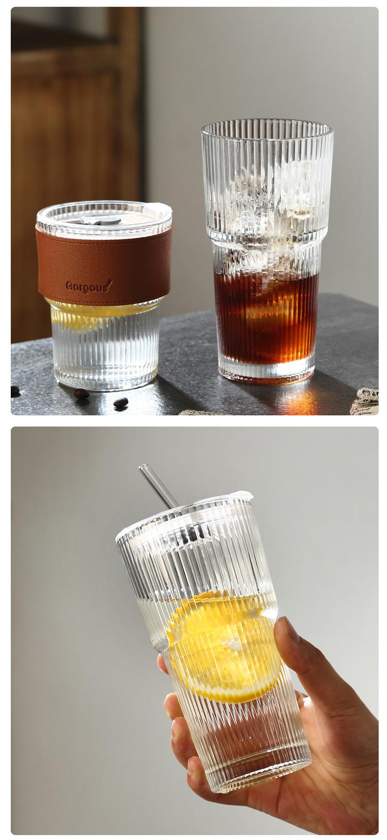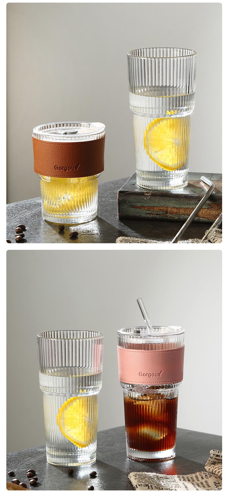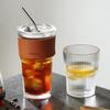 Taza con tubo de succión estilo celebridad de Internet, de rayas verticales, de vidrio, de alto valor de color, con tapa, para café americano con leche y hielo.