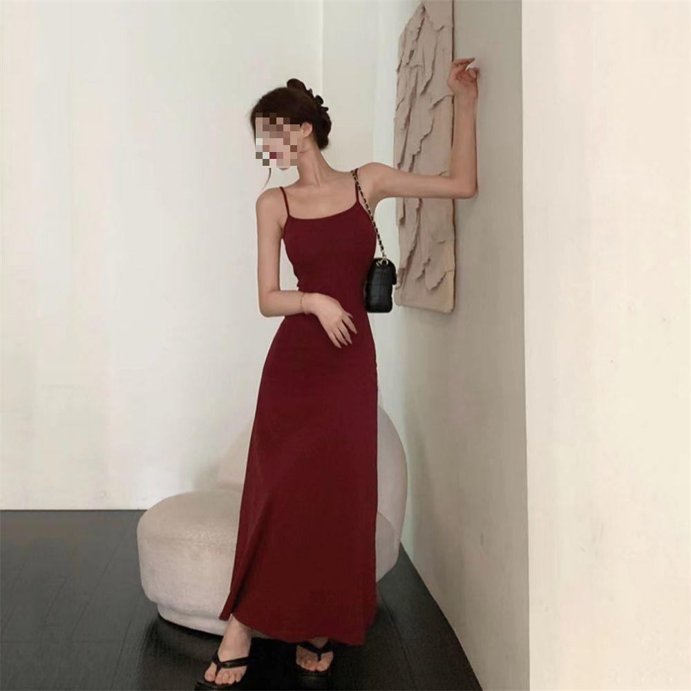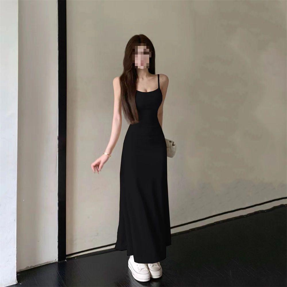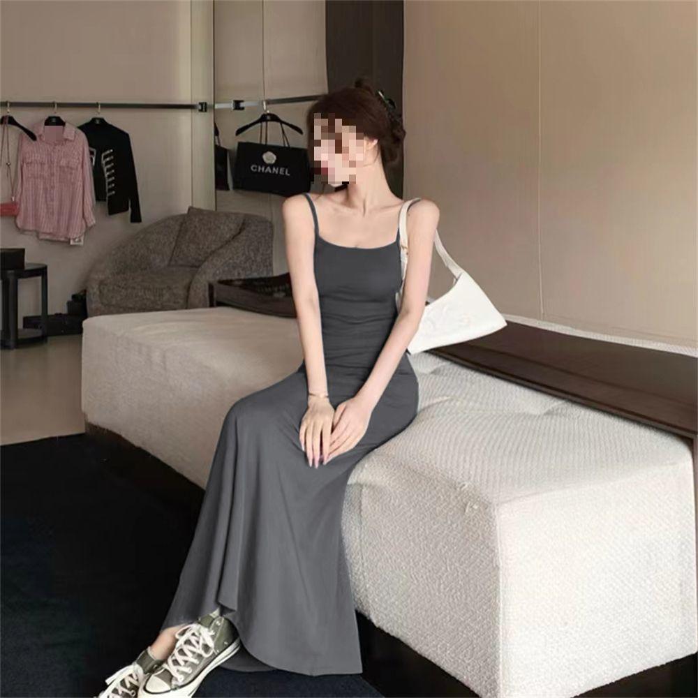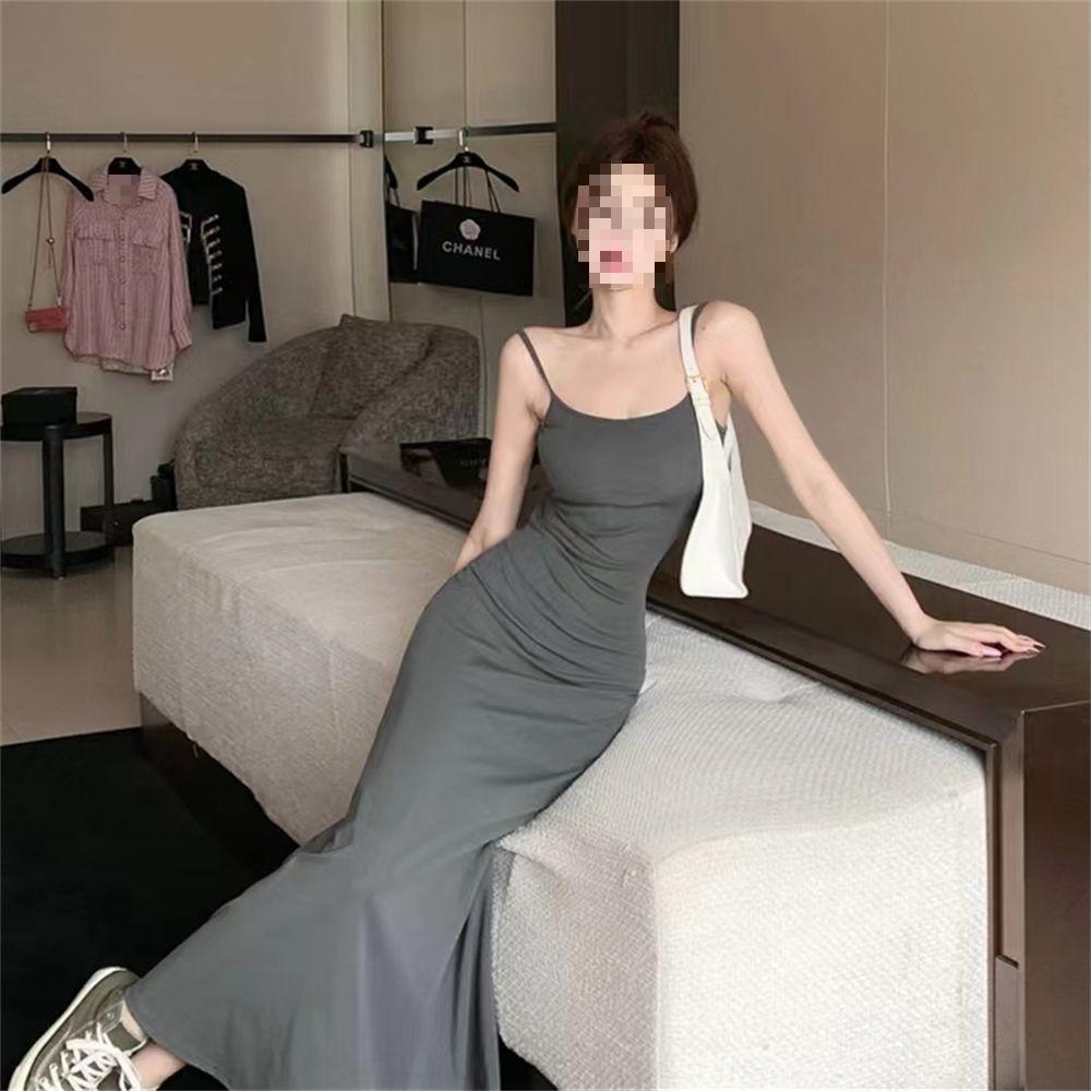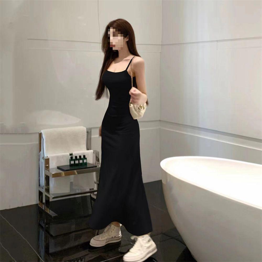 Vestido de Tirantes de Cintura Alta para Chica Sexy para Mujer Verano 2025 Nuevo Estilo Adelgazante de Cintura Hombro Descubierto Fondo Interior Falda Larga Sobre la Rodilla