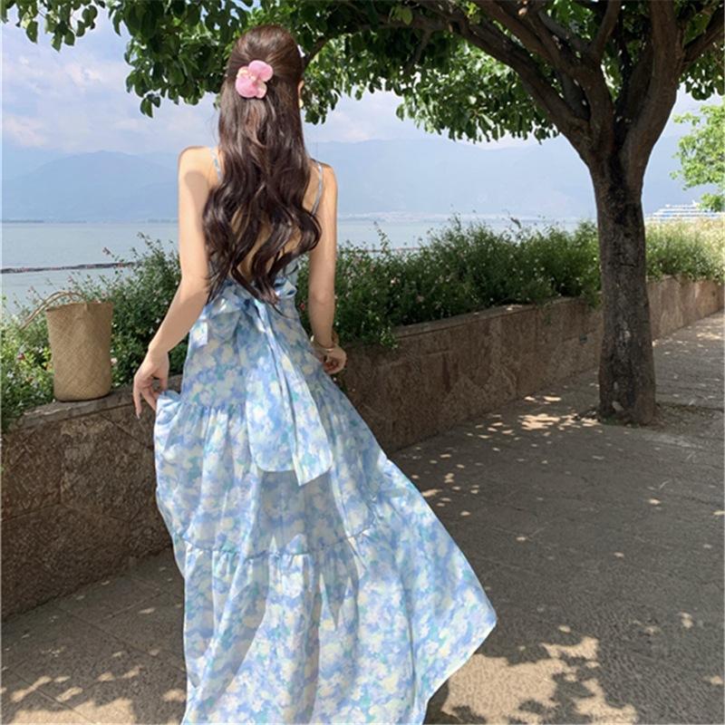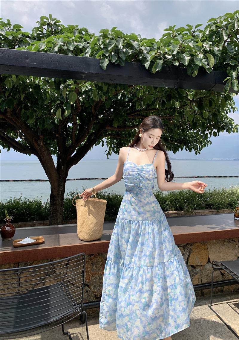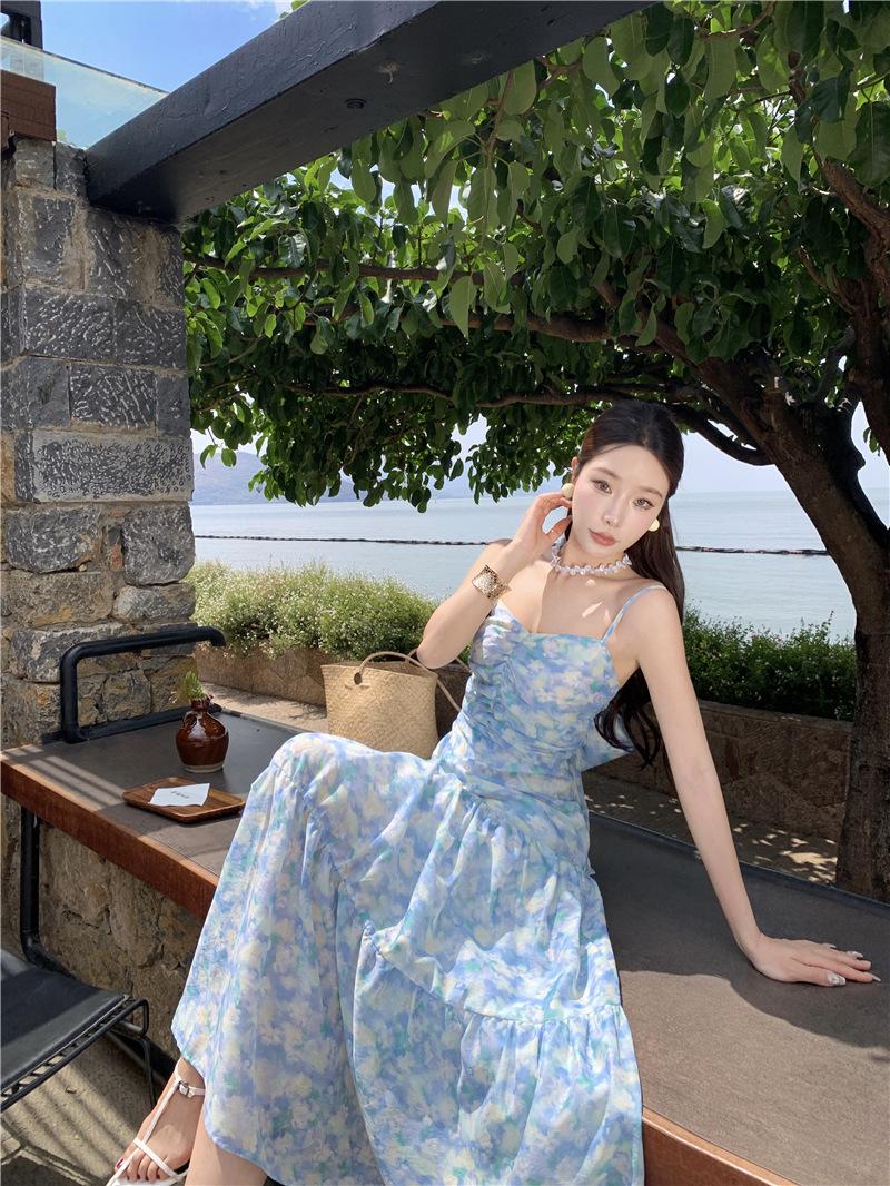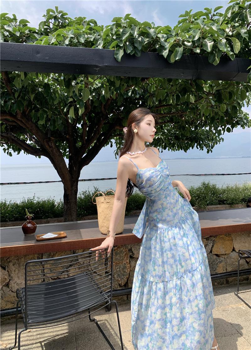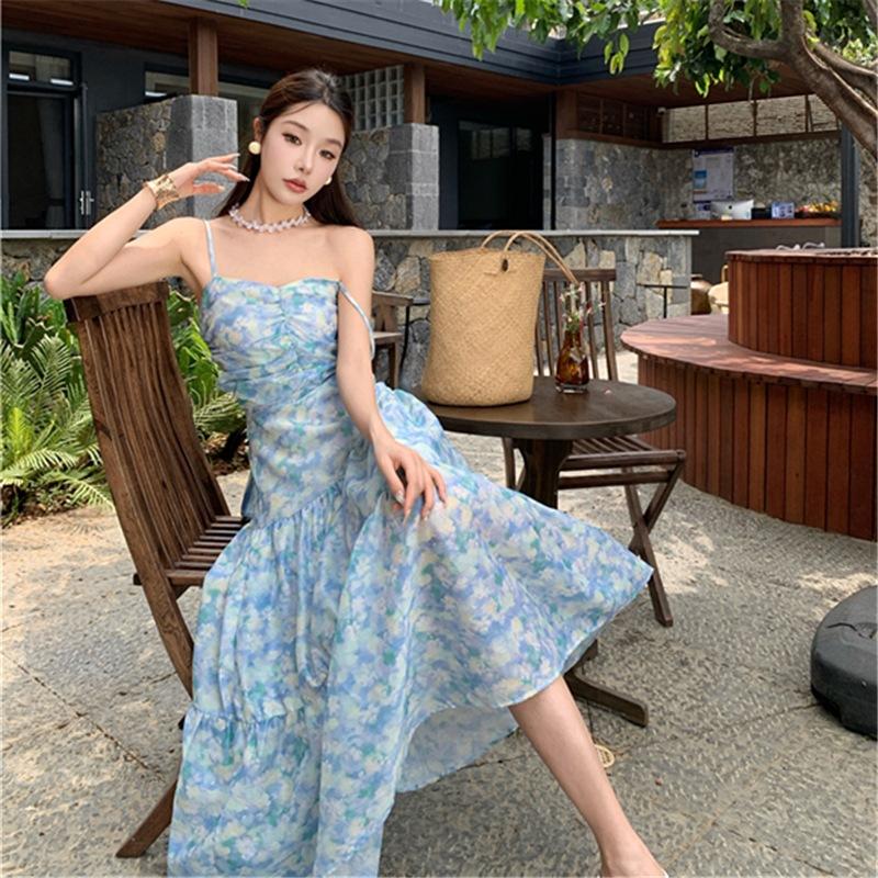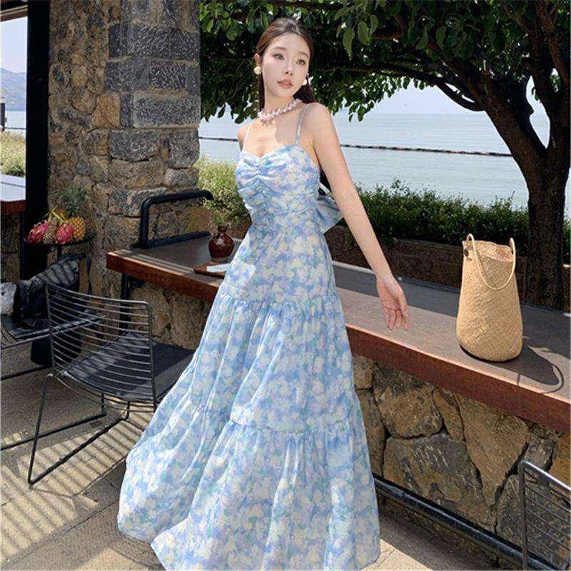 Fotografía de viajes junto al mar Vestido floral en forma de A con tirantes, primavera y verano, estilo vacaciones francés, falda larga con cintura adelgazante