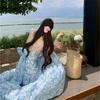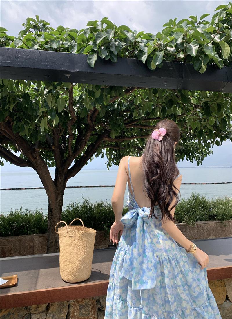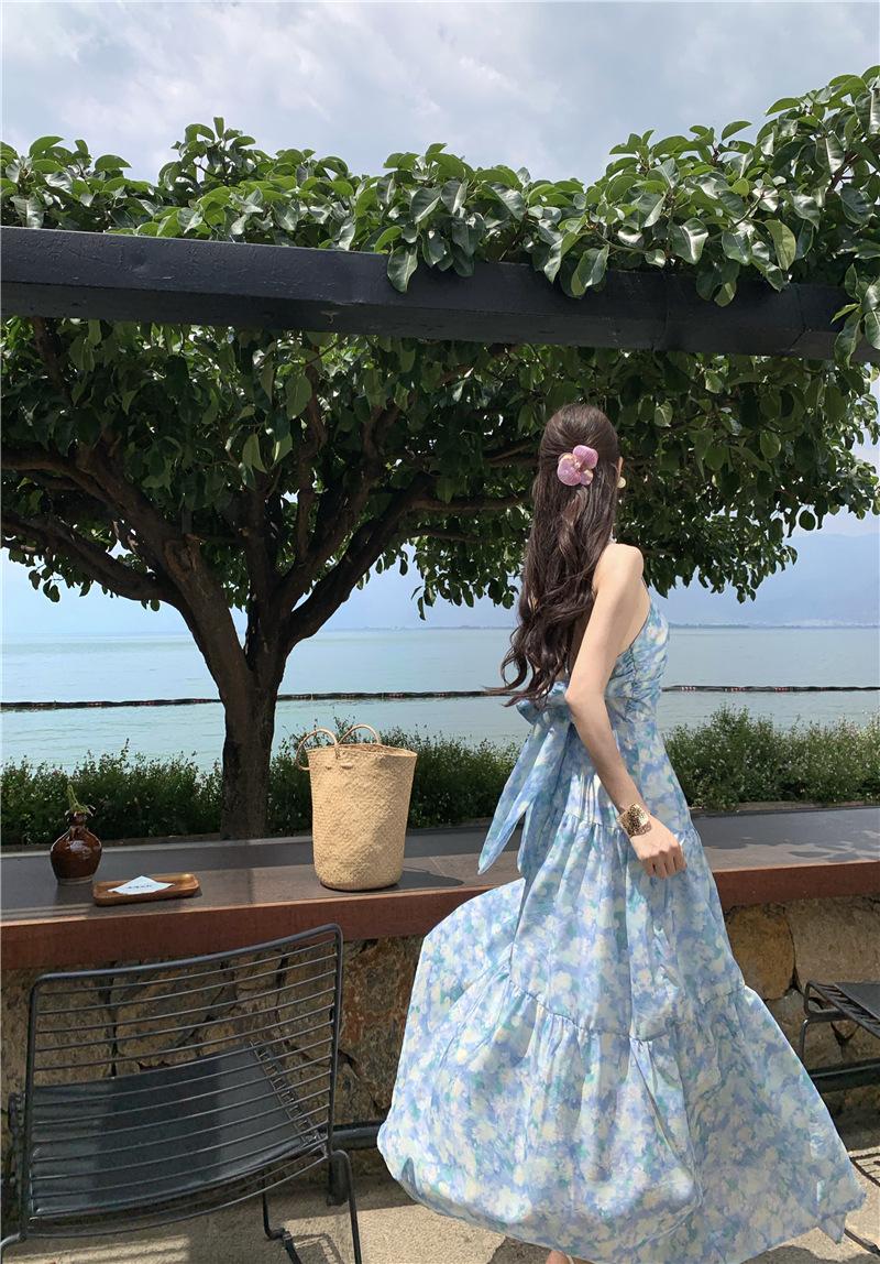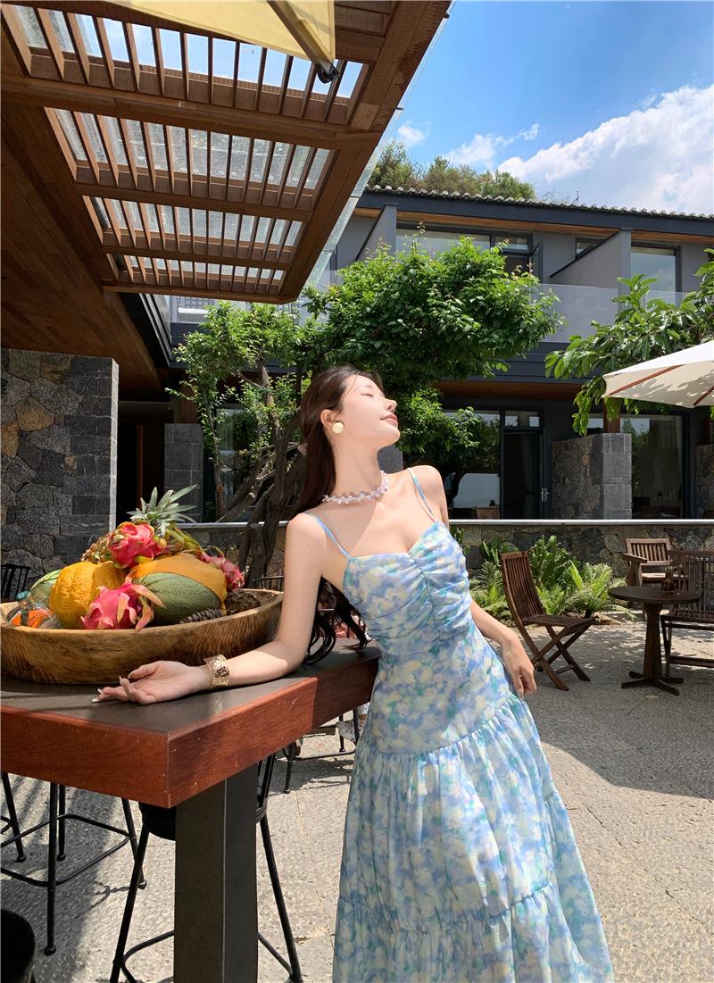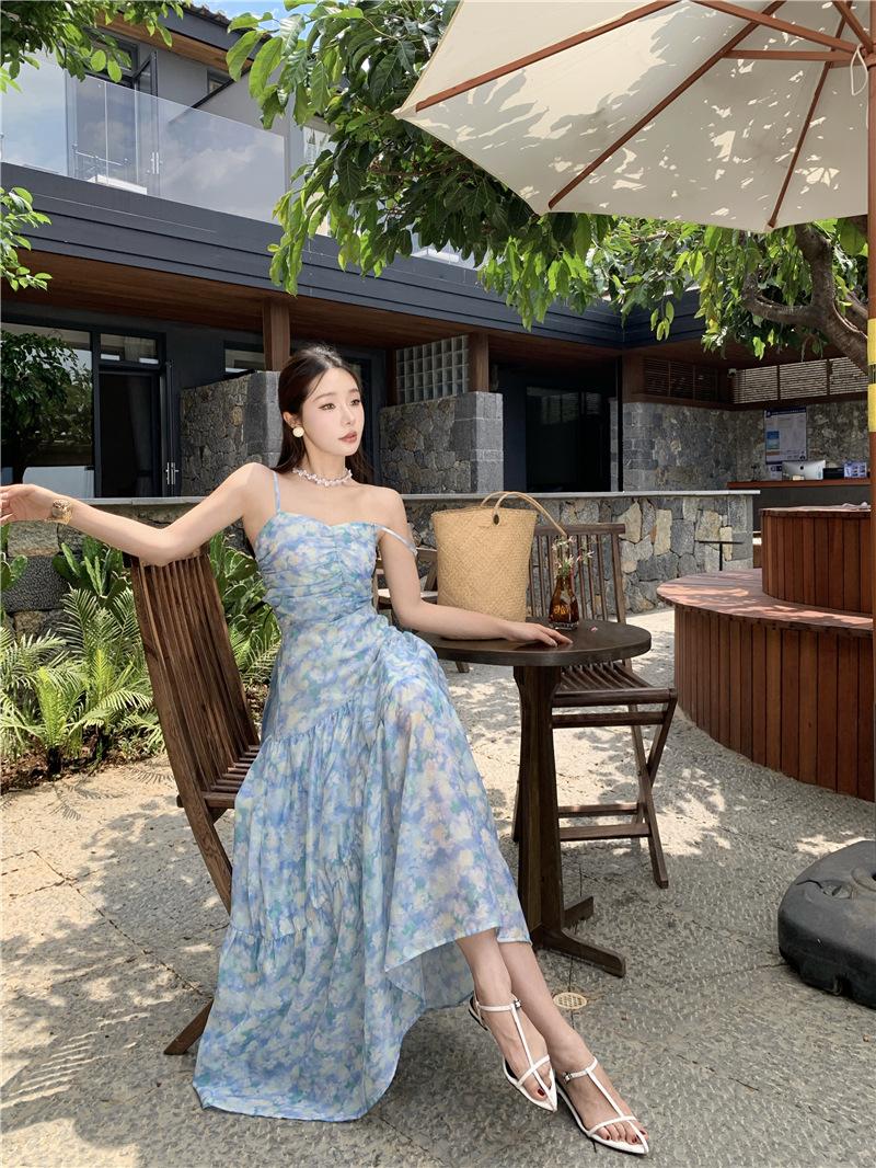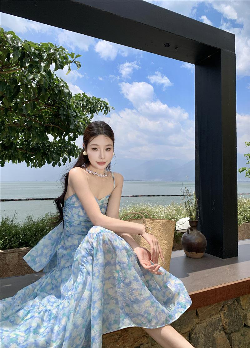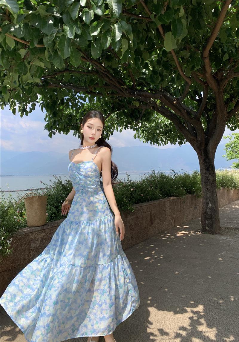 Fotografía de viajes junto al mar Vestido floral en forma de A con tirantes, primavera y verano, estilo vacaciones francés, falda larga con cintura adelgazante