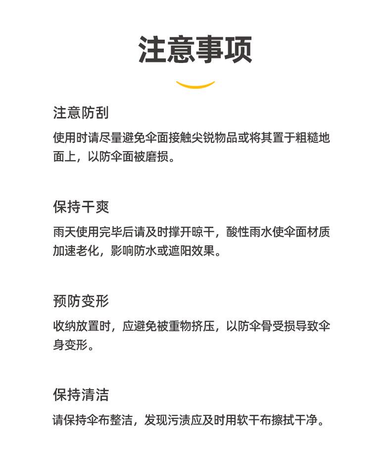 Los paraguas son artículos frágiles y presentan características especiales durante el envío. En ocasiones, pueden sufrir daños internos debido a una carga y descarga bruscas o a problemas de embalaje durante el envío exprés. Por lo tanto, se ruega a los compradores que inspeccionen la mercancía en persona al firmar la recepción. Si observan algún daño, presenten una reclamación de inmediato a la empresa de mensajería o contacten con el personal de atención al cliente. Se recomienda tomar fotos u obtener un certificado del repartidor. Si no se detectan daños tras firmar la recepción, la responsabilidad recaerá sobre la persona que firmó la recepción. Por favor, cooperen activamente para evitar molestias mutuas.