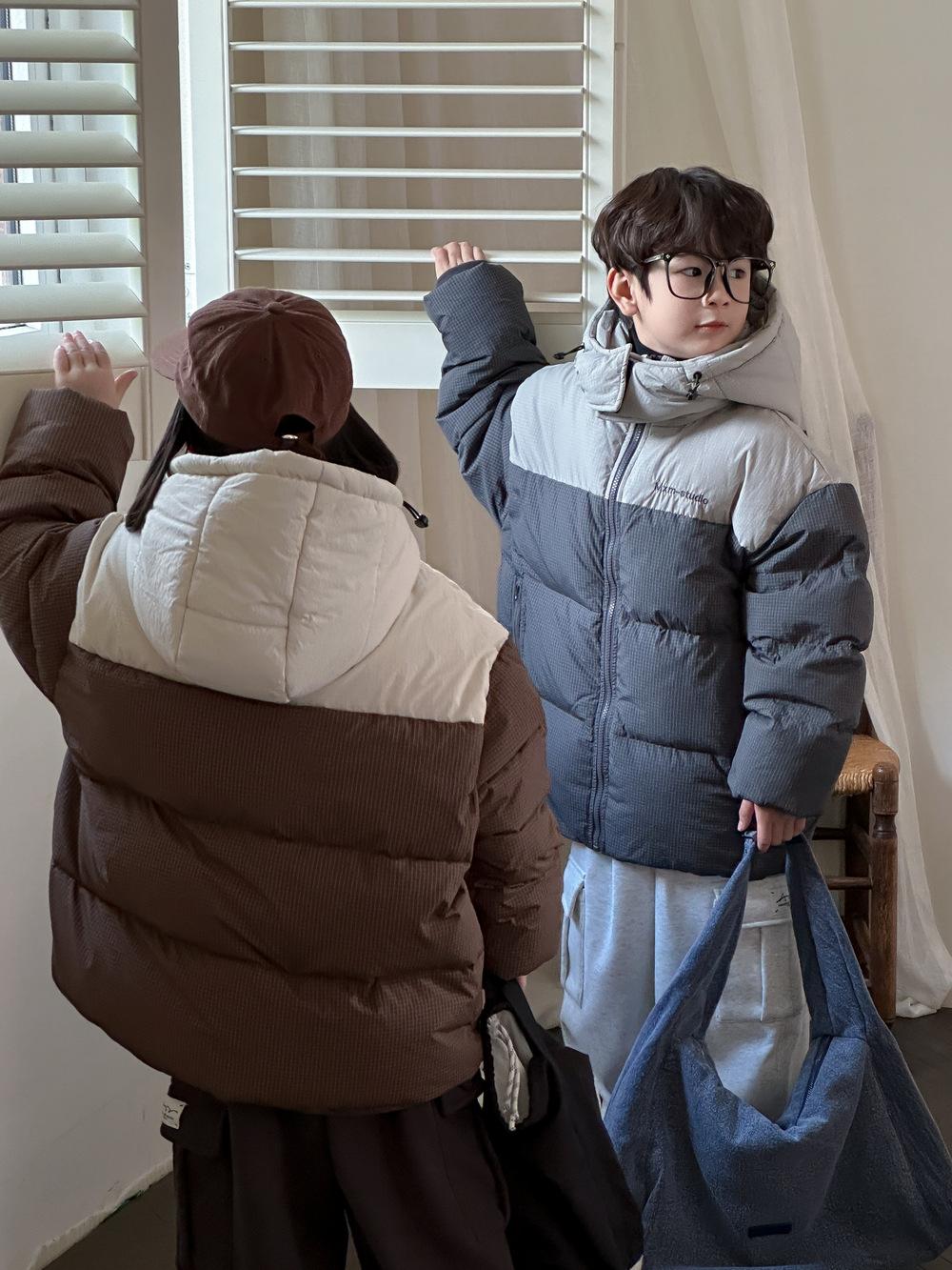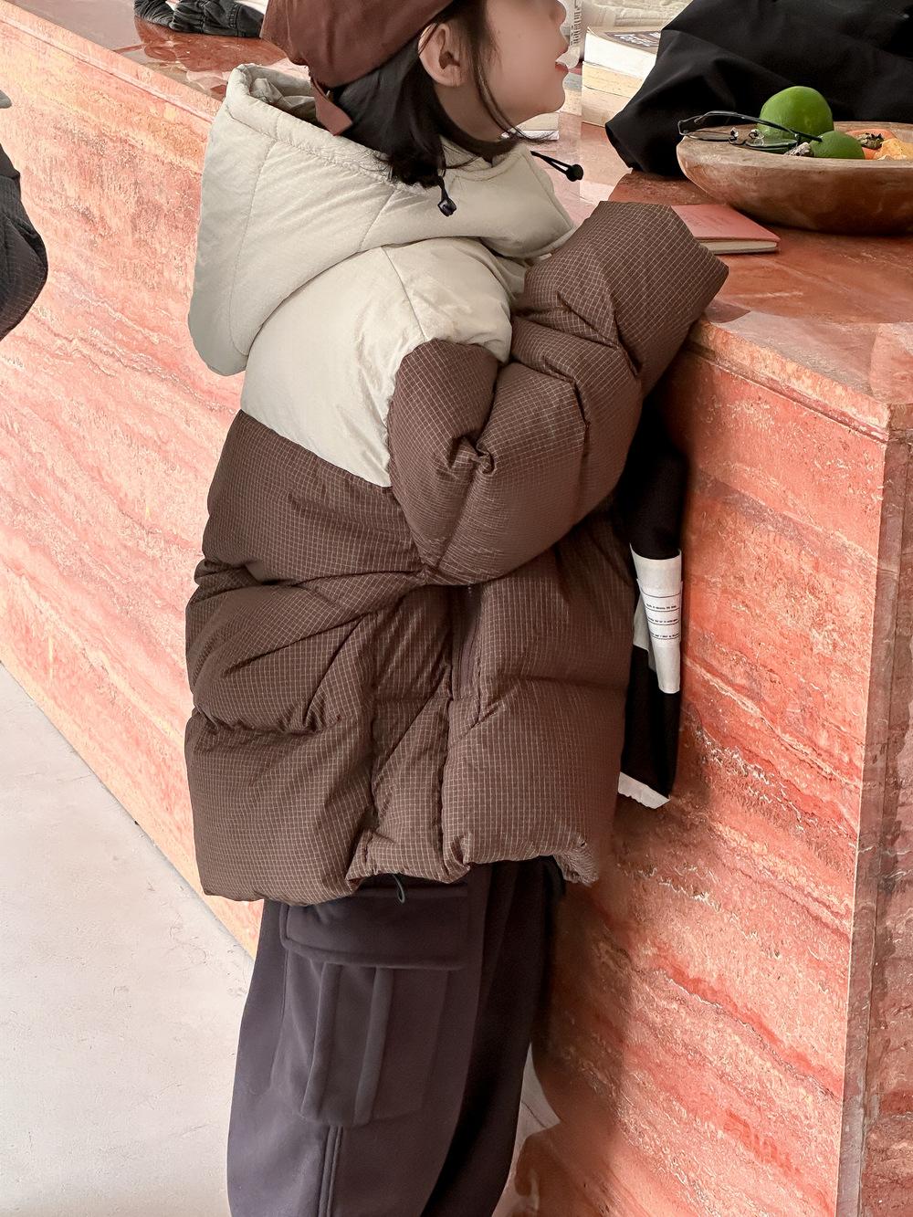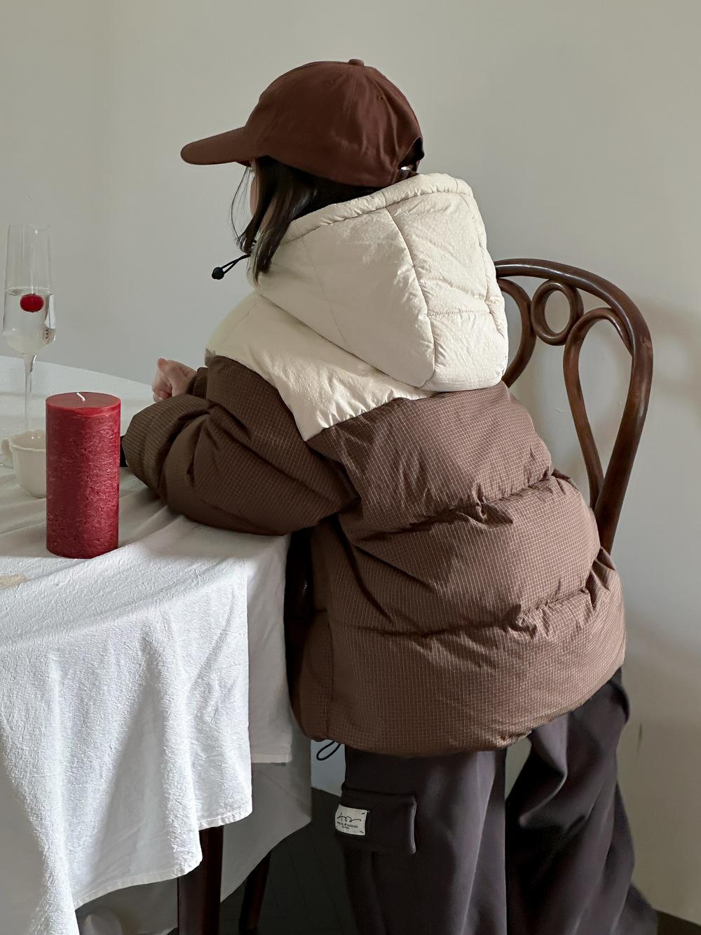 Hooded contrasting color down jacket apricot brown, Hooded contrasting down jacket gray blue