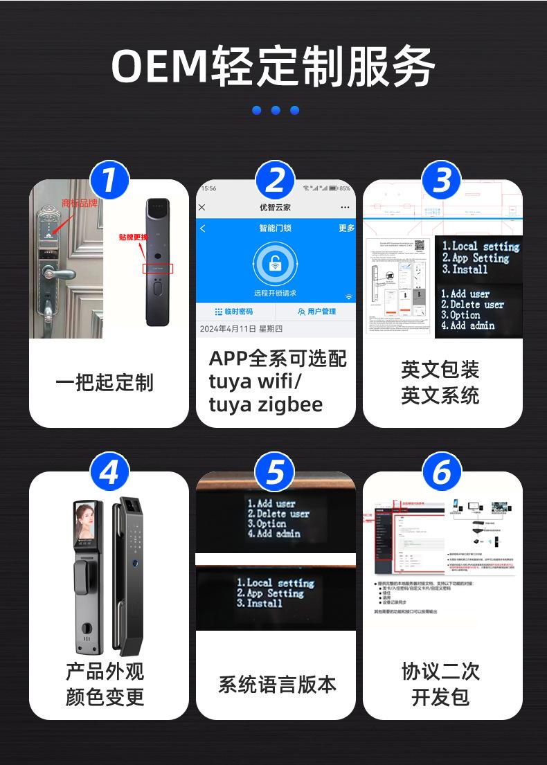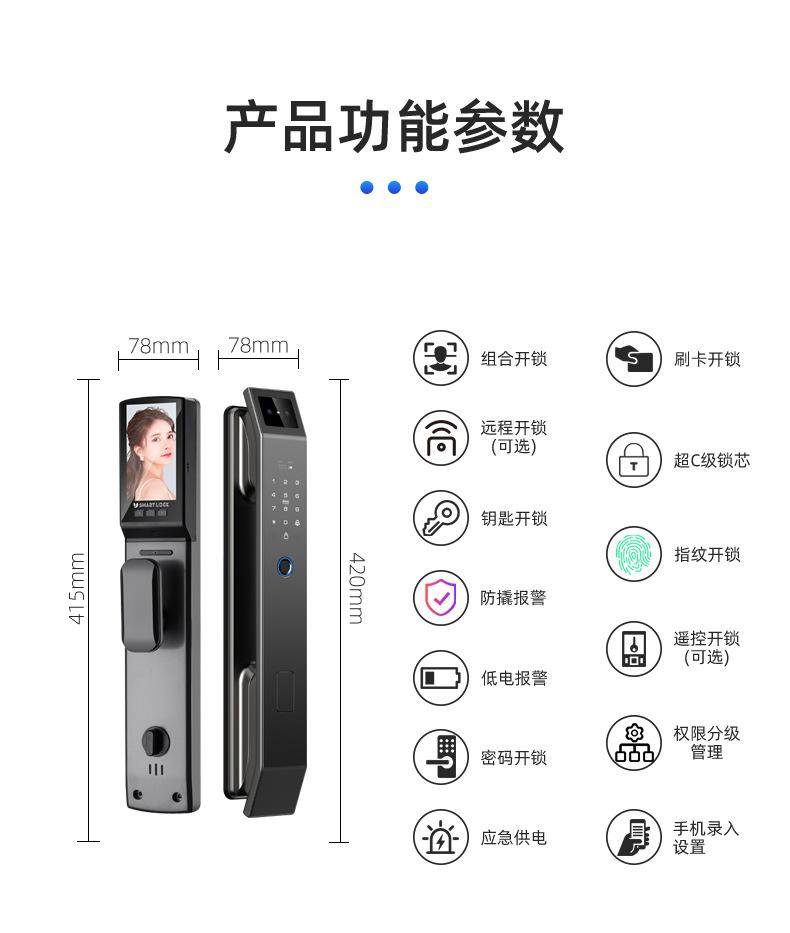 Fingerprint, Password, With key, Visual cat eye, Face recognition, Remote unlock