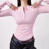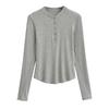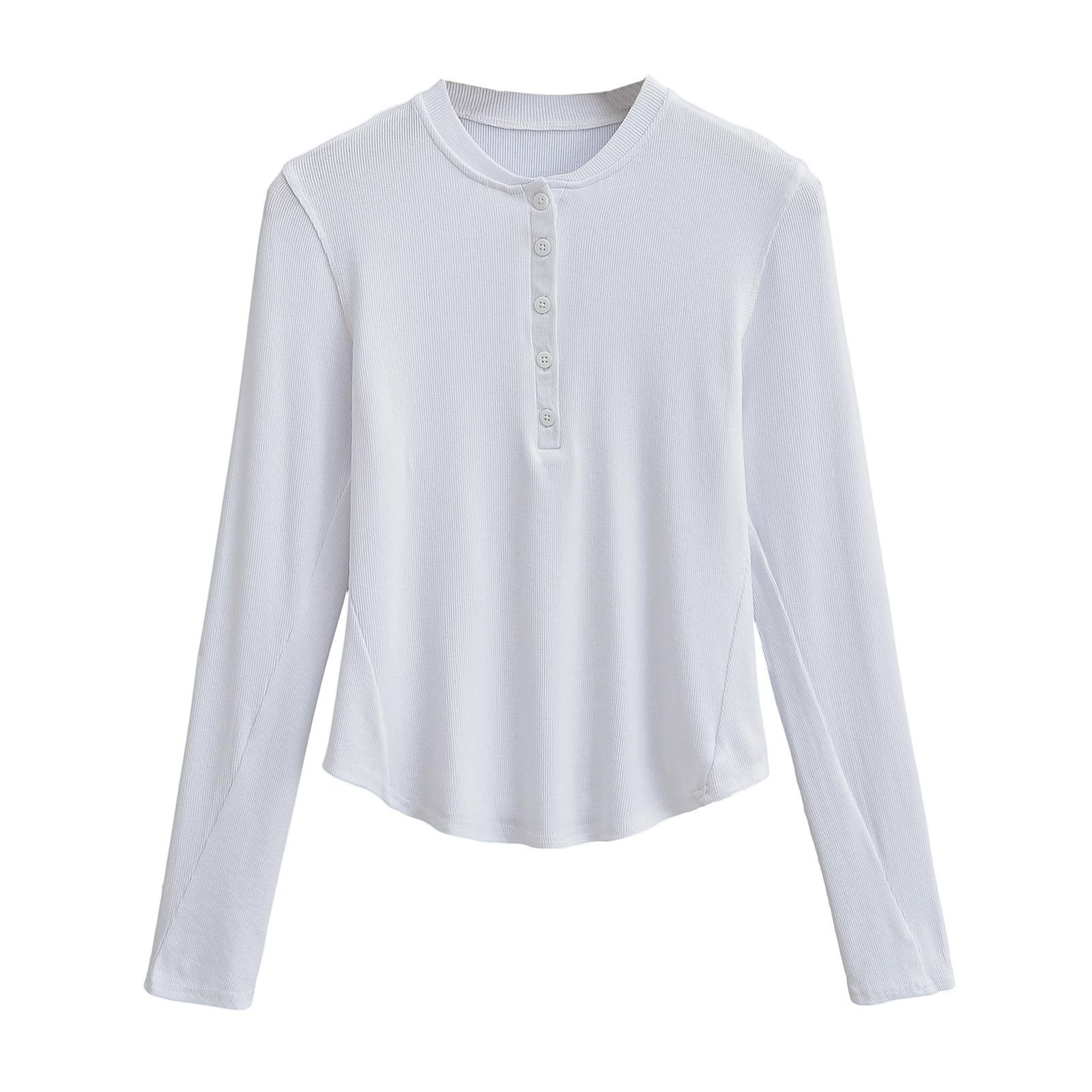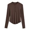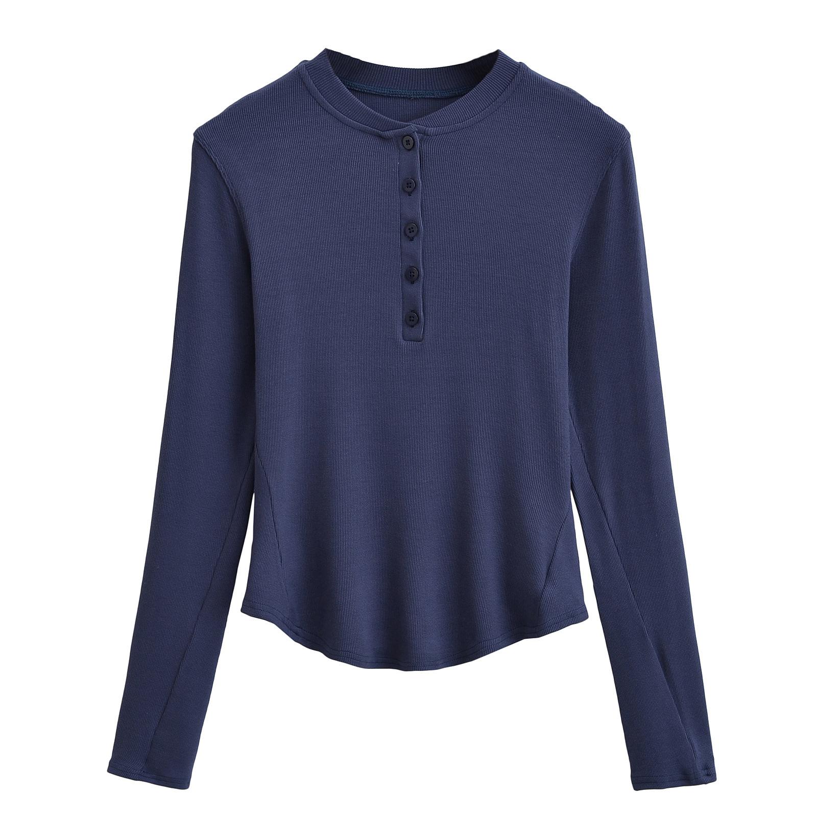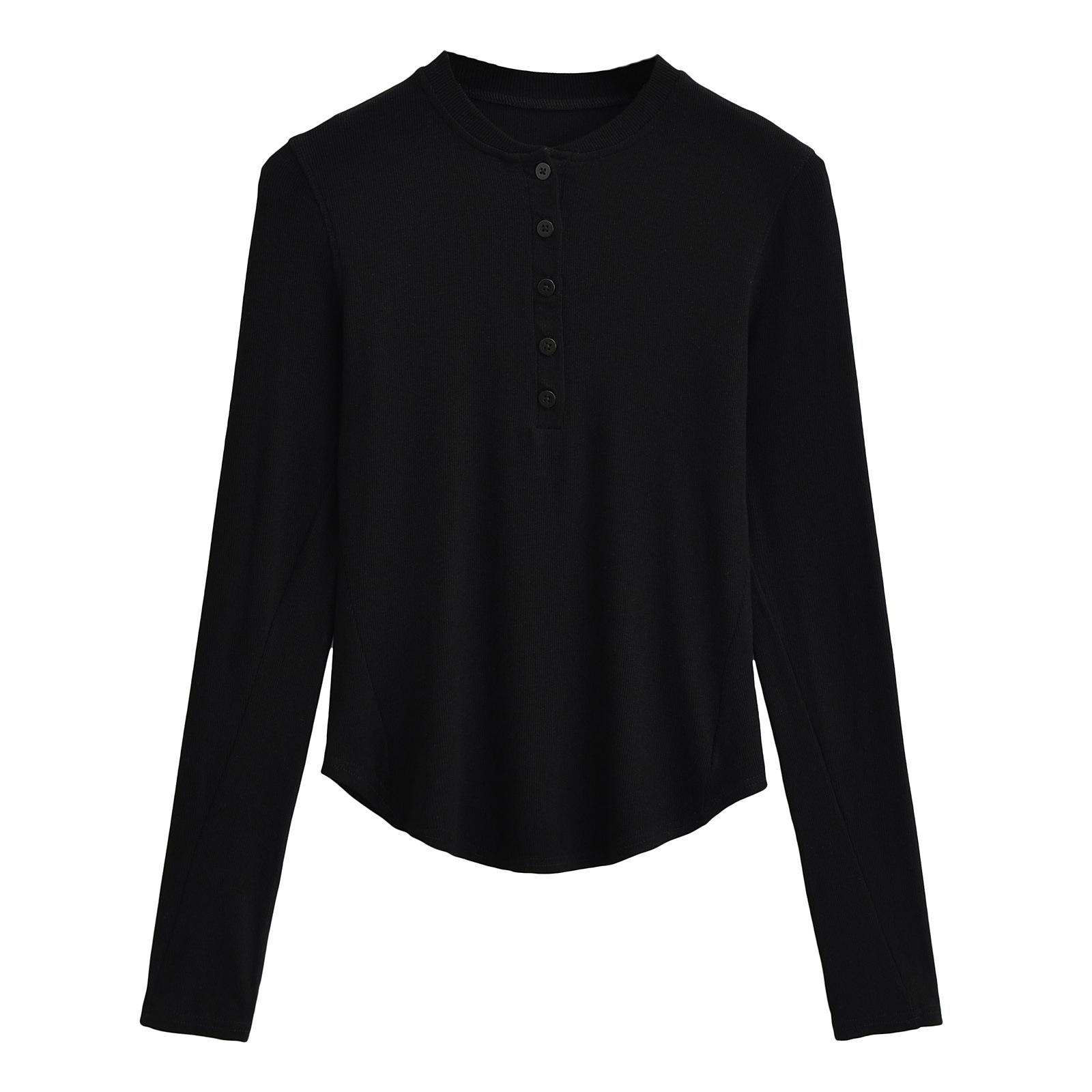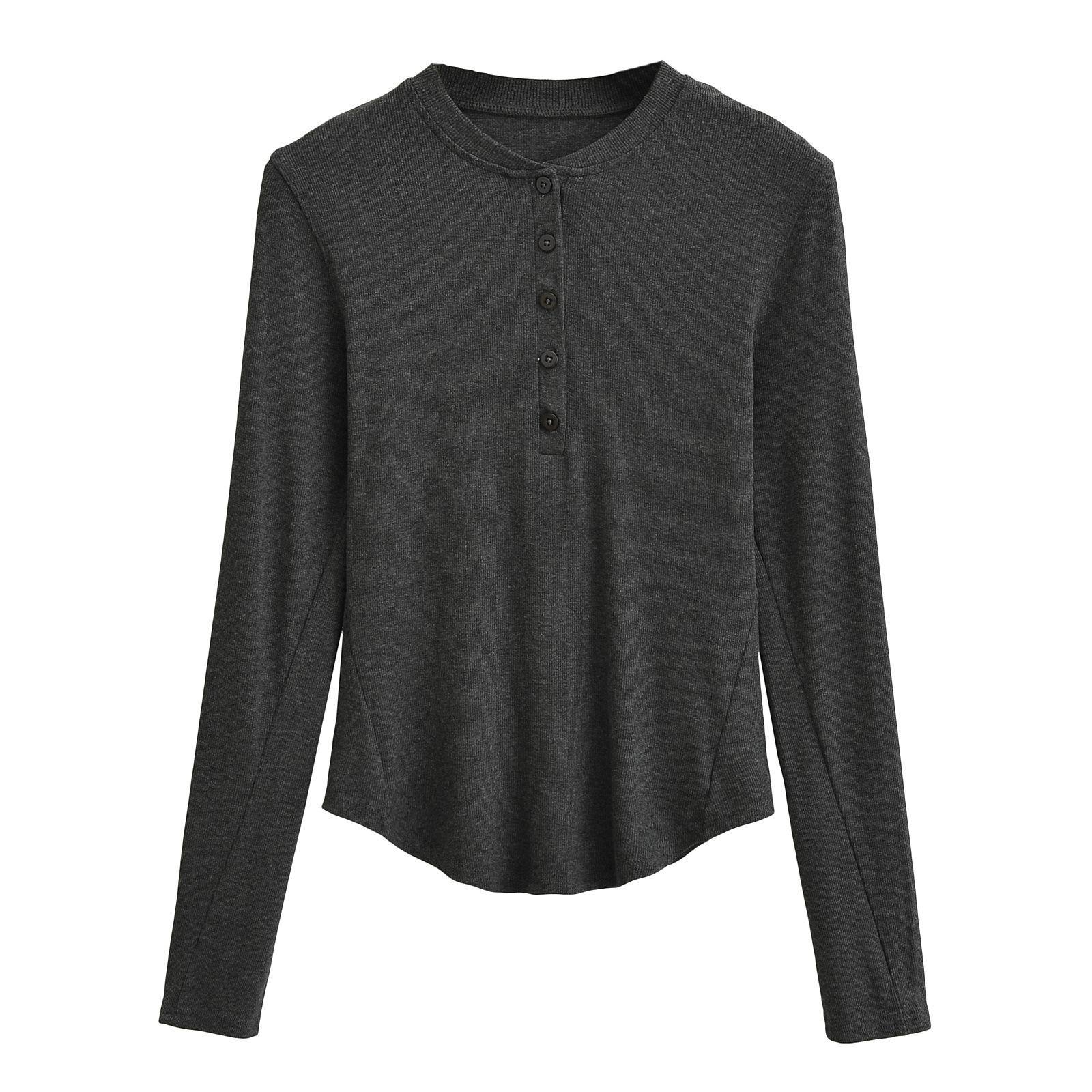 Playera de Manga Larga con Botones y Cuello Redondo de Color Sólido para Mujer Primavera y Otoño Nueva Ajuste Slim Asimétrica Camiseta Básica con Top Corto Interior