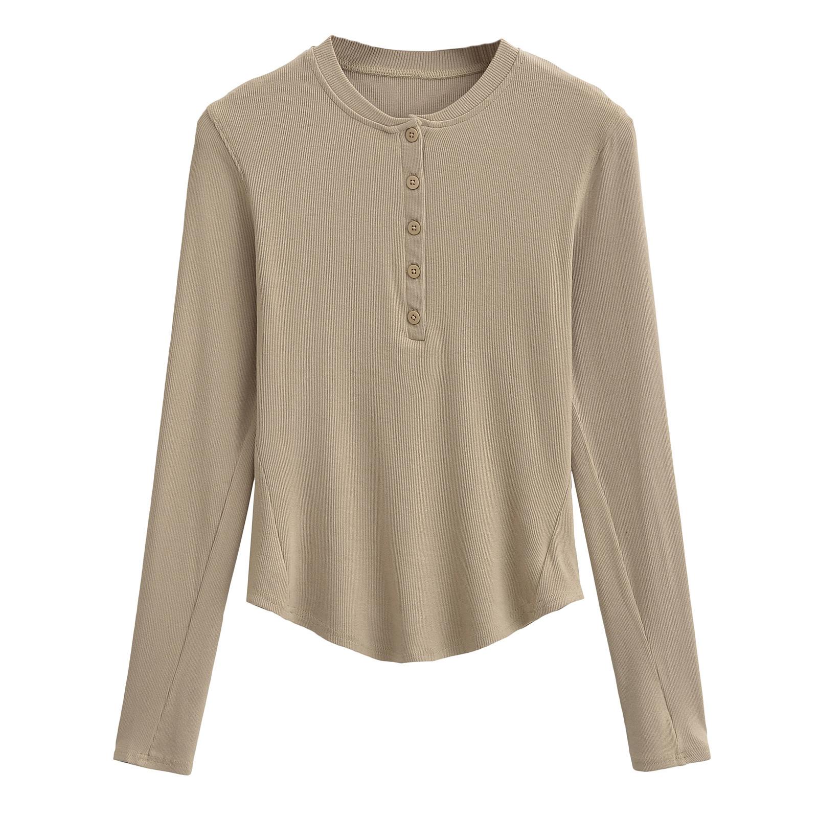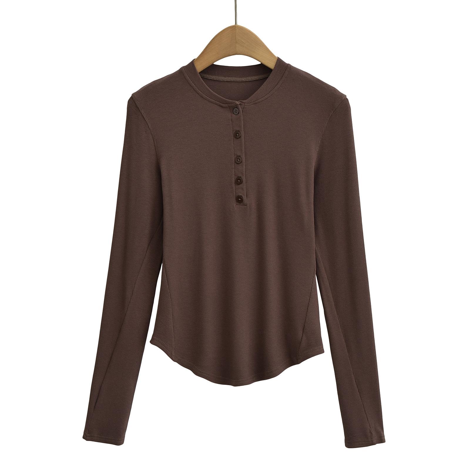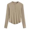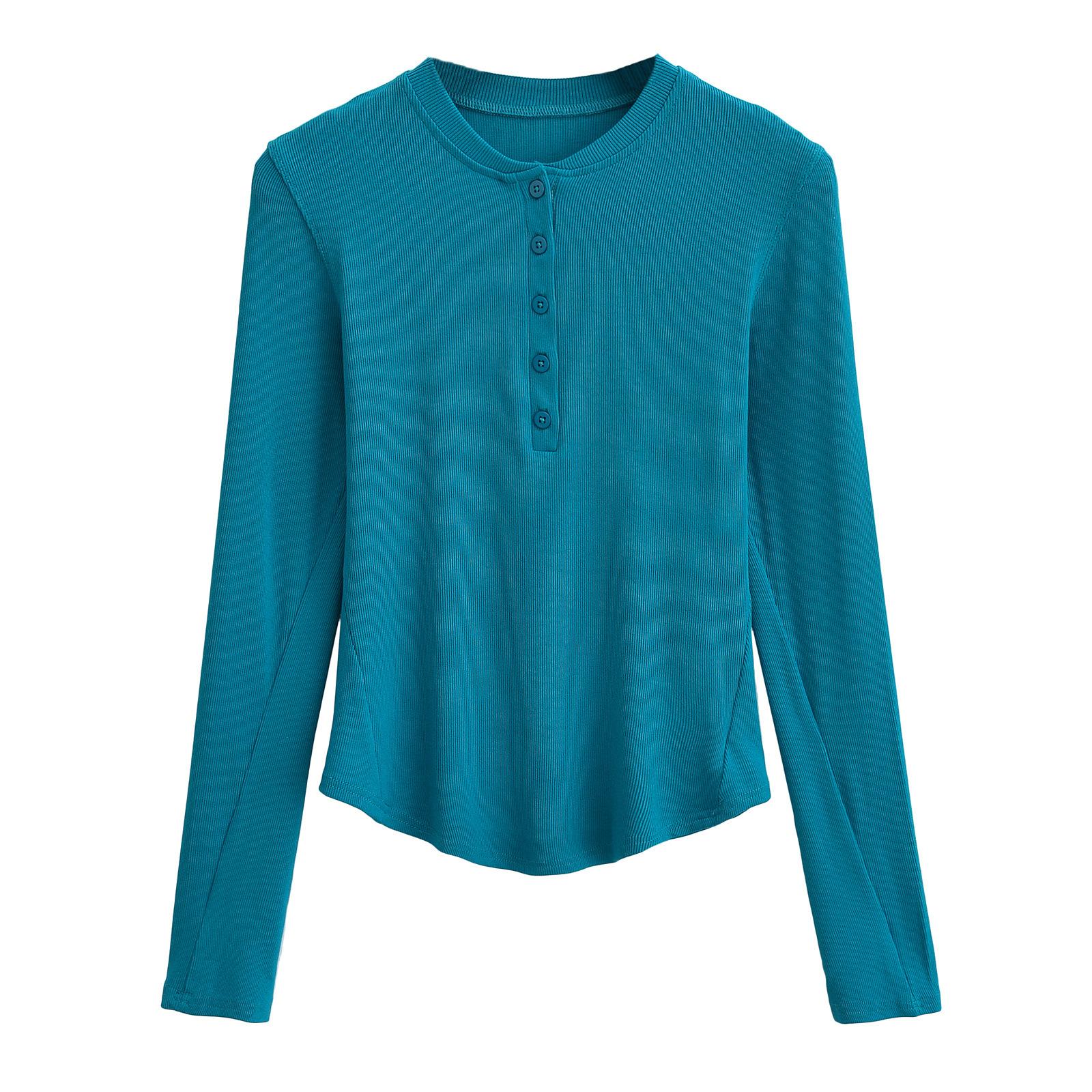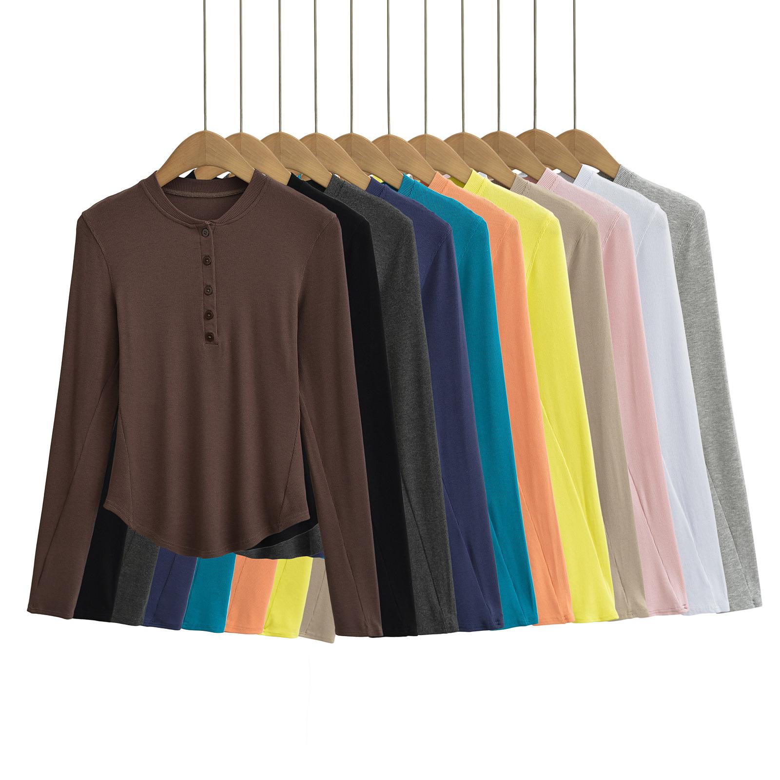 Playera de Manga Larga con Botones y Cuello Redondo de Color Sólido para Mujer Primavera y Otoño Nueva Ajuste Slim Asimétrica Camiseta Básica con Top Corto Interior